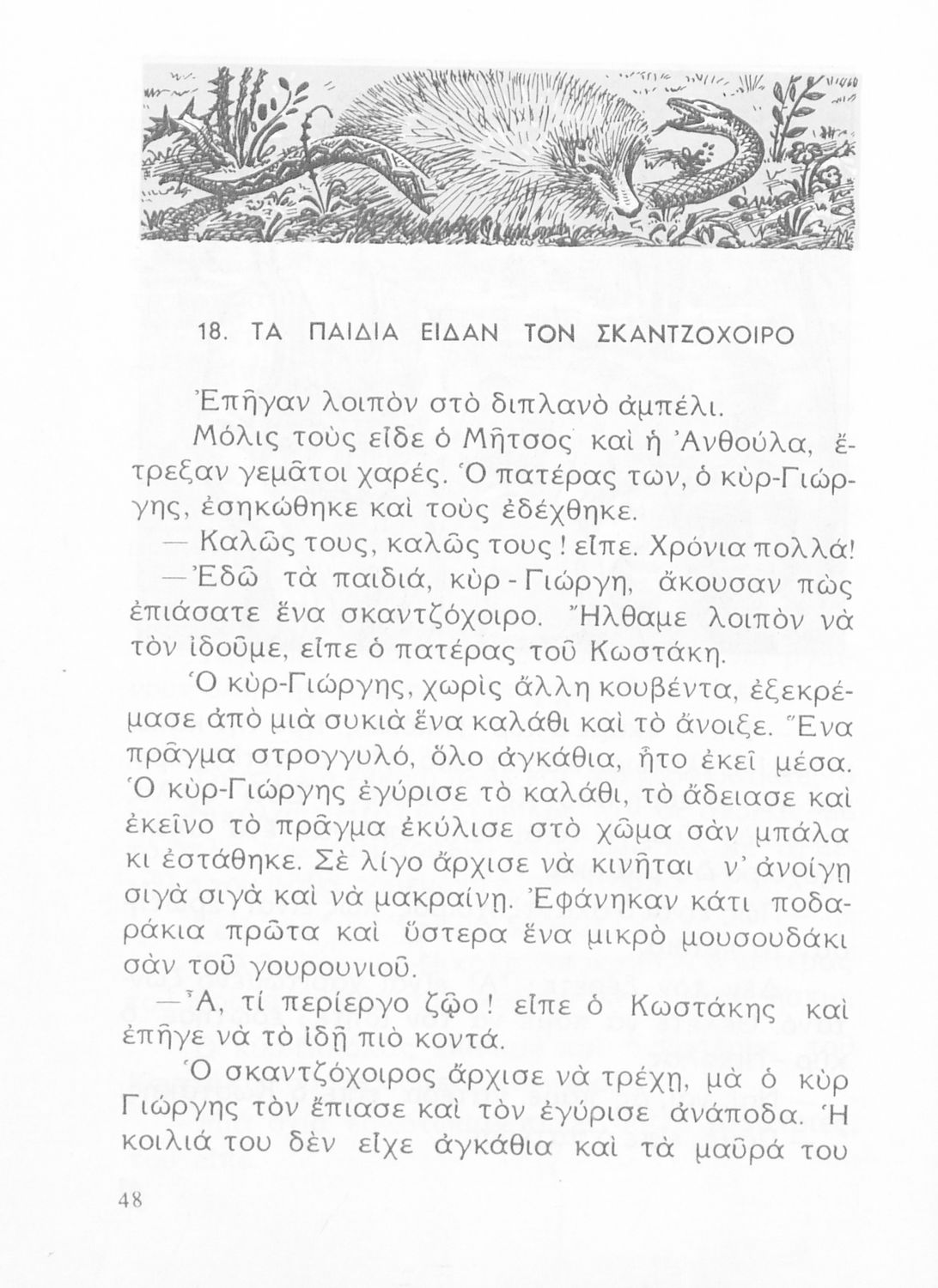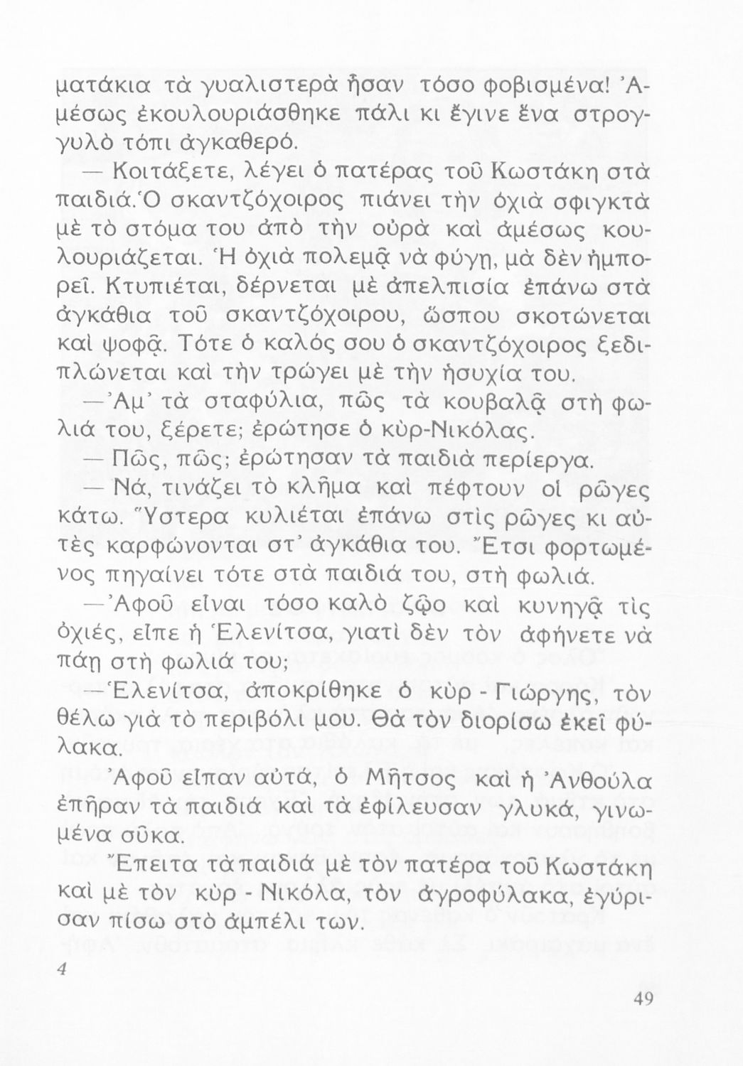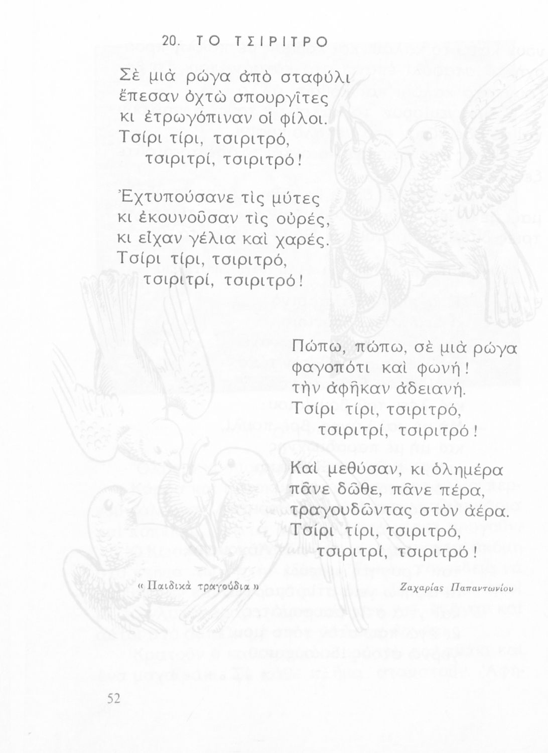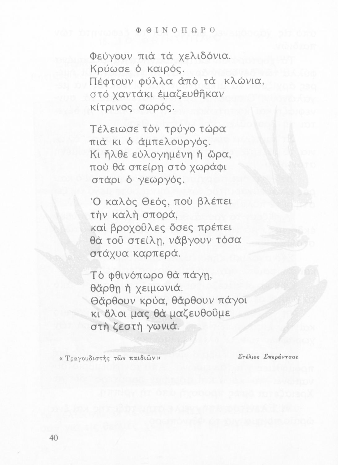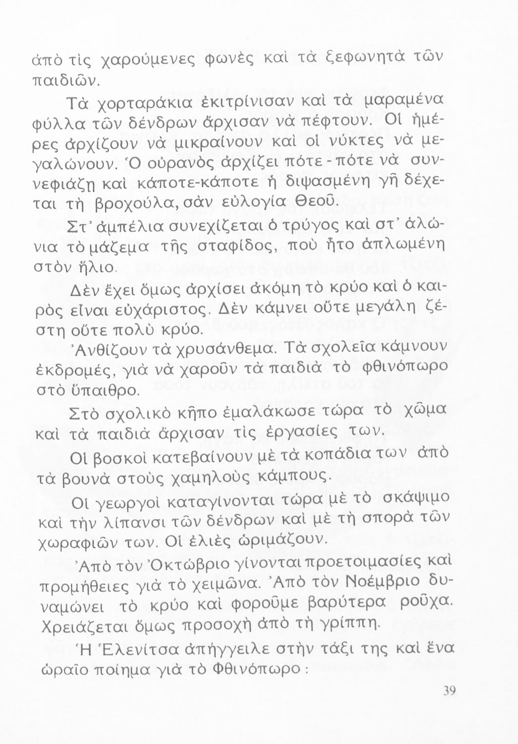 Αναγνωστικό Γ' Δημοτικού που είναι χωρισμένο σύμφωνα με τις εποχές του χρόνου και περιλαμβάνει ποιήματα και πεζά εμπνευσμένα από τη ζωή στην ύπαιθρο, την εθνική, οικογενειακή και κοινωνική ζωή, τη θρησκευτική παράδοση, τις ασχολίες των ανθρώπων, και την ελληνική φύση.