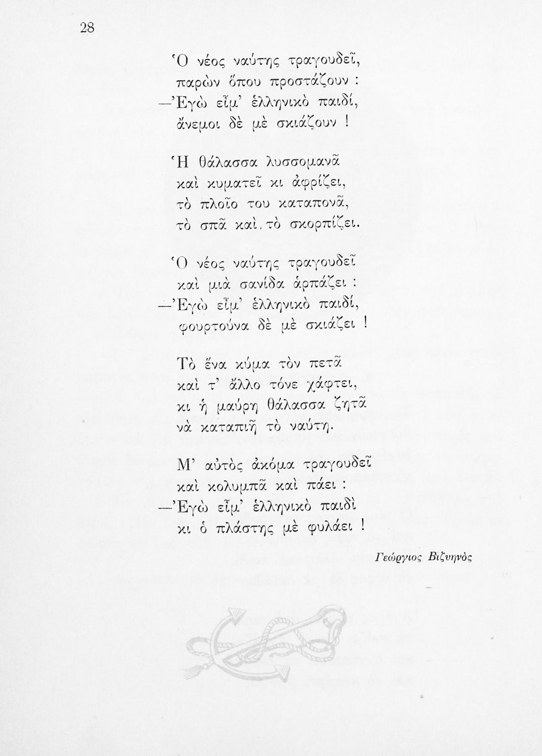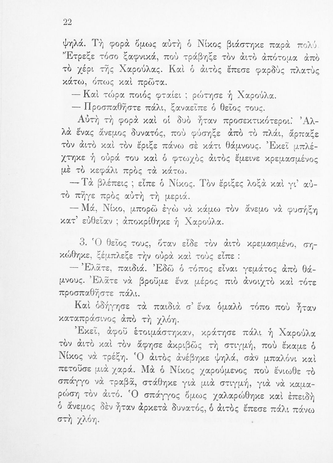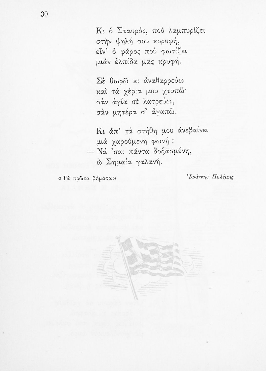 Αναγνωστικό για την Δ΄ τάξη του Δημοτικού. Περιλαμβάνει ένα κείμενο στο οποίο παρεμβάλλονται ποιήματα δημοτικά και Ελλήνων ποιητών.