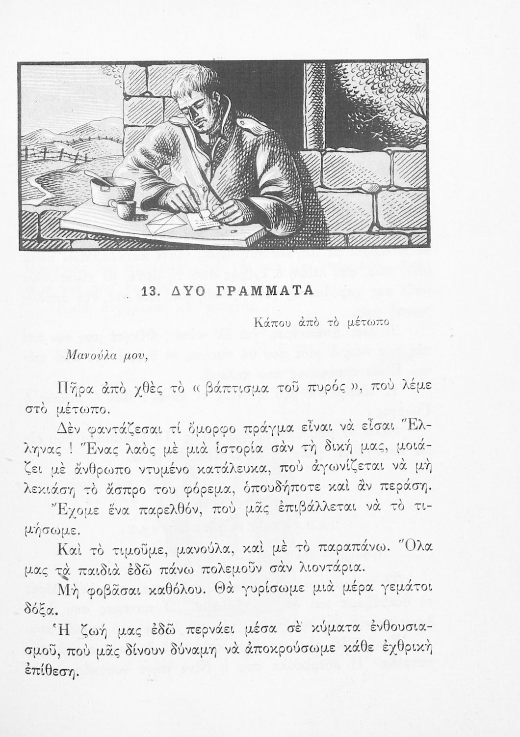 Αναγνωστικό Δ΄ Δημοτικού που περιέχει πεζά και ποιήματα με περιεχόμενο διδακτικό και ηθικοπλαστικό εμπνευσμένα από την ελληνική ιστορία και μυθολογία, και την αγροτική και κοινωνική ζωή.