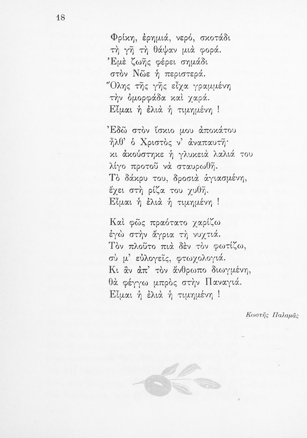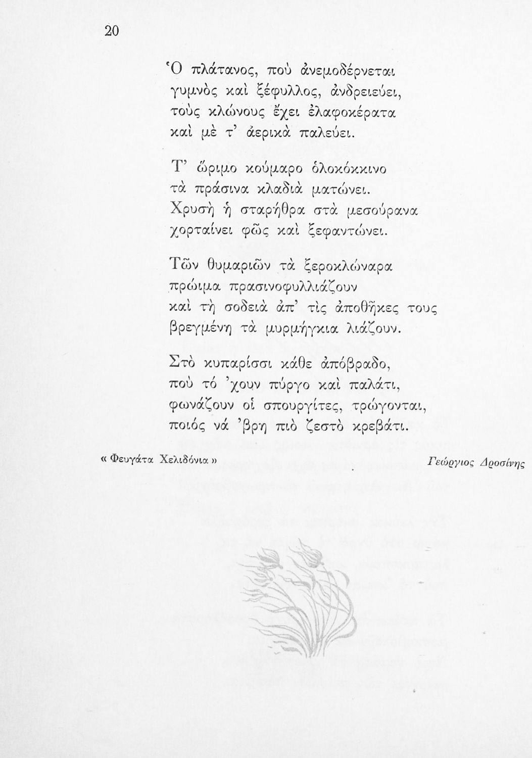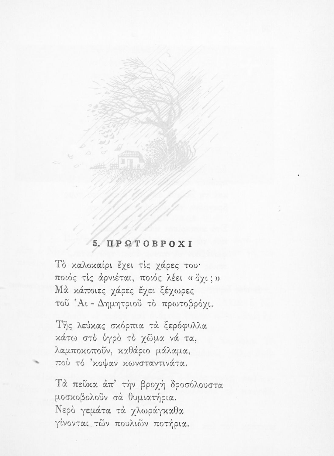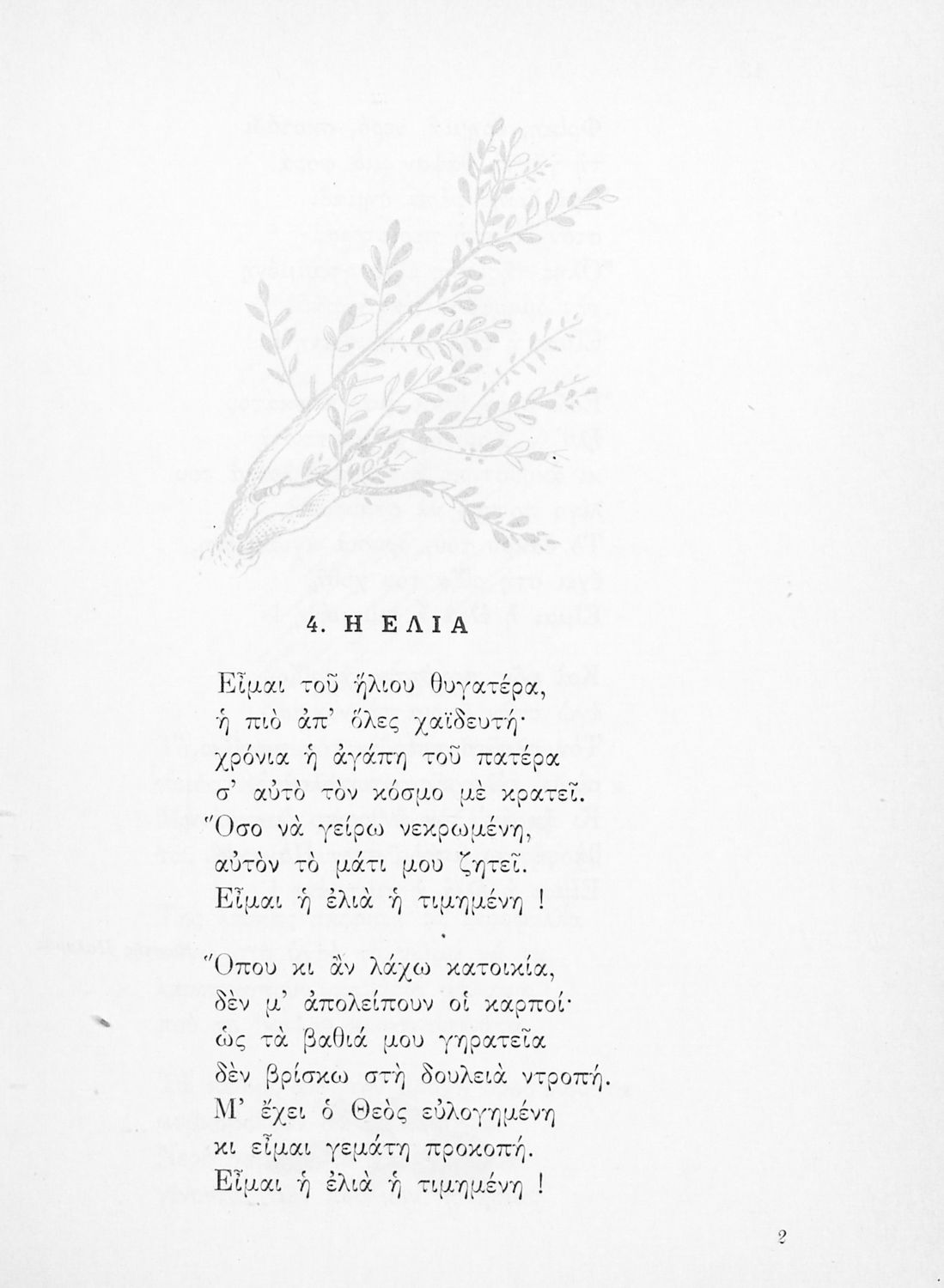 Αναγνωστικό για την Δ΄ τάξη του Δημοτικού. Περιλαμβάνει ένα κείμενο στο οποίο παρεμβάλλονται ποιήματα δημοτικά και Ελλήνων ποιητών.