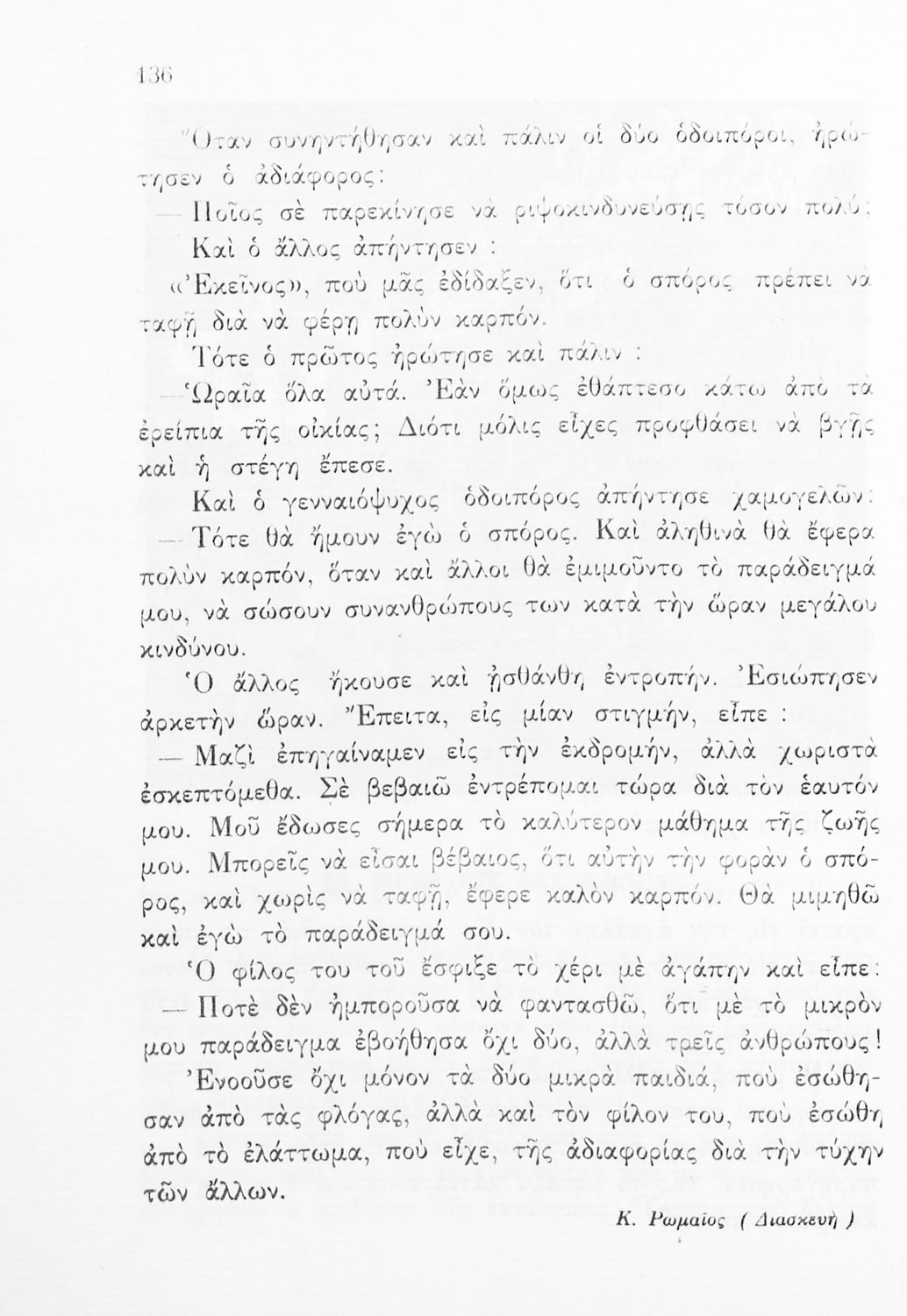 Αναγνωστικό Δ΄ Δημοτικού που περιέχει πεζά και ποιήματα με περιεχόμενο διδακτικό και ηθικοπλαστικό εμπνευσμένα από την ελληνική ιστορία και μυθολογία, και την αγροτική και κοινωνική ζωή.
