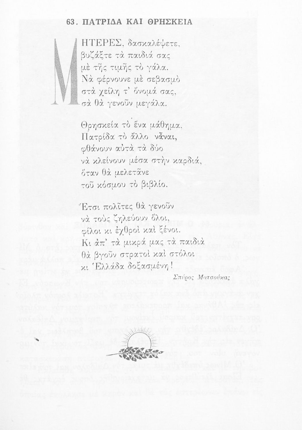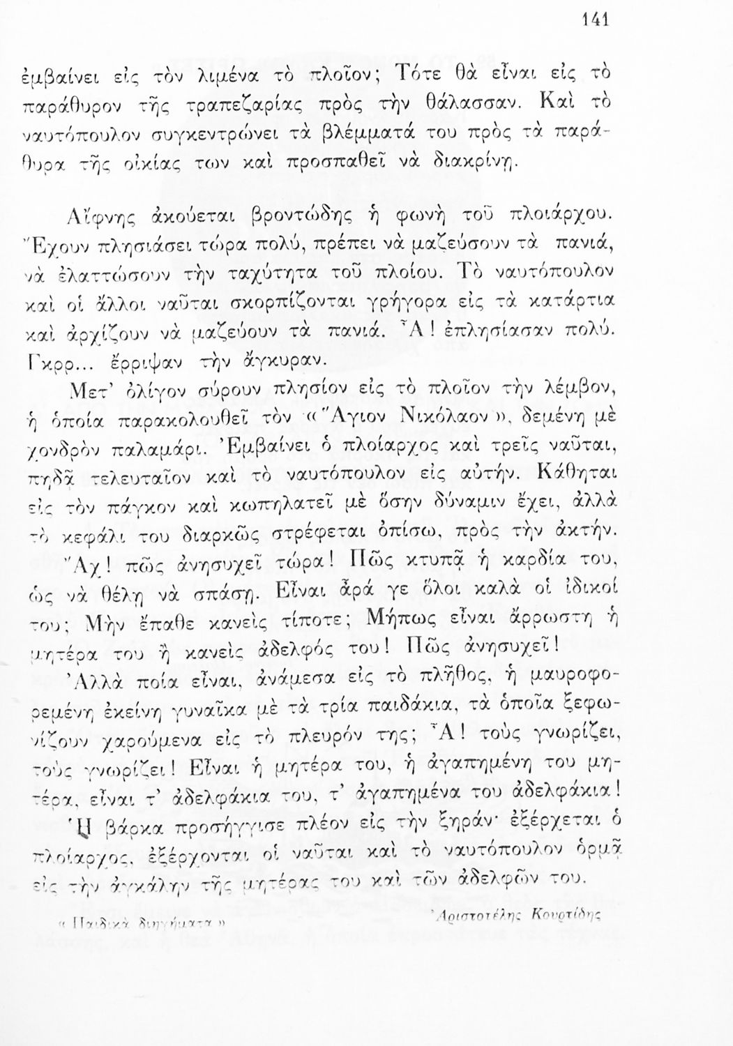 Αναγνωστικό Δ΄ Δημοτικού που περιέχει πεζά και ποιήματα με περιεχόμενο διδακτικό και ηθικοπλαστικό εμπνευσμένα από την ελληνική ιστορία και μυθολογία, και την αγροτική και κοινωνική ζωή.