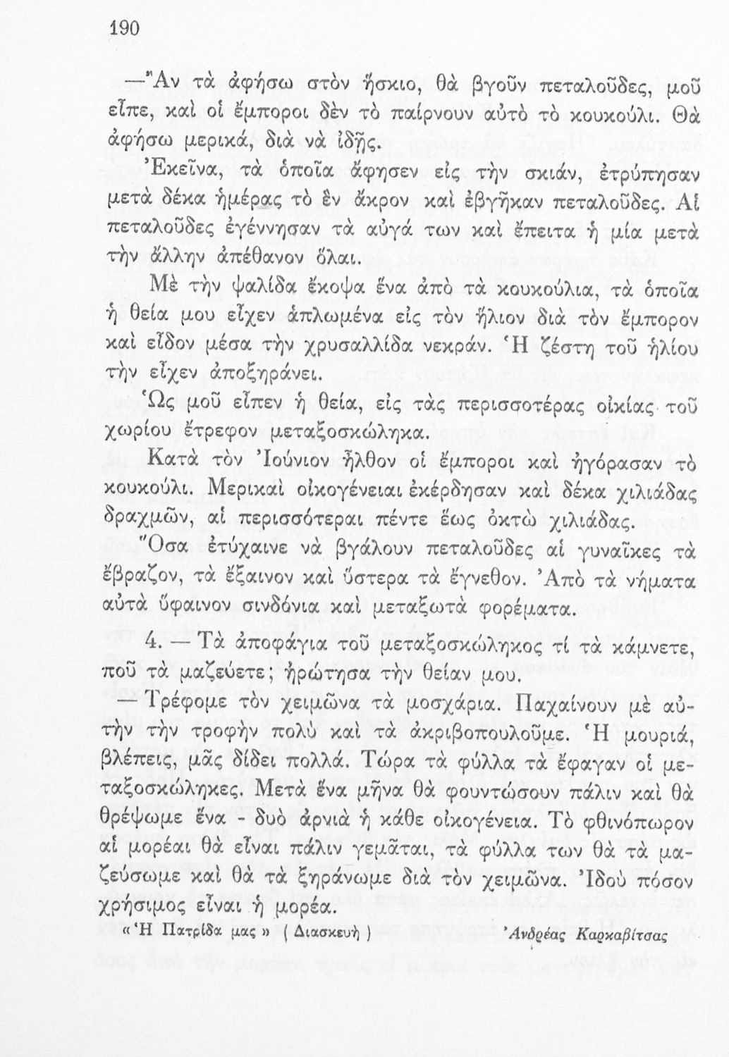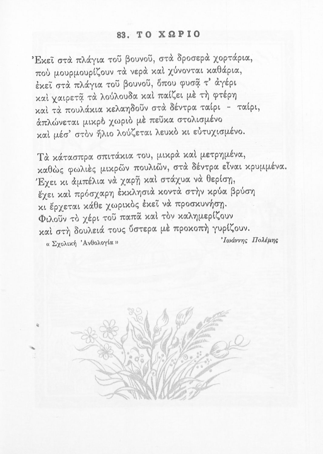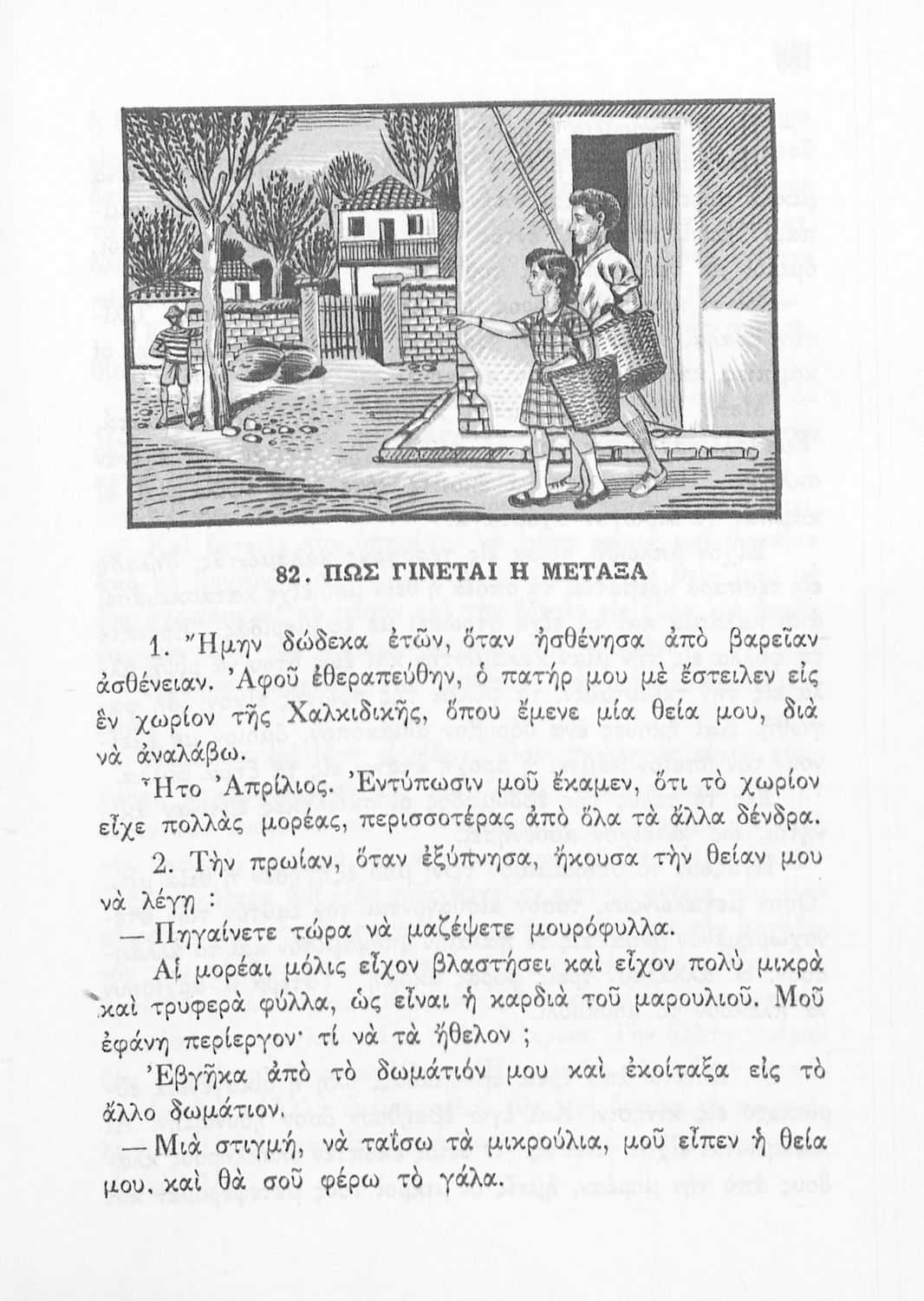 Αναγνωστικό Δ΄ Δημοτικού που περιέχει πεζά και ποιήματα με περιεχόμενο διδακτικό και ηθικοπλαστικό εμπνευσμένα από την ελληνική ιστορία και μυθολογία, και την αγροτική και κοινωνική ζωή.