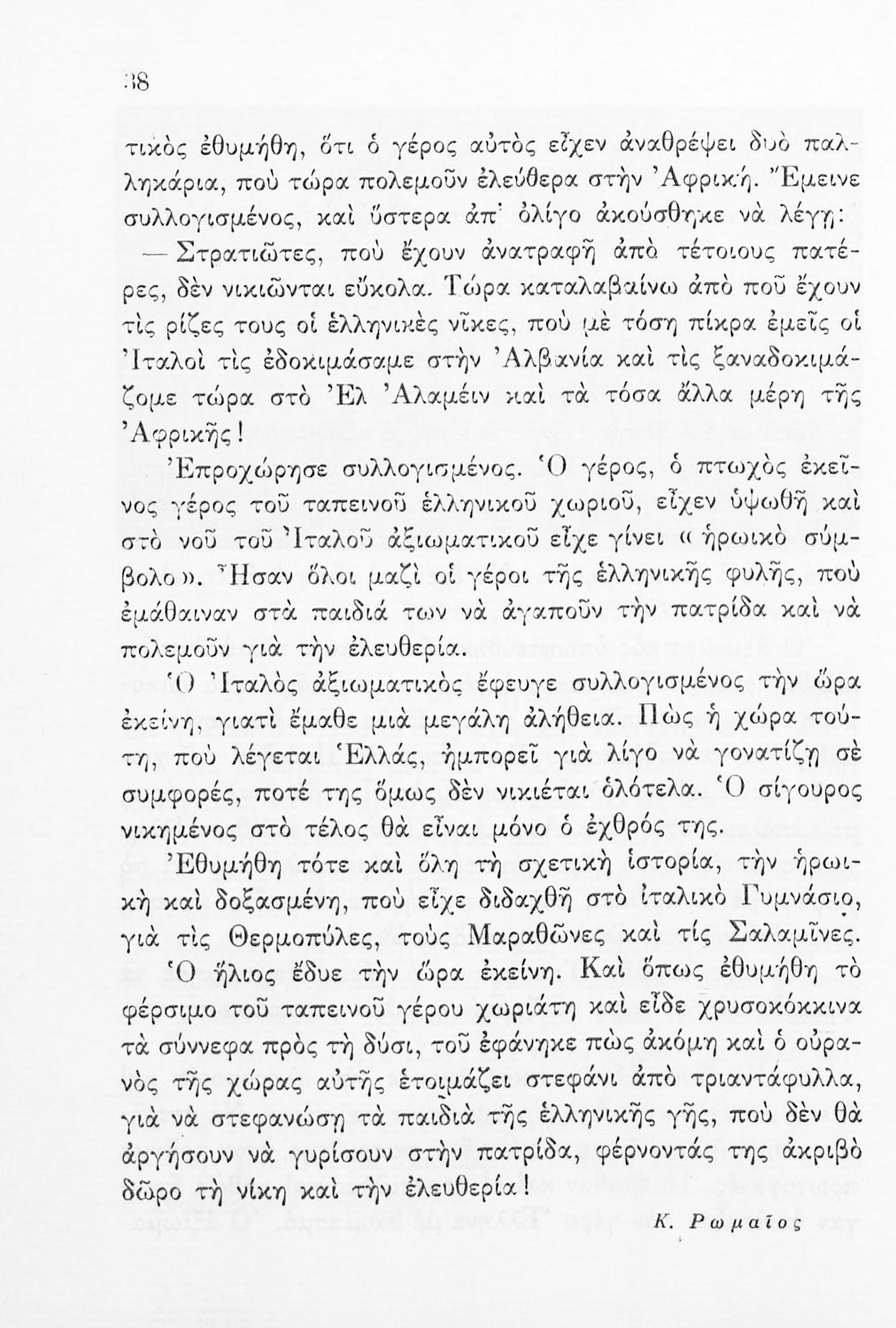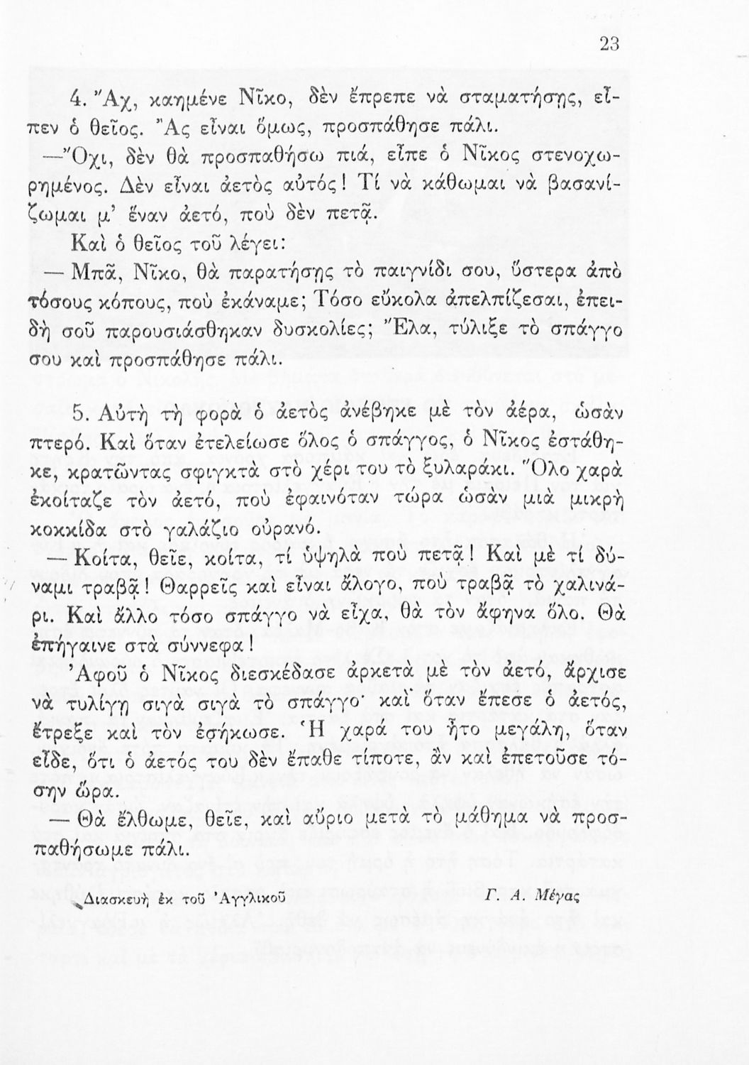 Αναγνωστικό Δ΄ Δημοτικού που περιέχει πεζά και ποιήματα με περιεχόμενο διδακτικό και ηθικοπλαστικό εμπνευσμένα από την ελληνική ιστορία και μυθολογία, και την αγροτική και κοινωνική ζωή.