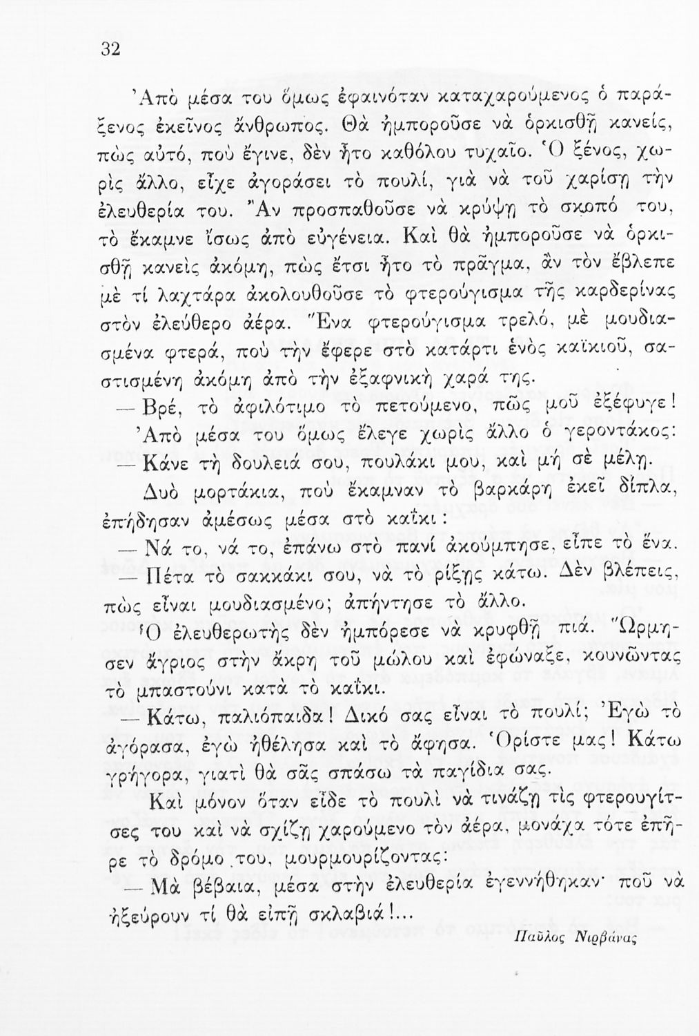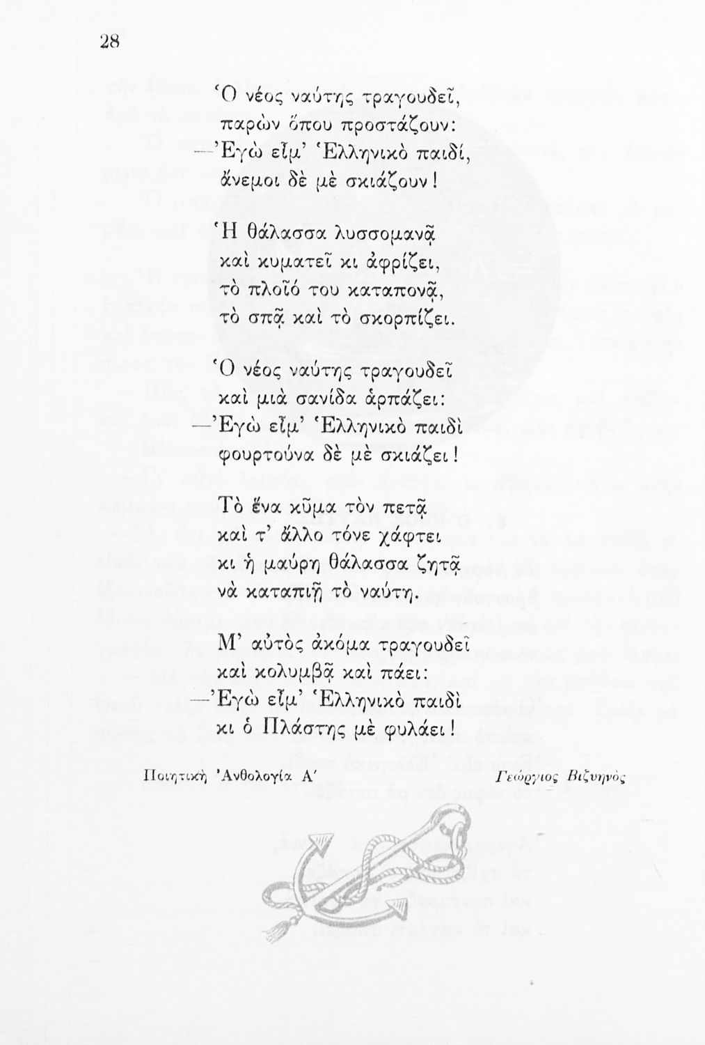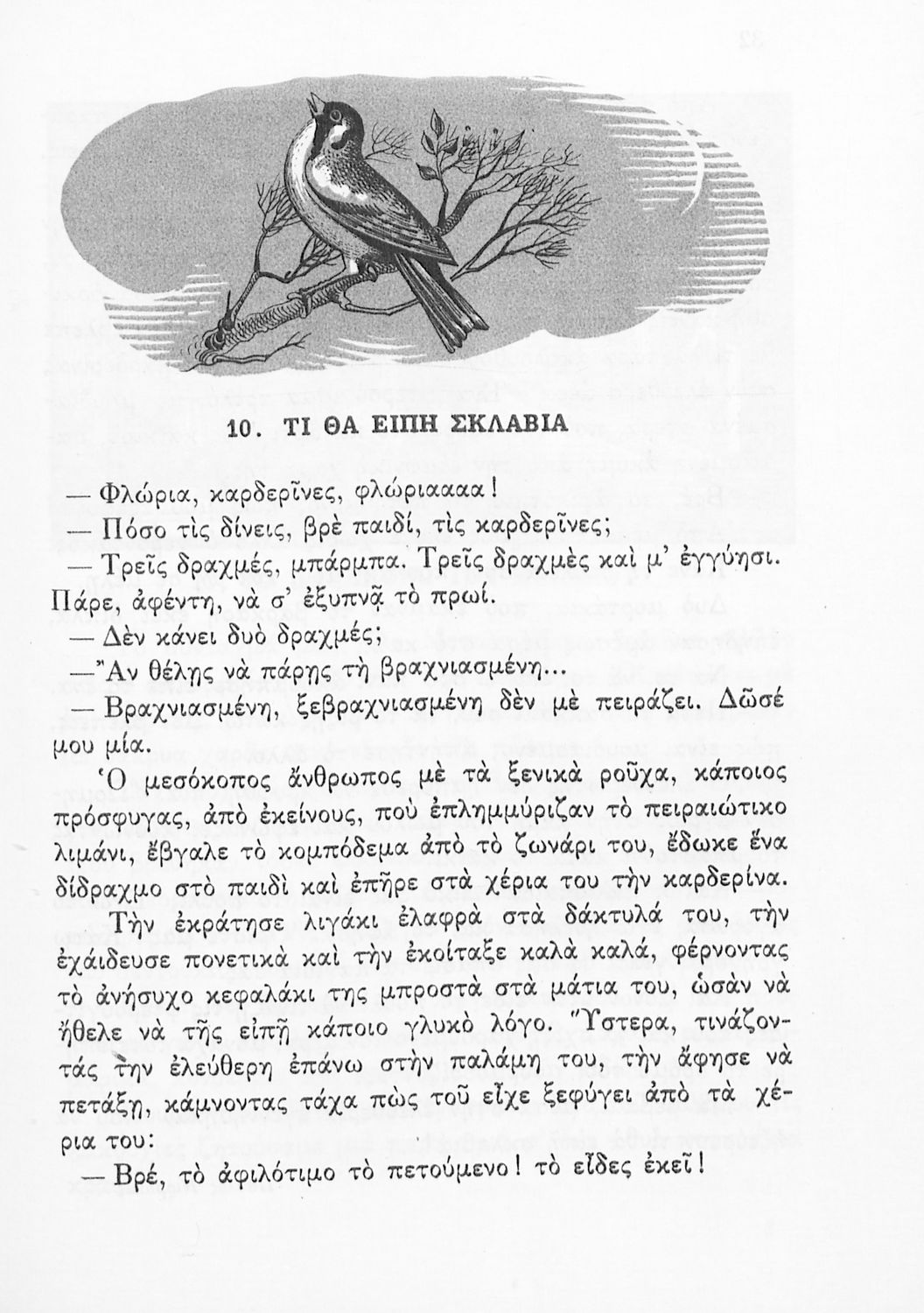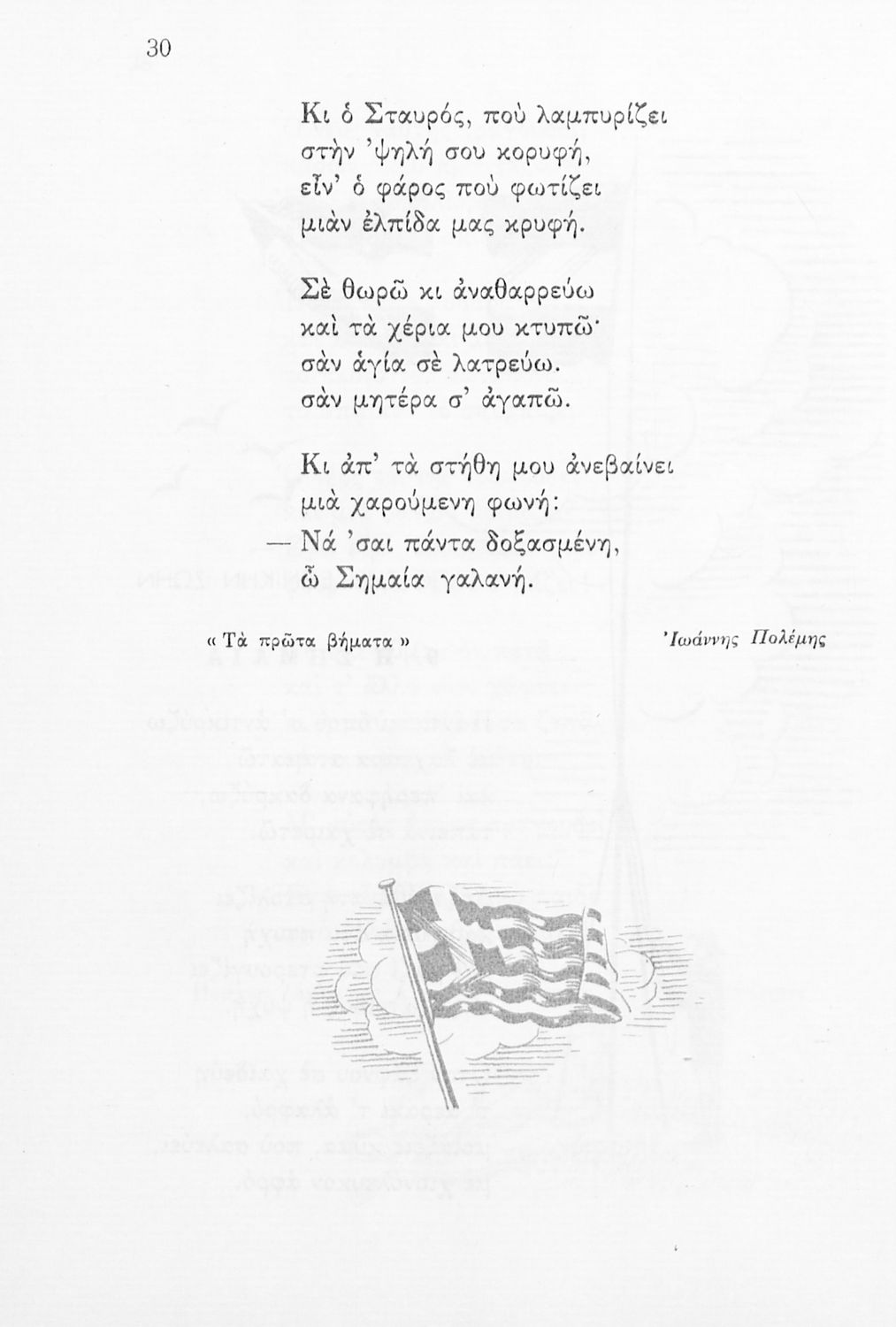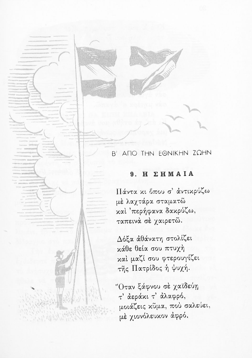 Αναγνωστικό για την Δ΄ τάξη του Δημοτικού. Περιλαμβάνει ένα κείμενο στο οποίο παρεμβάλλονται ποιήματα δημοτικά και Ελλήνων ποιητών.