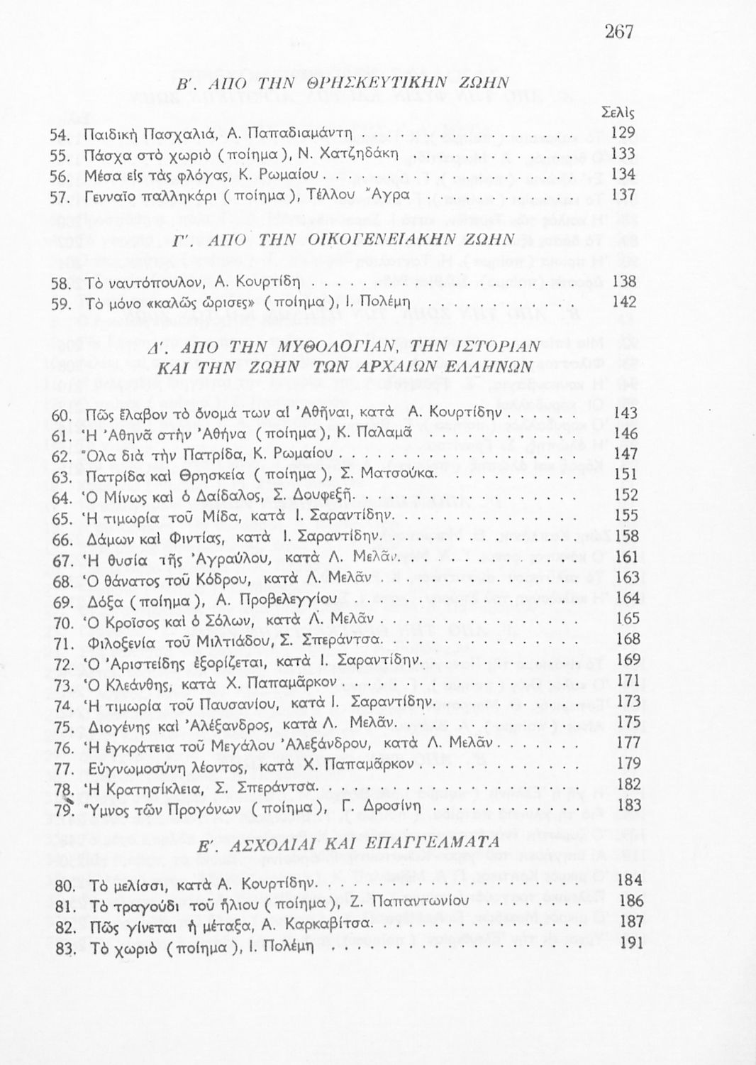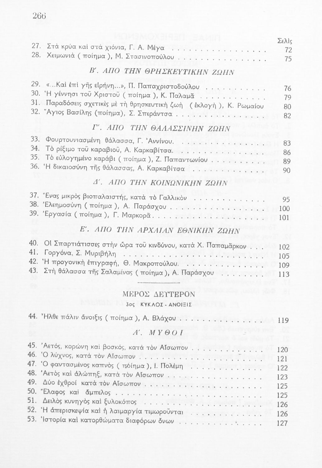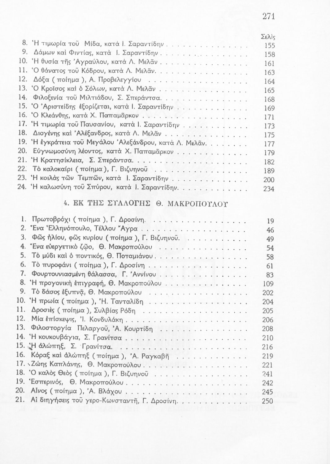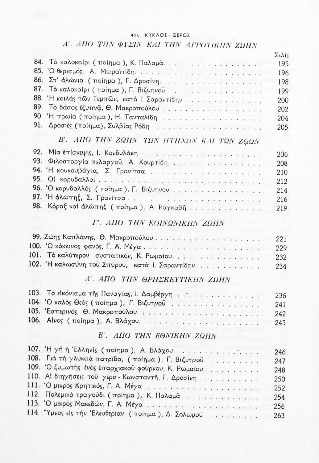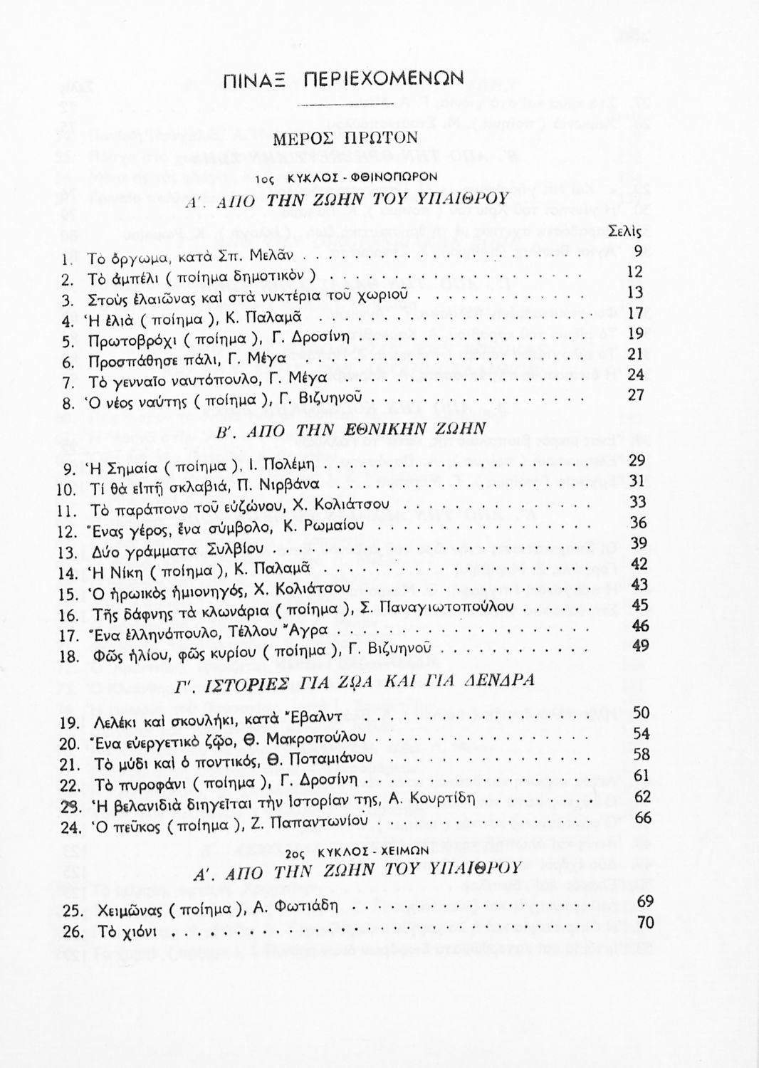 Αναγνωστικό Δ΄ Δημοτικού που περιέχει πεζά και ποιήματα με περιεχόμενο διδακτικό και ηθικοπλαστικό εμπνευσμένα από την ελληνική ιστορία και μυθολογία, και την αγροτική και κοινωνική ζωή.