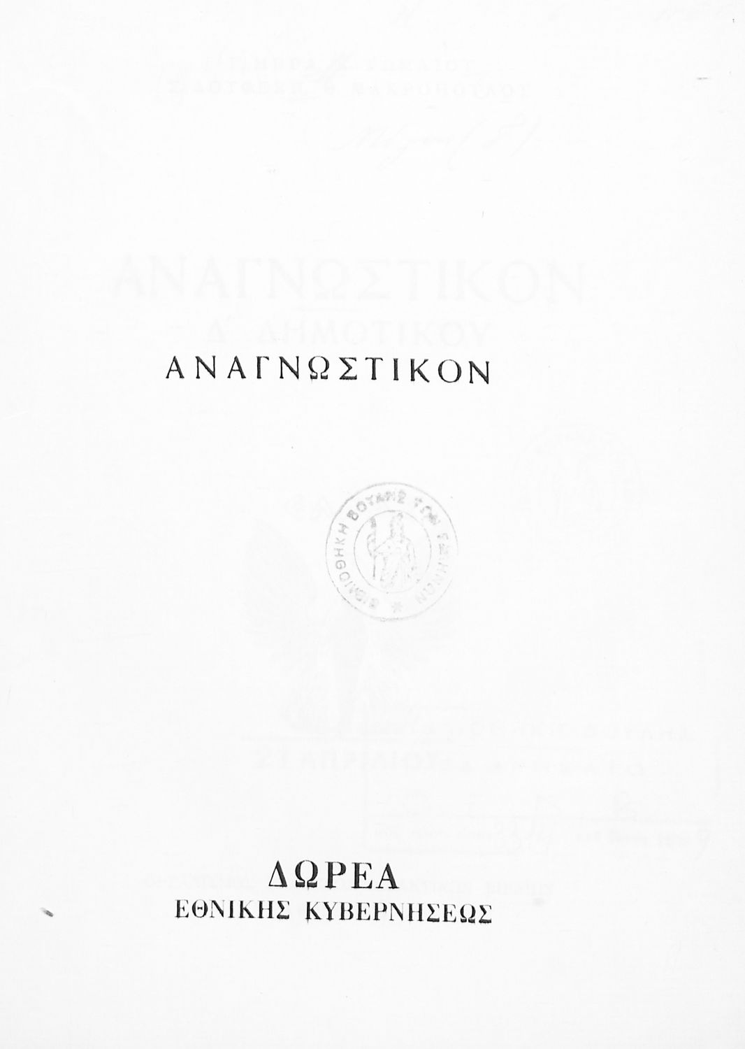 Βαθμίδα εκπαίδευσης: Πρωτοβάθμια Τάξη: Δ' Δημοτικού Μάθημα: Νέα Ελληνικά Γλώσσα: Απλή καθαρεύουσα Παρουσίαση περιεχομένου: Αναγνωστικό Δ΄ Δημοτικού που περιέχει πεζά και ποιήματα με περιεχόμενο διδακτικό και ηθικοπλαστικό εμπνευσμένα από την ελληνική ιστορία και μυθολογία, και την αγροτική και κοινωνική ζωή. |