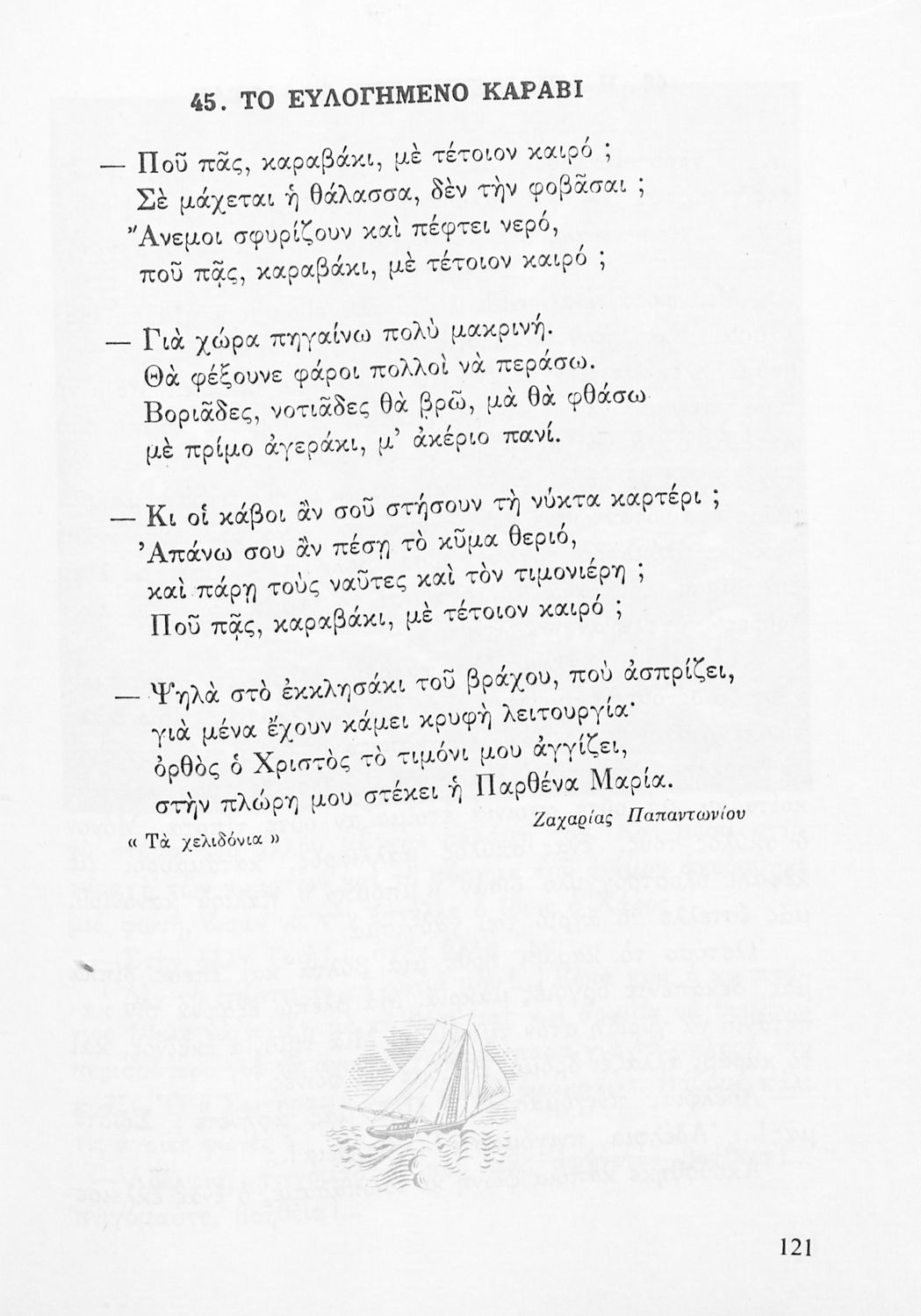 Αναγνωστικό για την Δ΄ τάξη του Δημοτικού. Περιλαμβάνει ένα κείμενο στο οποίο παρεμβάλλονται ποιήματα δημοτικά και Ελλήνων ποιητών.