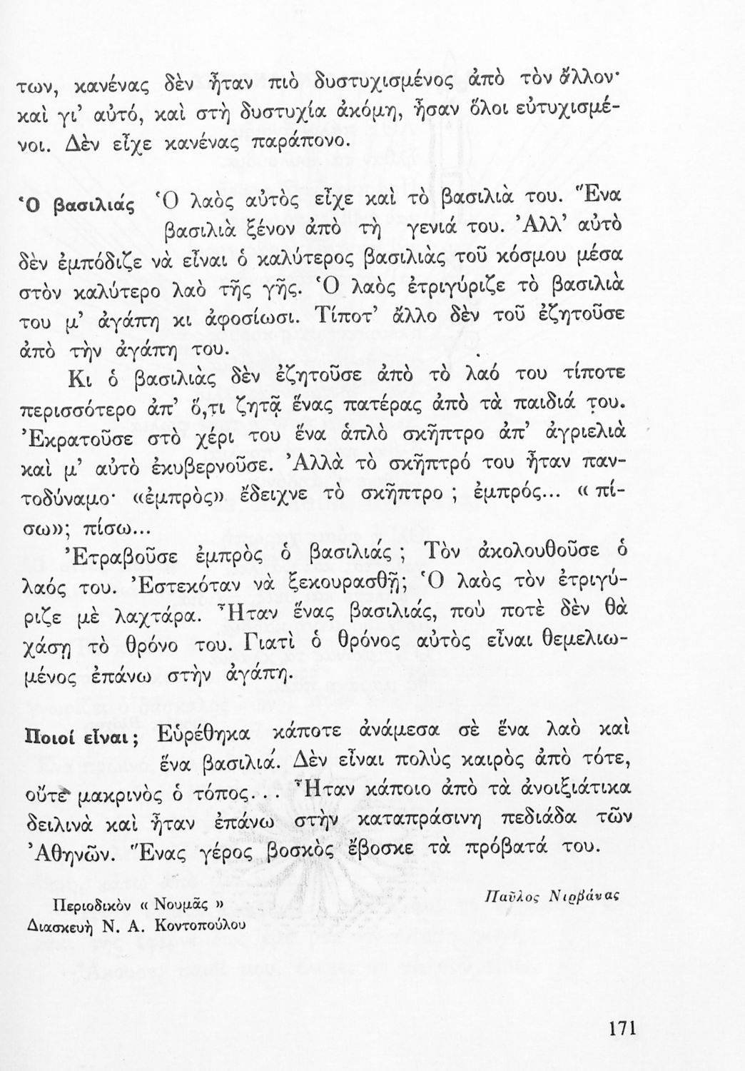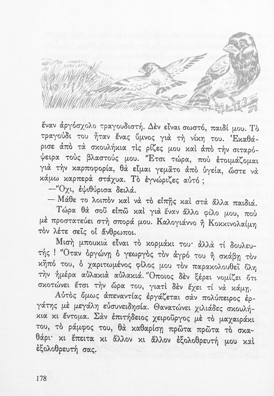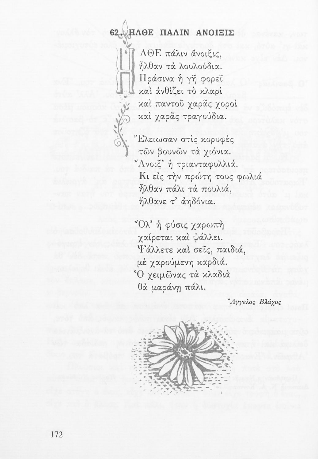 Αναγνωστικό για την Δ΄ τάξη του Δημοτικού. Περιλαμβάνει ένα κείμενο στο οποίο παρεμβάλλονται ποιήματα δημοτικά και Ελλήνων ποιητών.