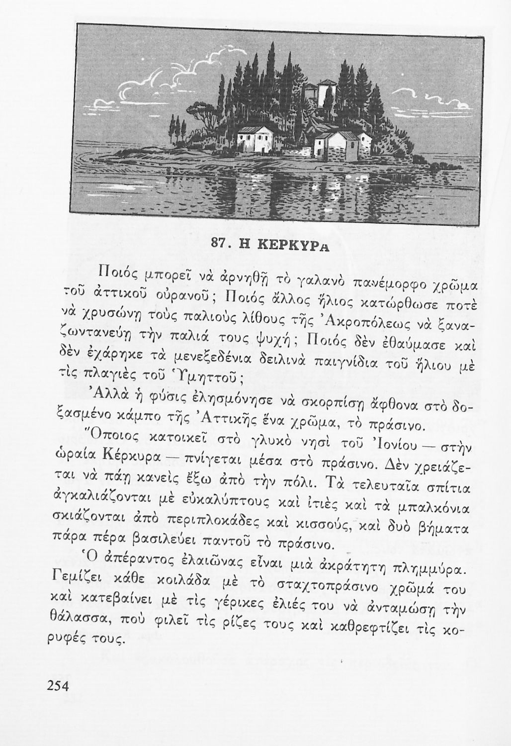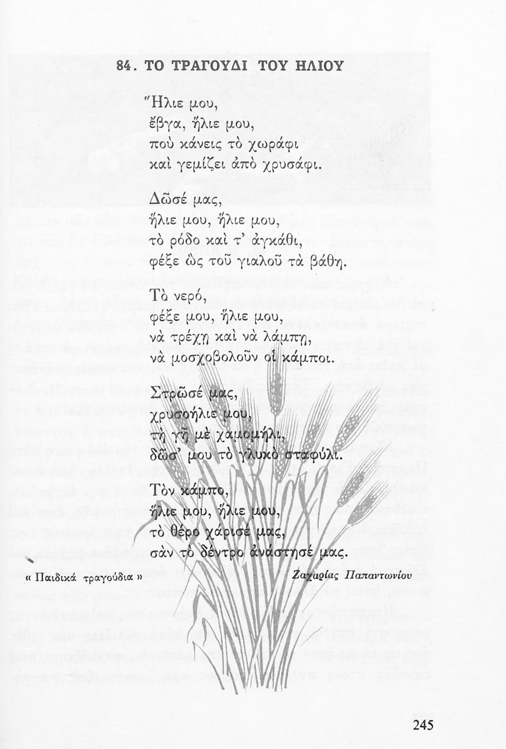 Αναγνωστικό για την Δ΄ τάξη του Δημοτικού. Περιλαμβάνει ένα κείμενο στο οποίο παρεμβάλλονται ποιήματα δημοτικά και Ελλήνων ποιητών.