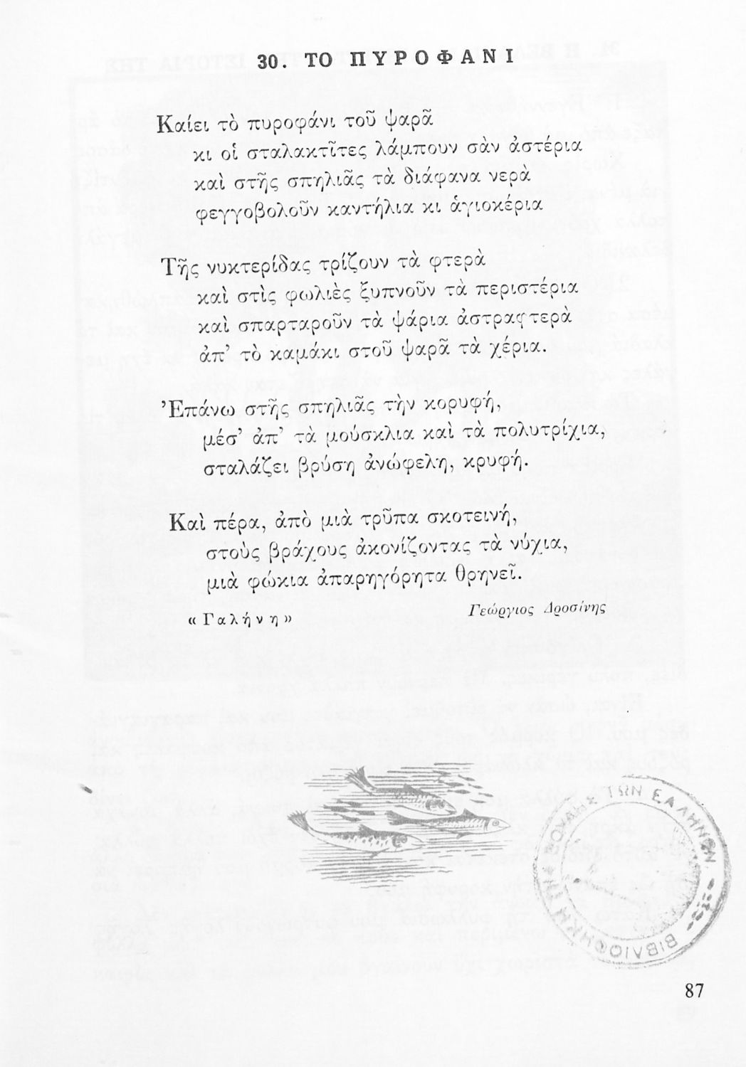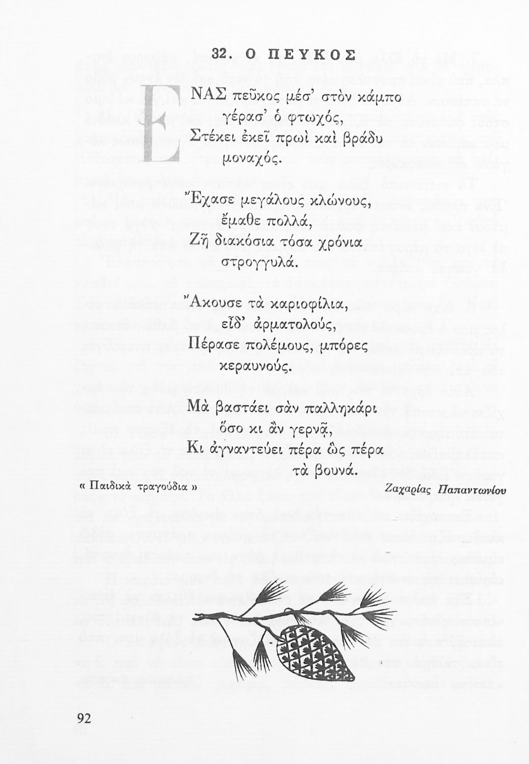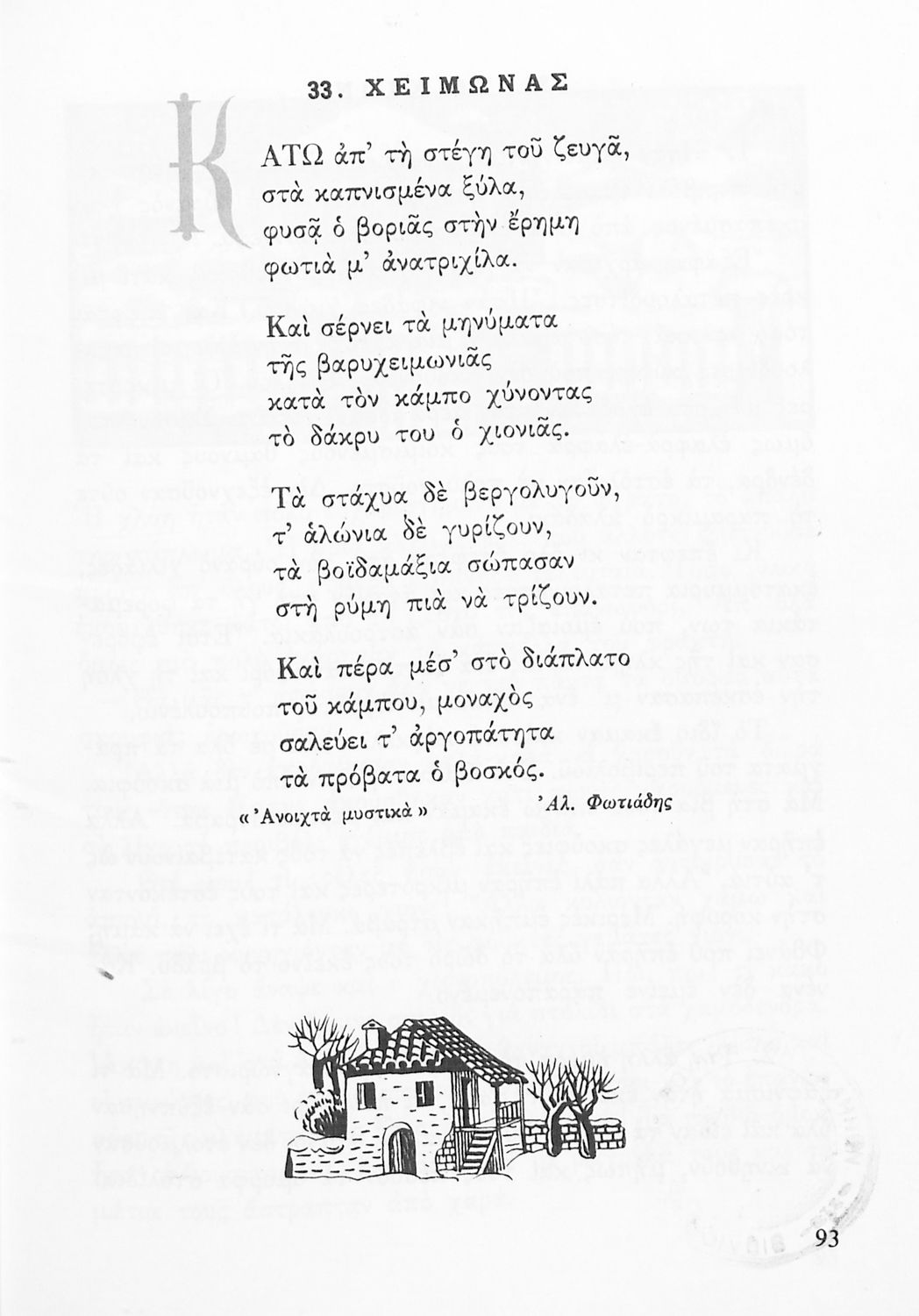 Αναγνωστικό για την Δ΄ τάξη του Δημοτικού. Περιλαμβάνει ένα κείμενο στο οποίο παρεμβάλλονται ποιήματα δημοτικά και Ελλήνων ποιητών.