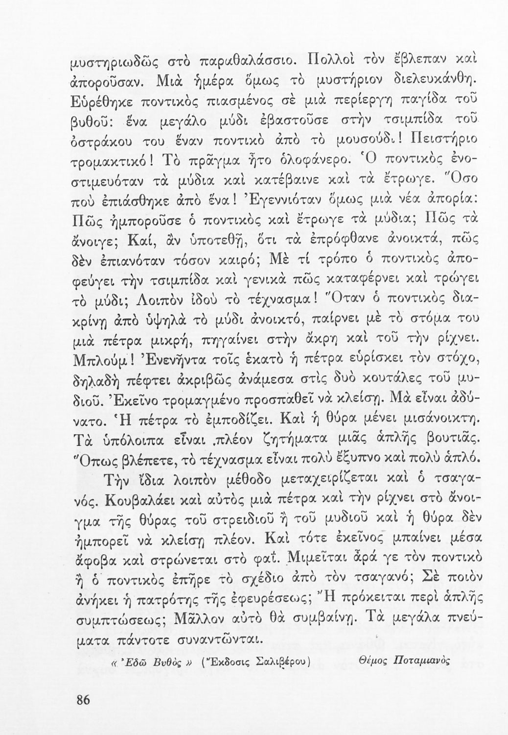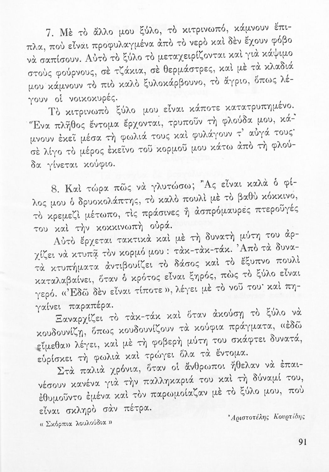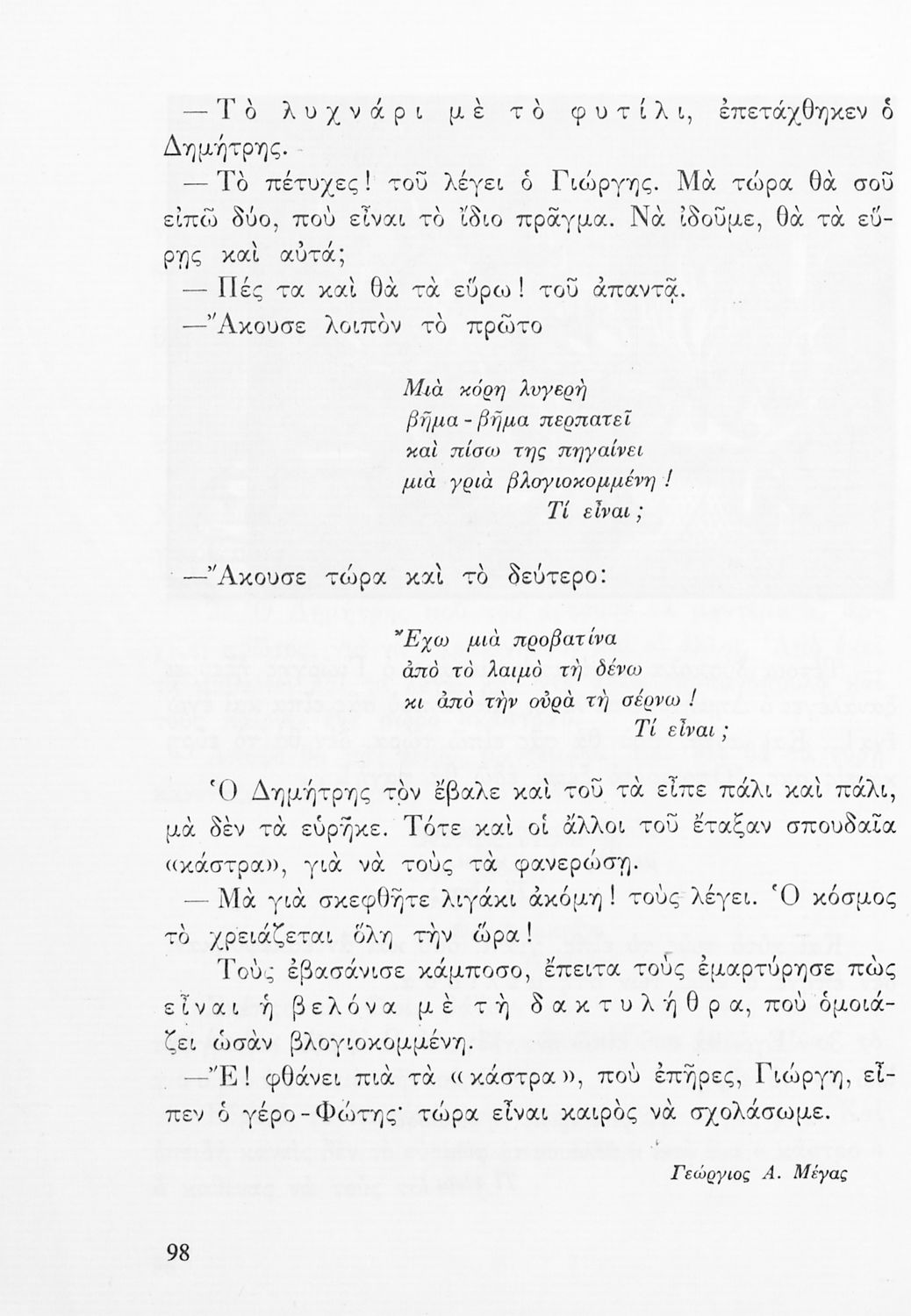 Αναγνωστικό για την Δ΄ τάξη του Δημοτικού. Περιλαμβάνει ένα κείμενο στο οποίο παρεμβάλλονται ποιήματα δημοτικά και Ελλήνων ποιητών.