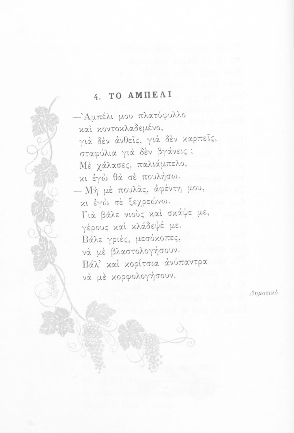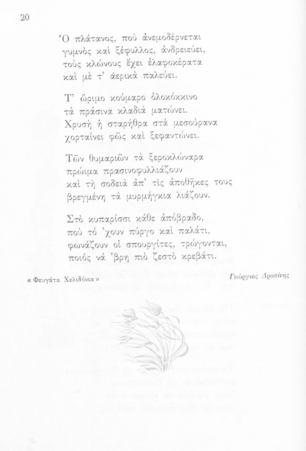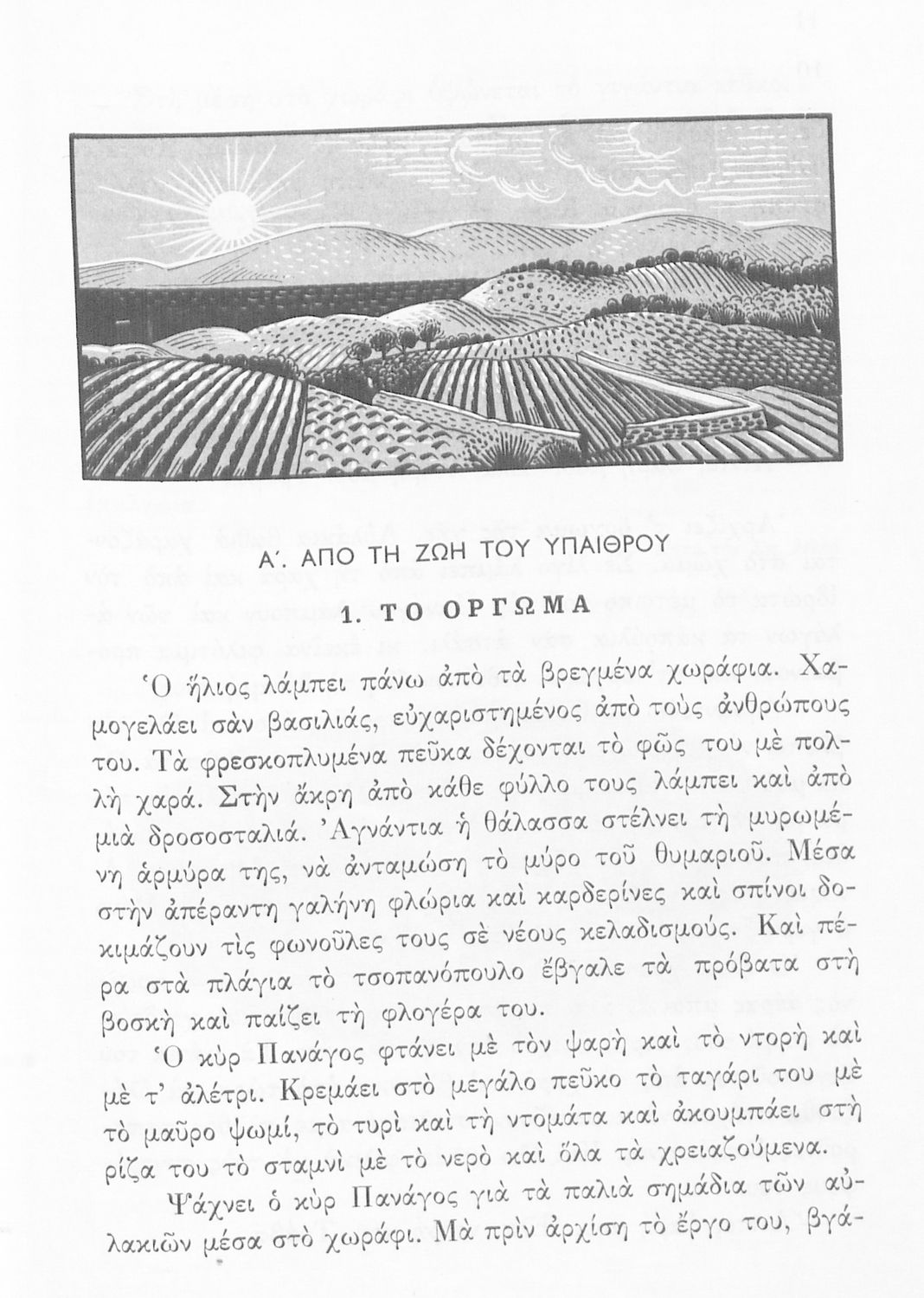 Αναγνωστικό Δ' Δημοτικού που είναι χωρισμένο σύμφωνα με τις εποχές του χρόνου και περιλαμβάνει ποιήματα και πεζά εμπνευσμένα από τη ζωή στην ύπαιθρο, την εθνική, οικογενειακή και κοινωνική ζωή, τη θρησκευτική παράδοση, τις ασχολίες των ανθρώπων, και την ελληνική φύση, ιστορία και μυθολογία.