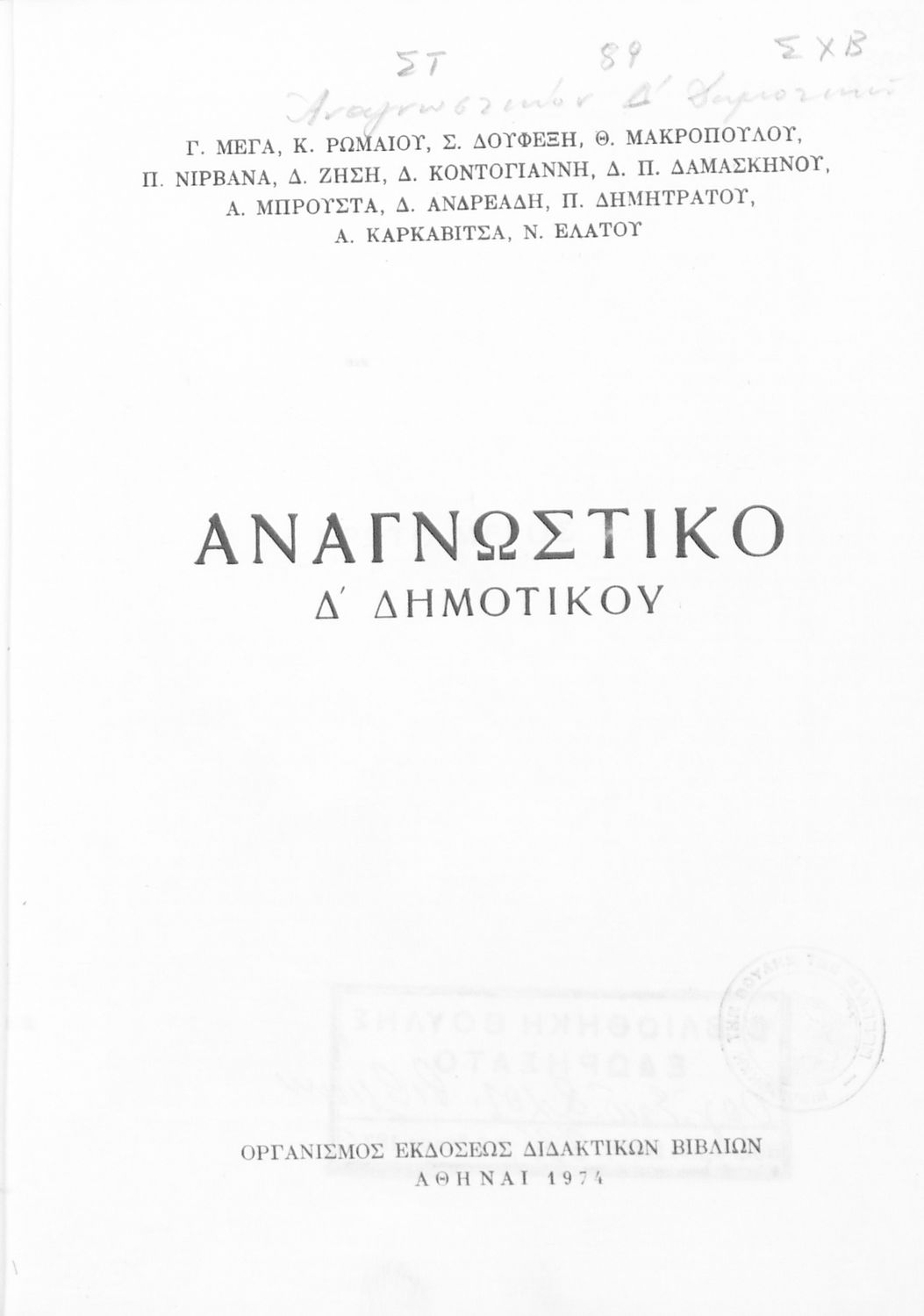 Κωδικός αναγνώρισης: 03-20555604 Τίτλος: Αναγνωστικόν Δ΄ Δημοτικού Συγγραφέας: Γ. Μέγας, Κ. Ρωμαίος, Σ. Δουφεξής, Θ. Μακρόπουλος, Π. Νιρβάνας, Δ. Ζήσης, Δ. Κοντογιάννης, Δ. Π. Δαμασκηνός, Α. Μπρούστας, Δ. Ανδρεάδης, Π. Δημητράτος, Α. Καρκαβίτσας, Ν. Έλατος Μέγεθος και υπόστρωμα: Σχολικό εγχειρίδιο, μαλακό εξώφυλλο, 256 σελίδες. Εικόνες, σκίτσα, έγχρωμα. |