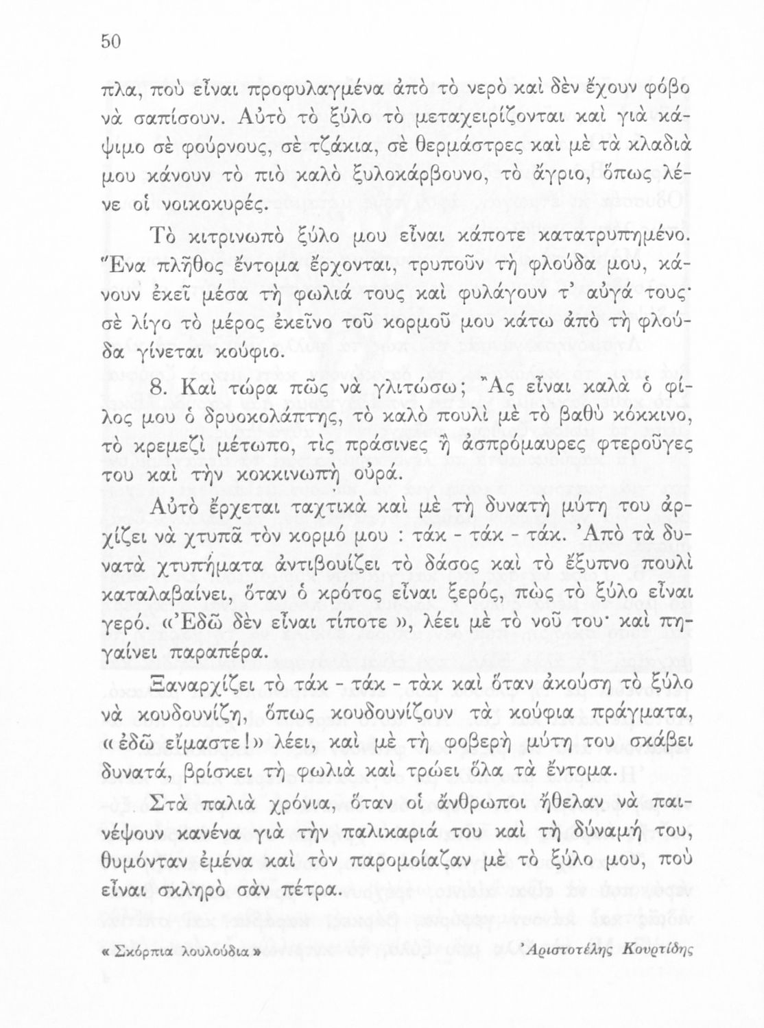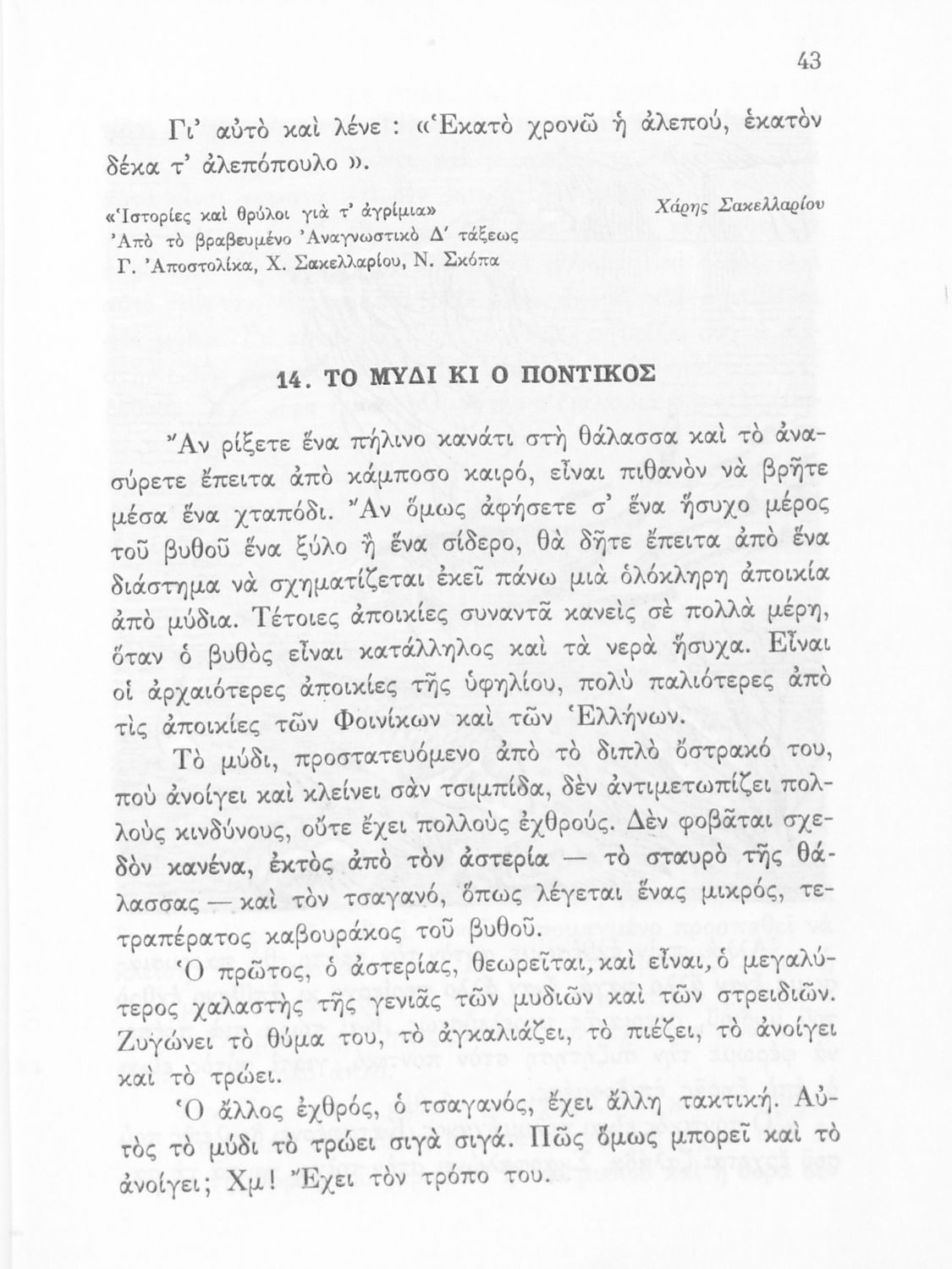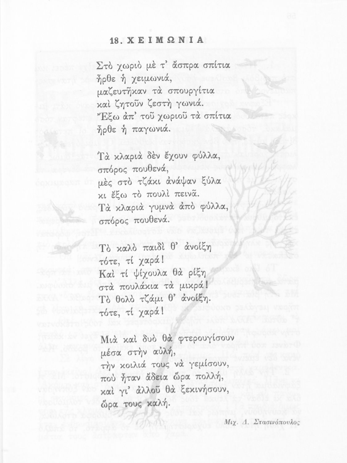 Αναγνωστικό Δ' Δημοτικού που είναι χωρισμένο σύμφωνα με τις εποχές του χρόνου και περιλαμβάνει ποιήματα και πεζά εμπνευσμένα από τη ζωή στην ύπαιθρο, την εθνική, οικογενειακή και κοινωνική ζωή, τη θρησκευτική παράδοση, τις ασχολίες των ανθρώπων, και την ελληνική φύση, ιστορία και μυθολογία.
