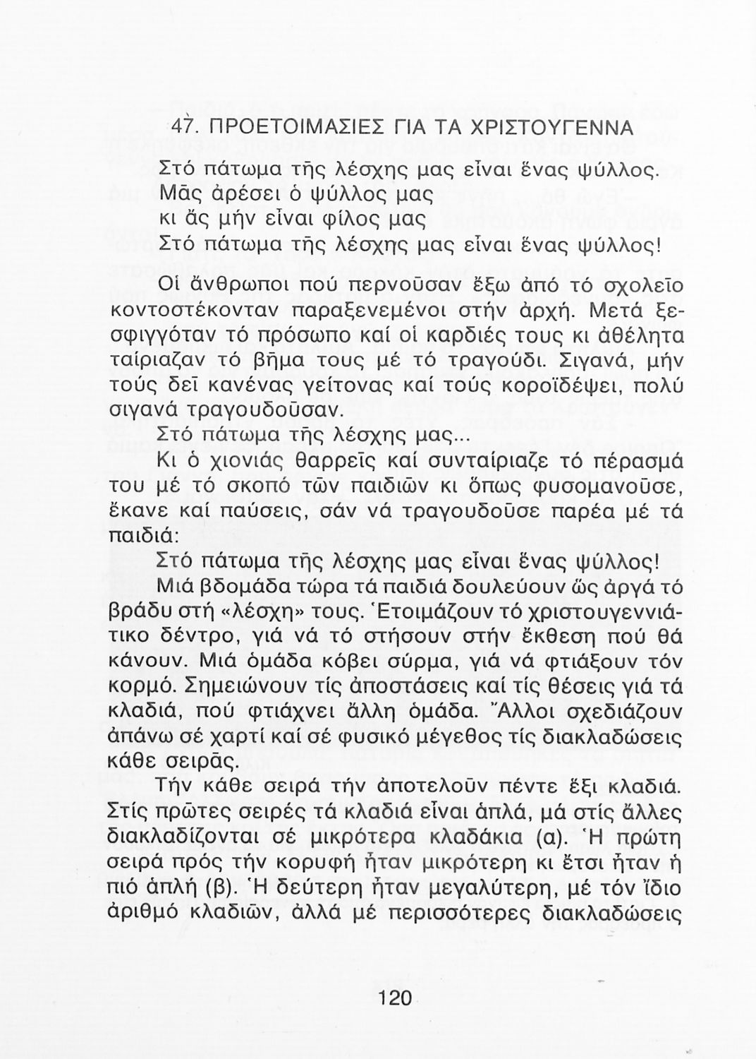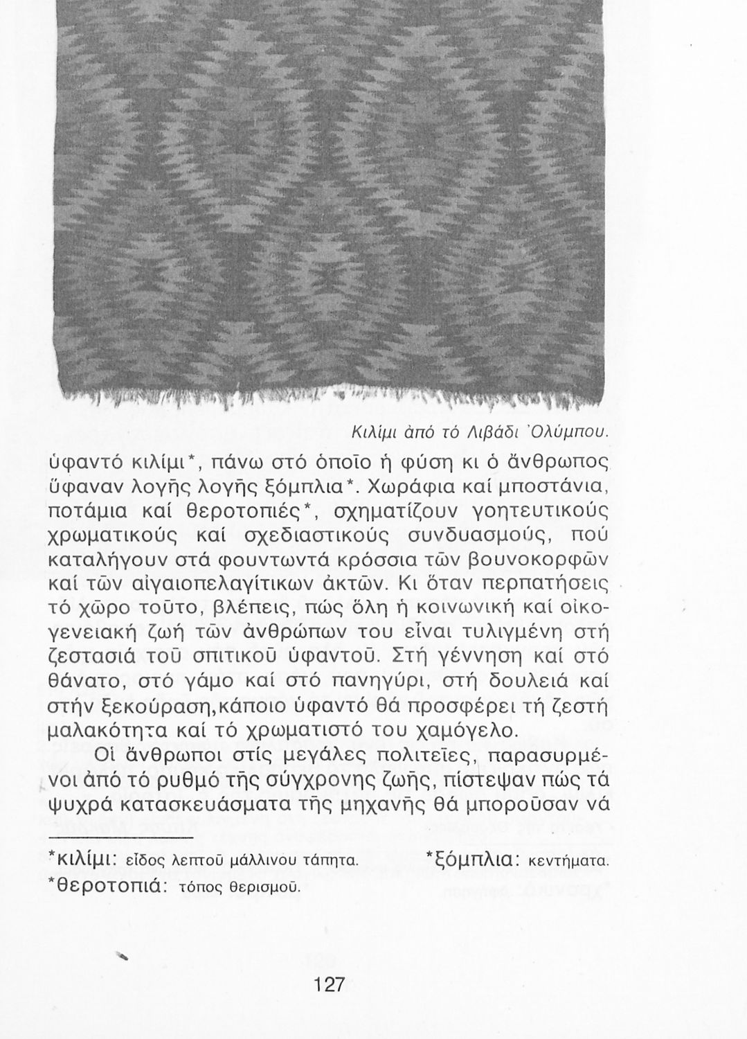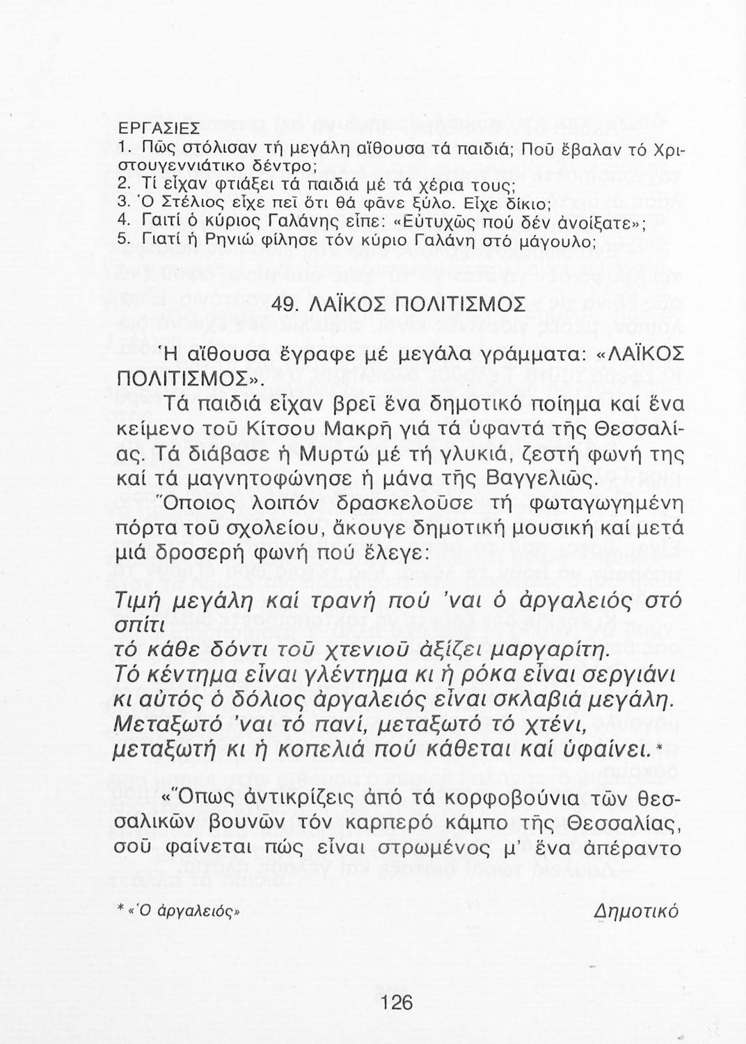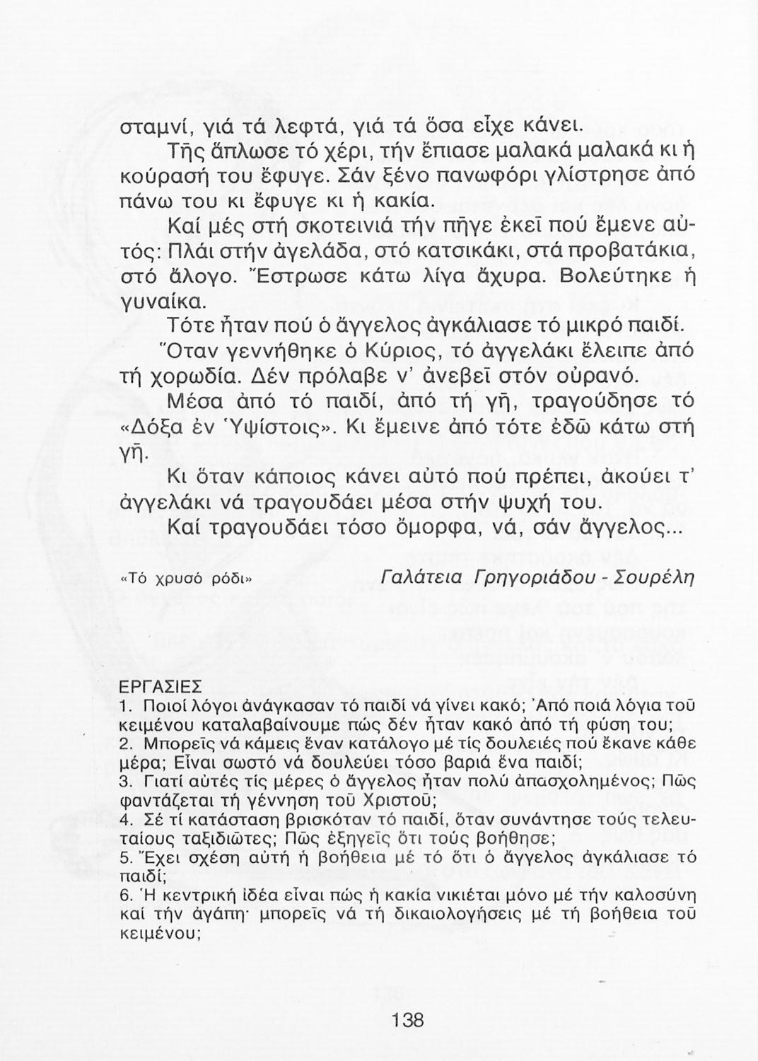 Αναγνωστικό Δ΄ Δημοτικού που περιέχει πεζά και ποιήματα με περιεχόμενο διδακτικό και ηθικοπλαστικό εμπνευσμένα από την αγροτική ζωή και κοινωνική ζωή, την ελληνική φύση και παράδοση, και τις ασχολίες των ανθρώπων. Περιλαμβάνει και σύντομα βιογραφικά σημειώματα των συγγραφέων.