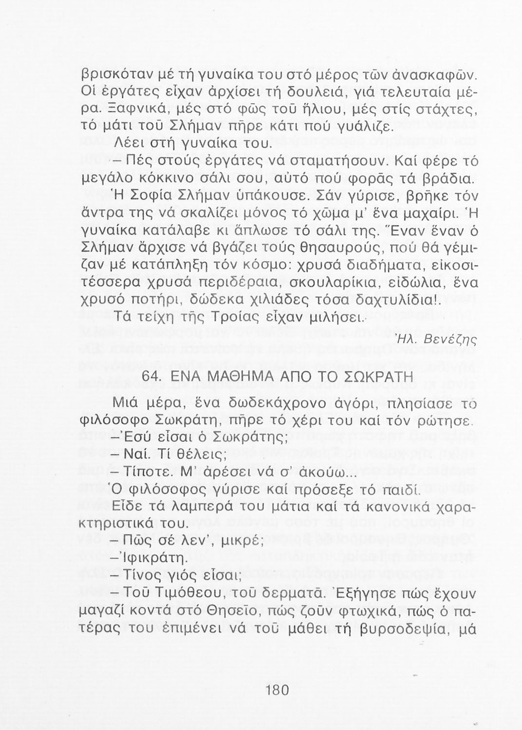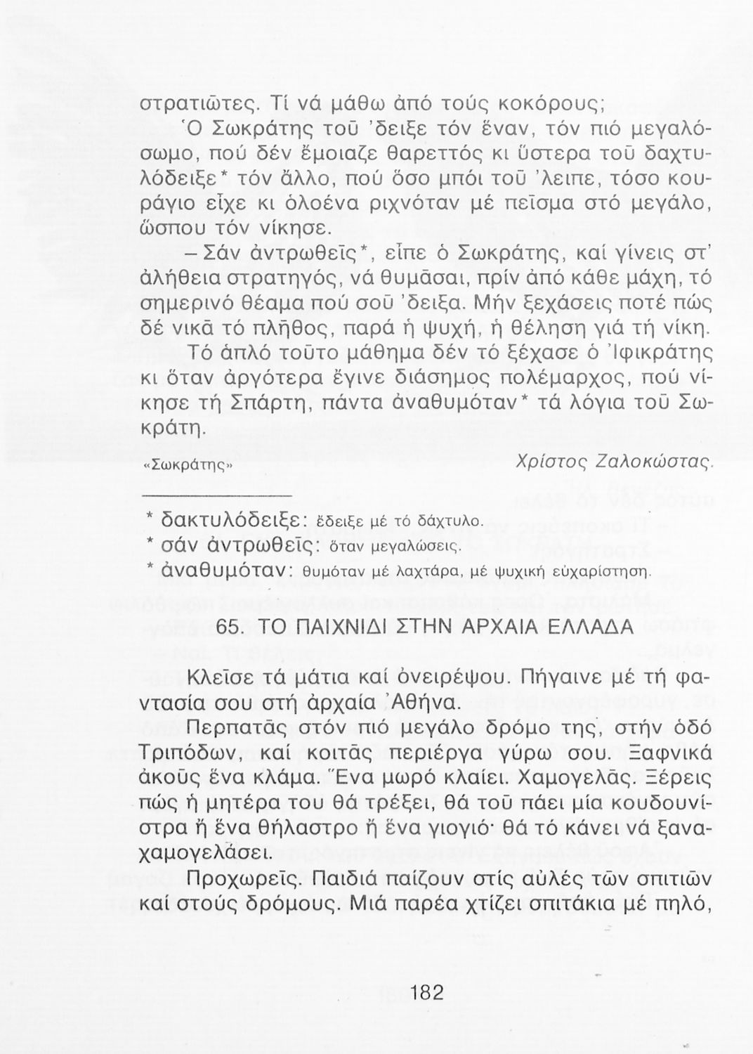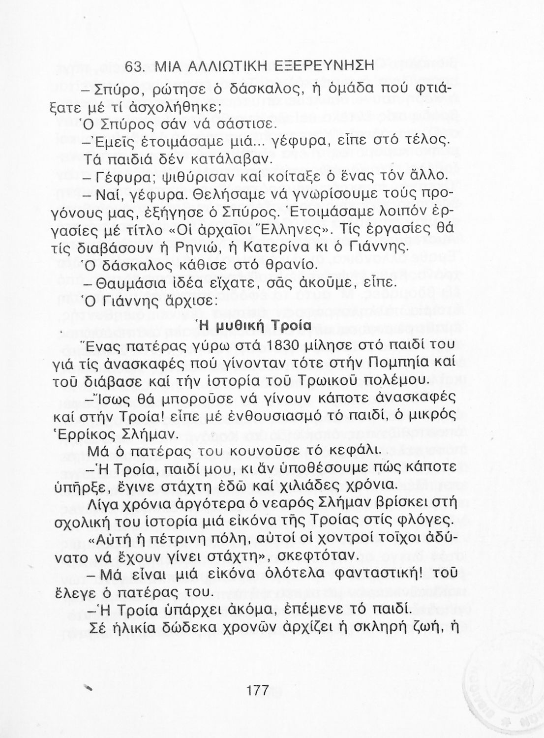 Αναγνωστικό Δ΄ Δημοτικού που περιέχει πεζά και ποιήματα εμπνευσμένα από την ελληνική ιστορία και μυθολογία, την κοινωνική ζωή και την ελληνική φύση.