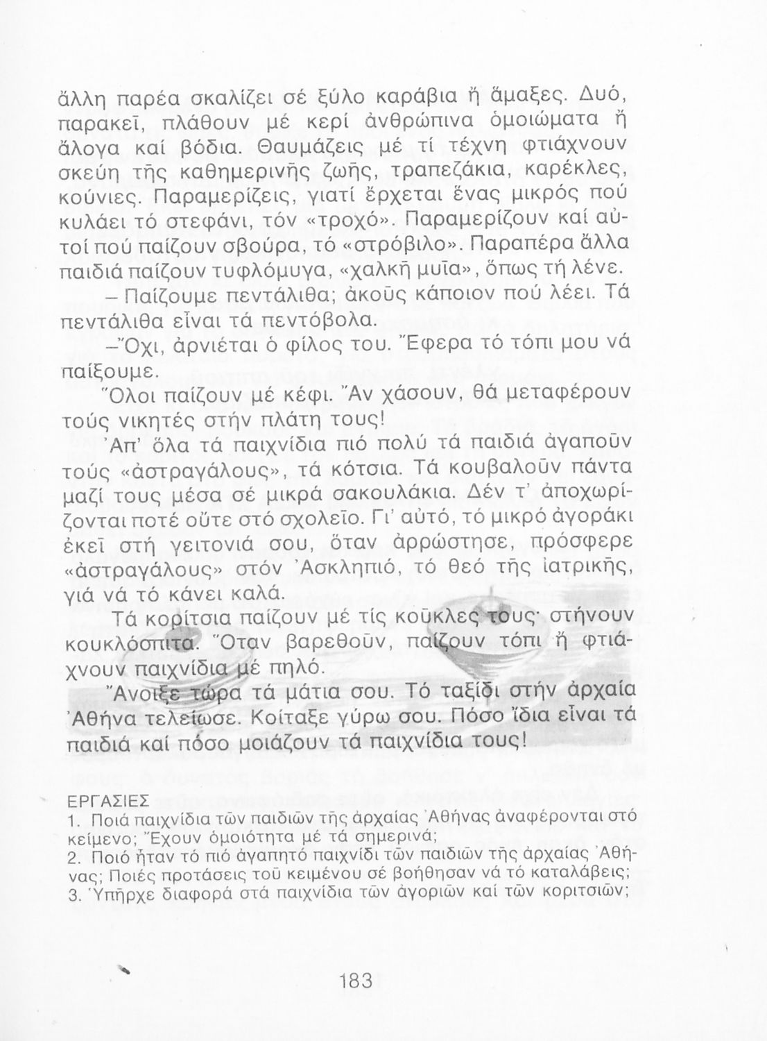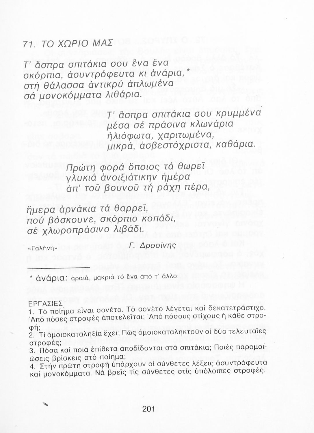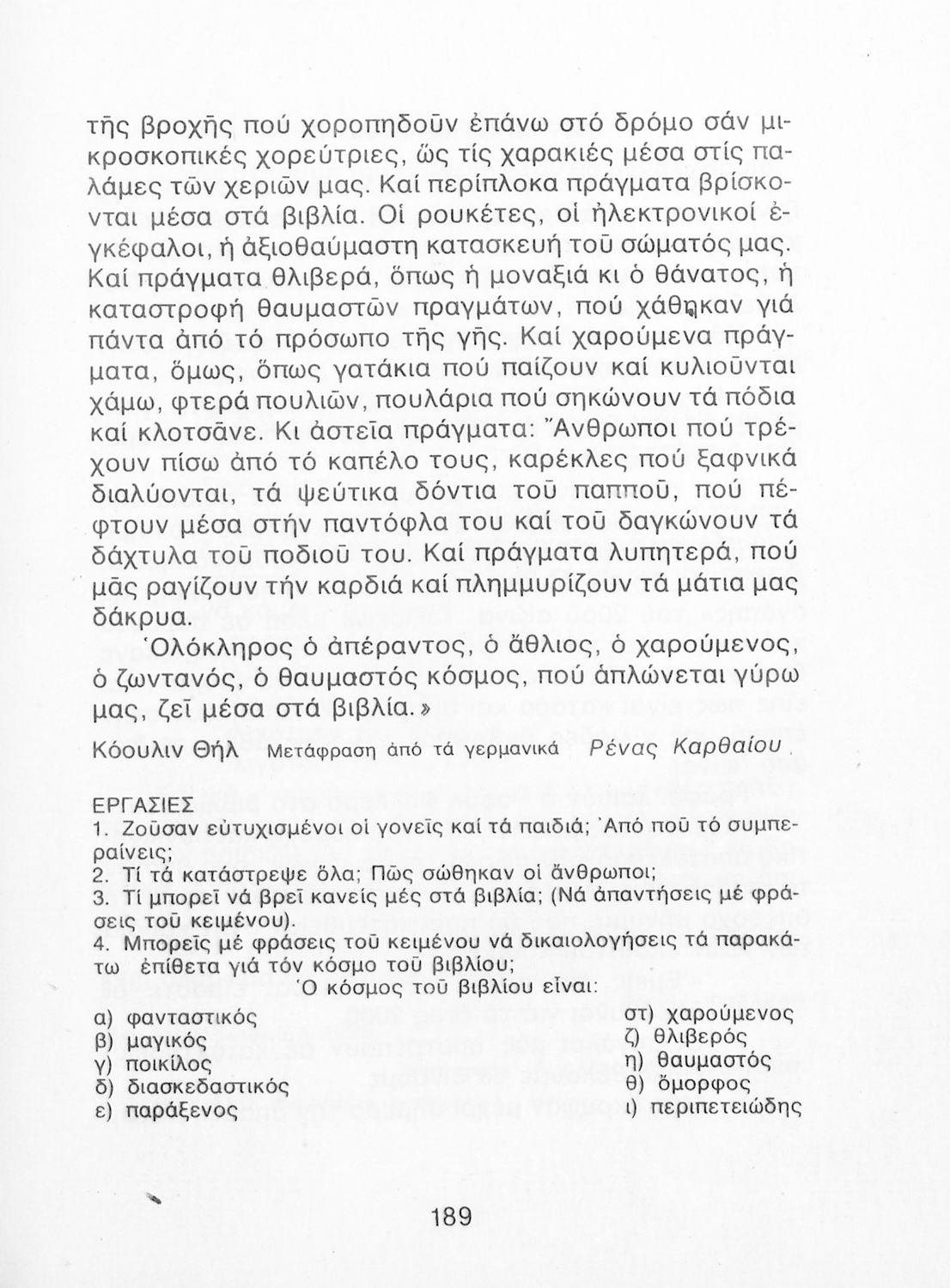 Αναγνωστικό Δ΄ Δημοτικού που περιέχει πεζά και ποιήματα με περιεχόμενο διδακτικό και ηθικοπλαστικό εμπνευσμένα από την αγροτική ζωή και κοινωνική ζωή, την ελληνική φύση και παράδοση, και τις ασχολίες των ανθρώπων. Περιλαμβάνει και σύντομα βιογραφικά σημειώματα των συγγραφέων.
