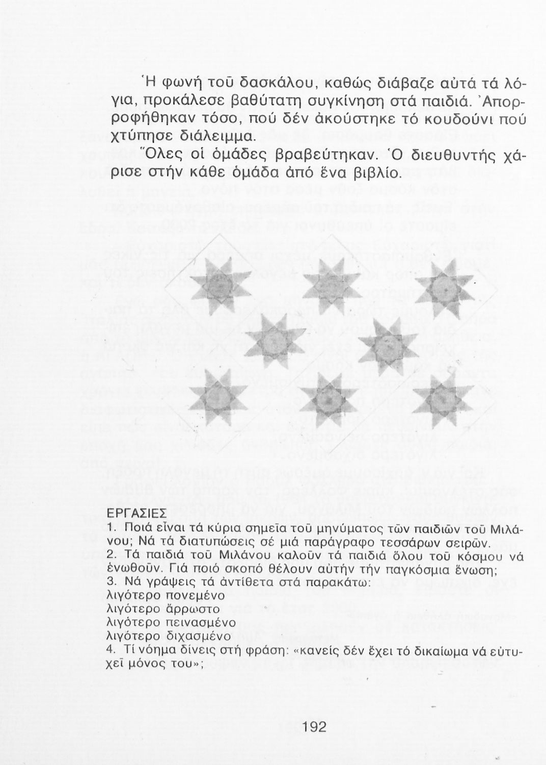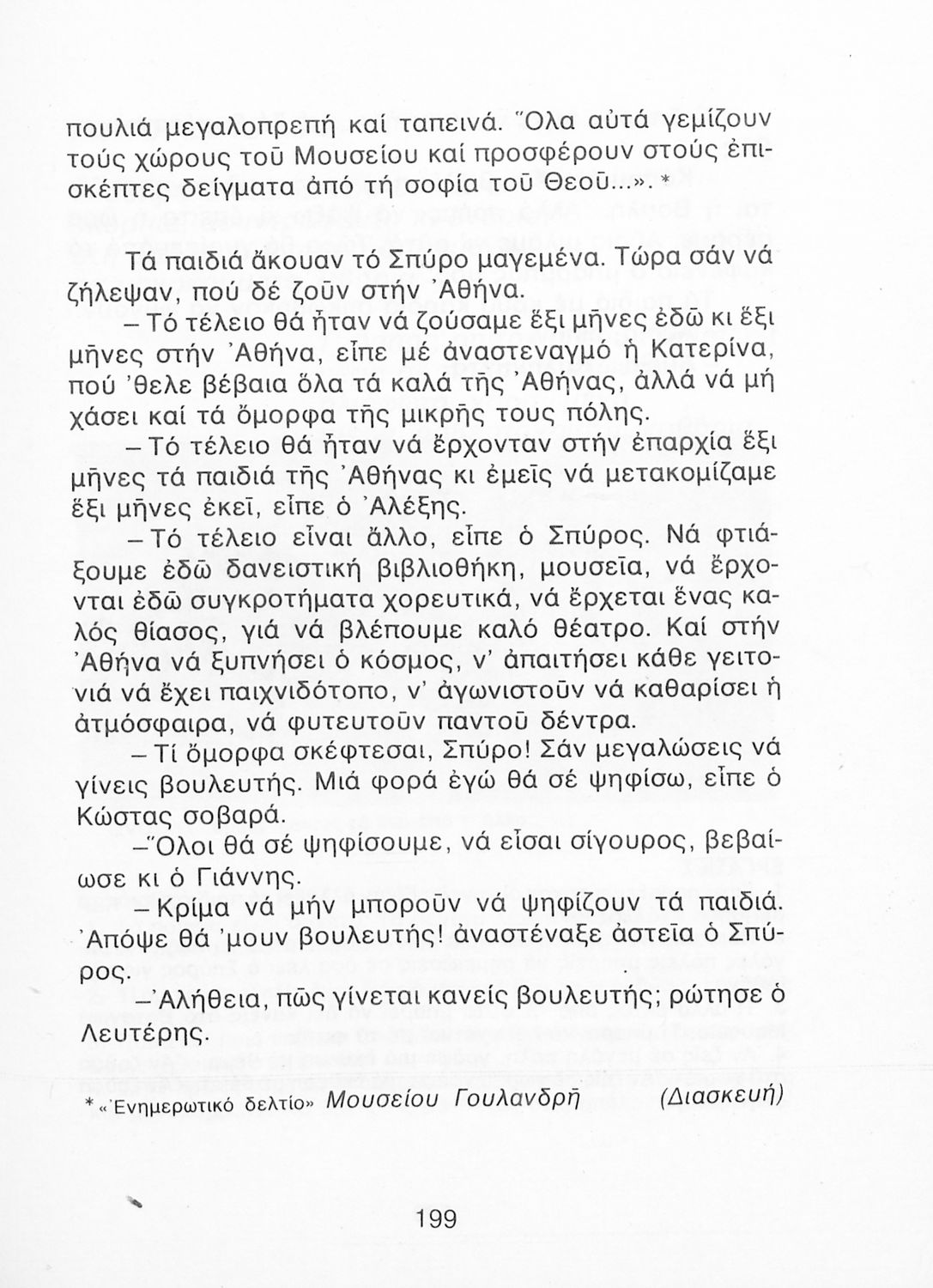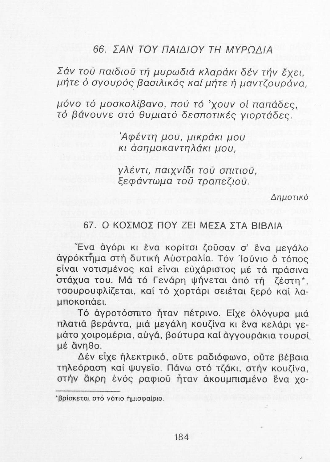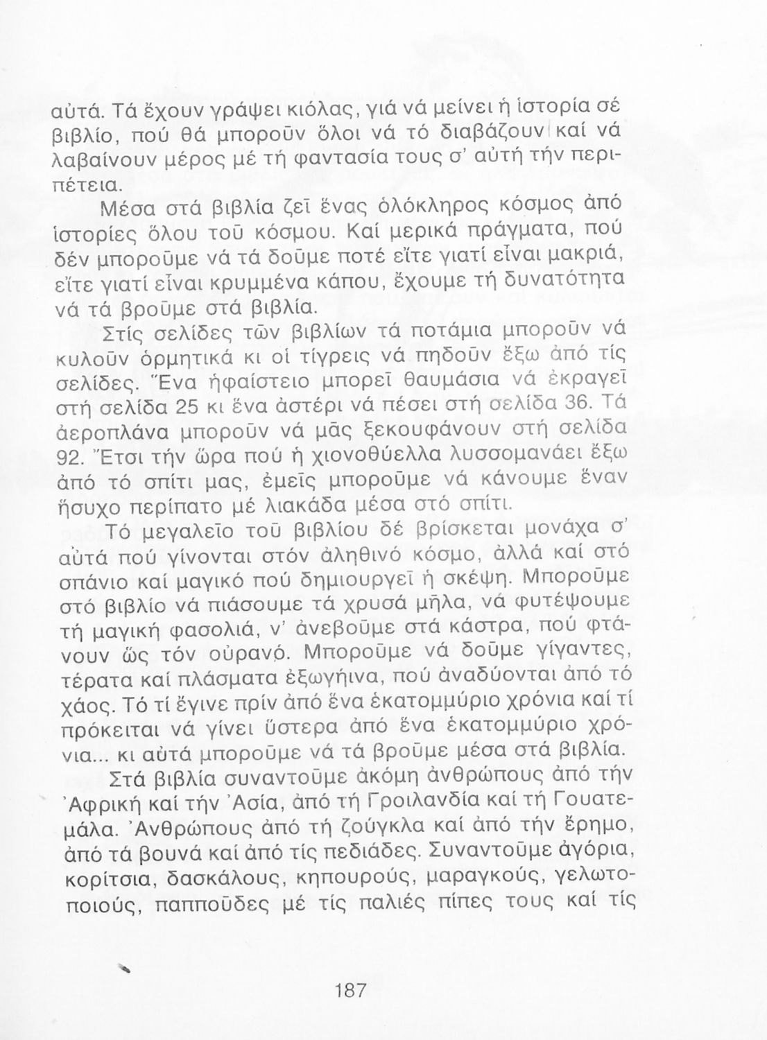 Αναγνωστικό Δ΄ Δημοτικού που περιέχει πεζά και ποιήματα με περιεχόμενο διδακτικό και ηθικοπλαστικό εμπνευσμένα από την αγροτική ζωή και κοινωνική ζωή, την ελληνική φύση και παράδοση, και τις ασχολίες των ανθρώπων. Περιλαμβάνει και σύντομα βιογραφικά σημειώματα των συγγραφέων.
