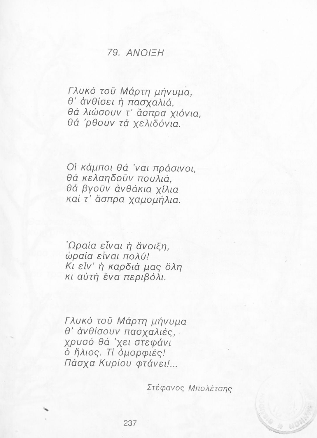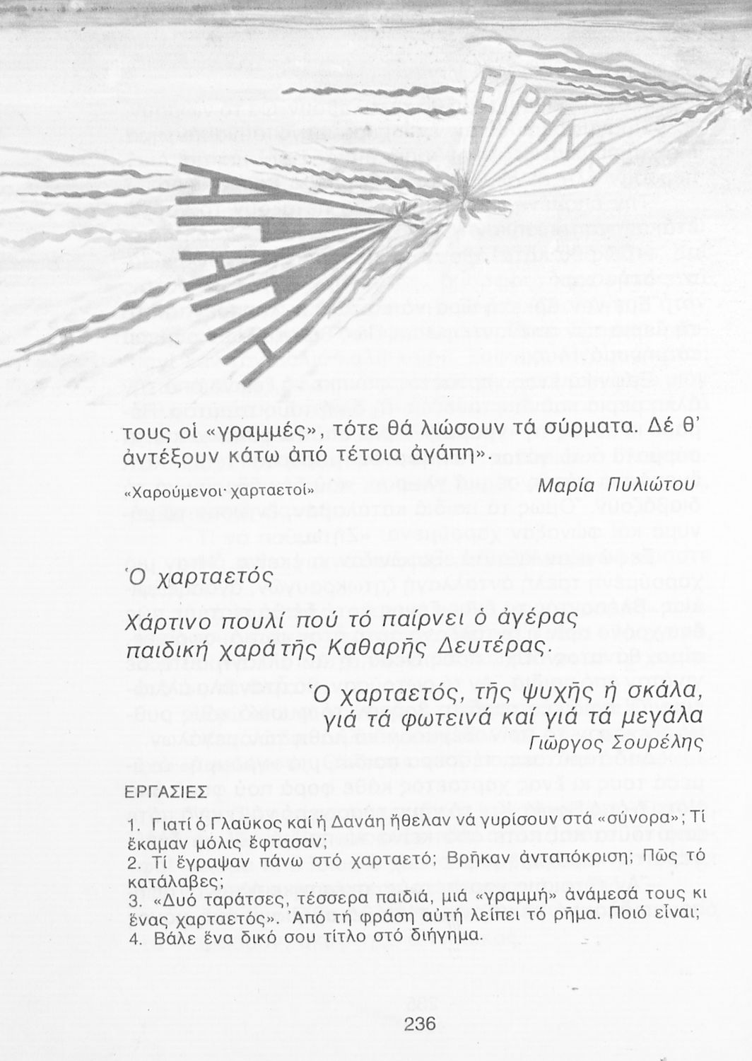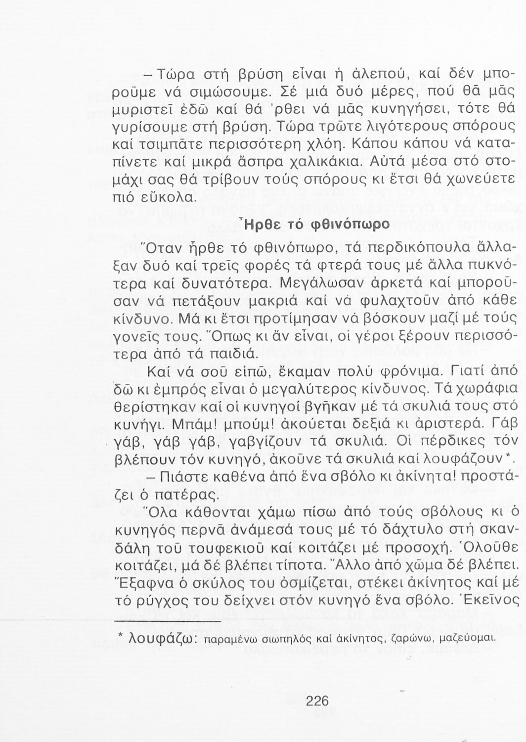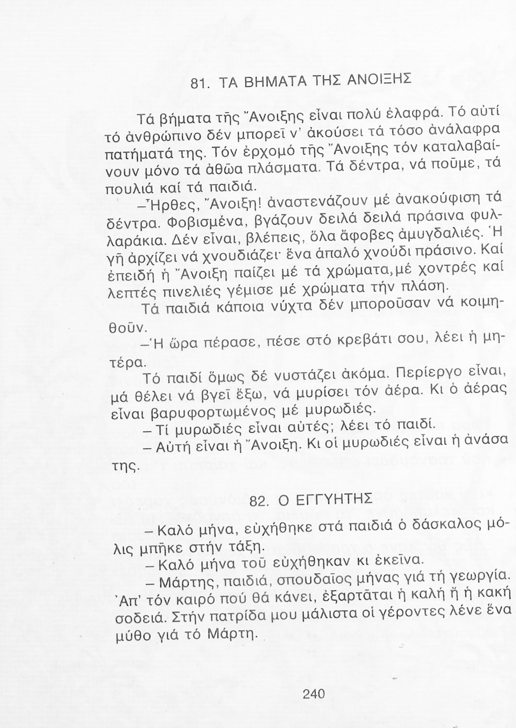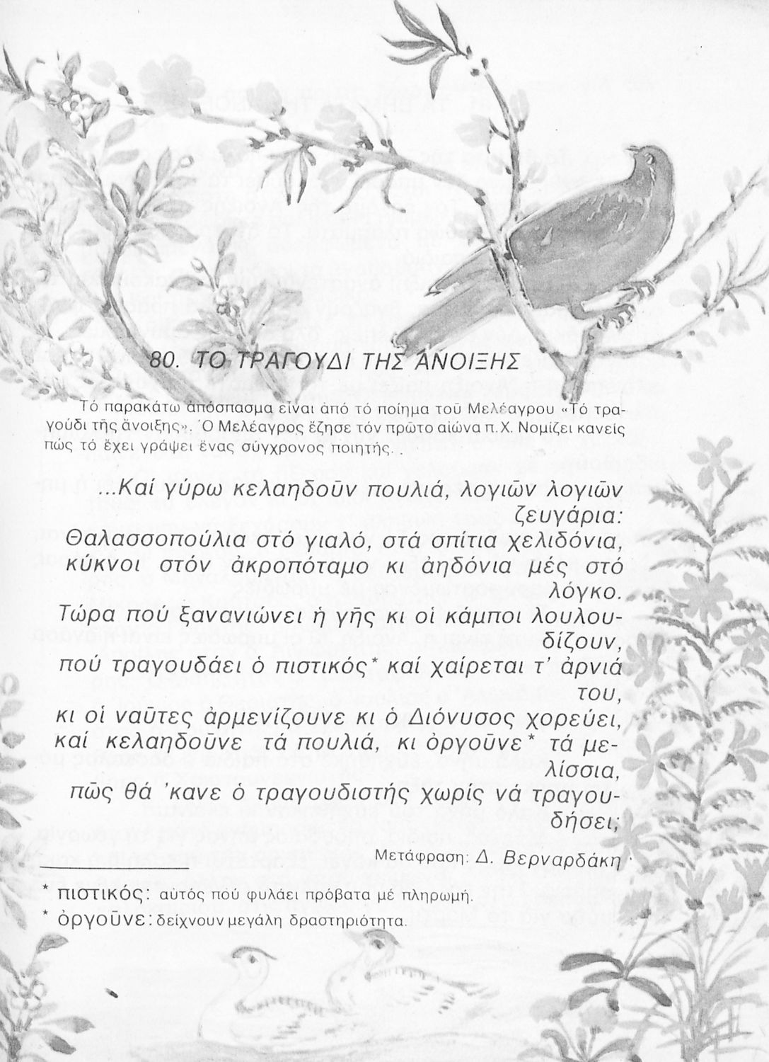 Αναγνωστικό Δ΄ Δημοτικού που περιέχει πεζά και ποιήματα με περιεχόμενο διδακτικό και ηθικοπλαστικό εμπνευσμένα από την αγροτική ζωή και κοινωνική ζωή, την ελληνική φύση και παράδοση, και τις ασχολίες των ανθρώπων. Περιλαμβάνει και σύντομα βιογραφικά σημειώματα των συγγραφέων.