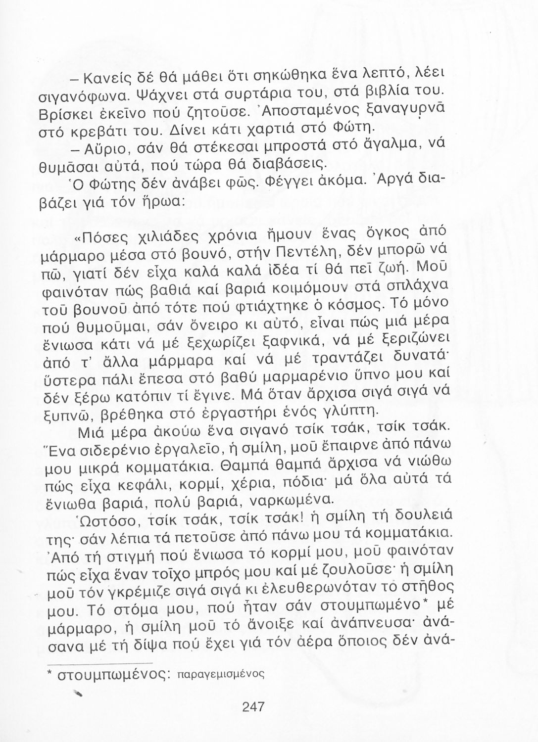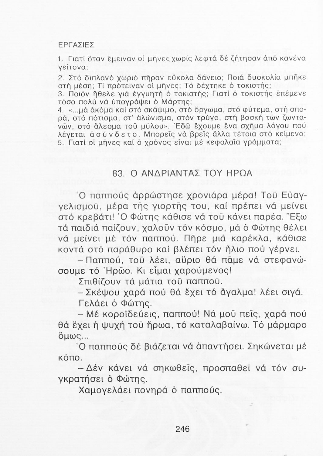 Αναγνωστικό Δ΄ Δημοτικού που περιέχει πεζά και ποιήματα εμπνευσμένα από την ελληνική ιστορία και μυθολογία, την κοινωνική ζωή και την ελληνική φύση.