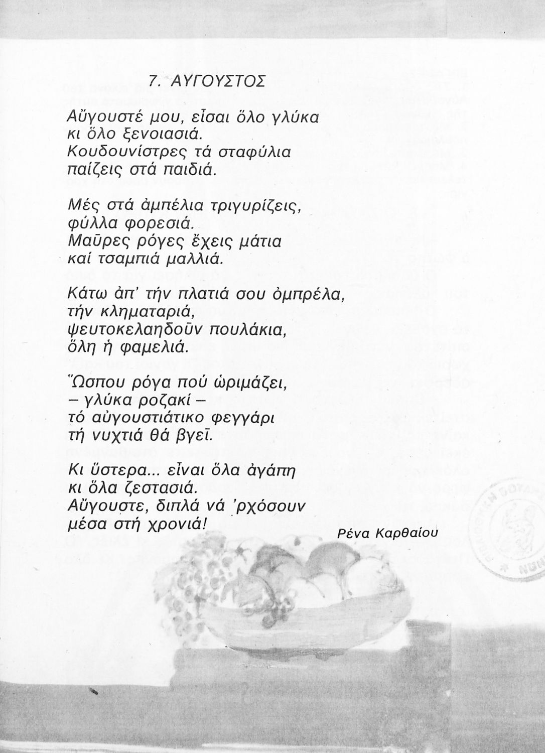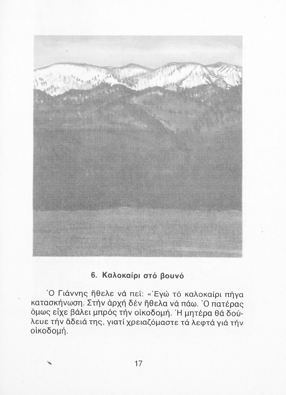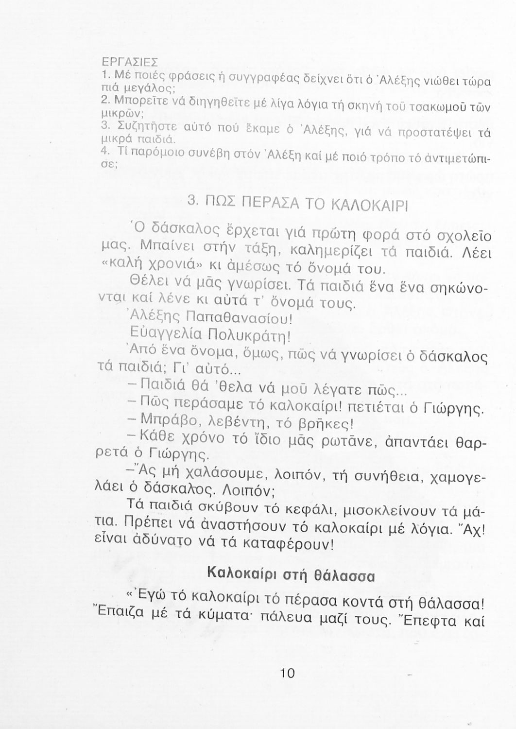 Αναγνωστικό Δ΄ Δημοτικού που περιέχει πεζά και ποιήματα με περιεχόμενο διδακτικό και ηθικοπλαστικό εμπνευσμένα από την αγροτική ζωή και κοινωνική ζωή, την ελληνική φύση και παράδοση, και τις ασχολίες των ανθρώπων. Περιλαμβάνει και σύντομα βιογραφικά σημειώματα των συγγραφέων.
