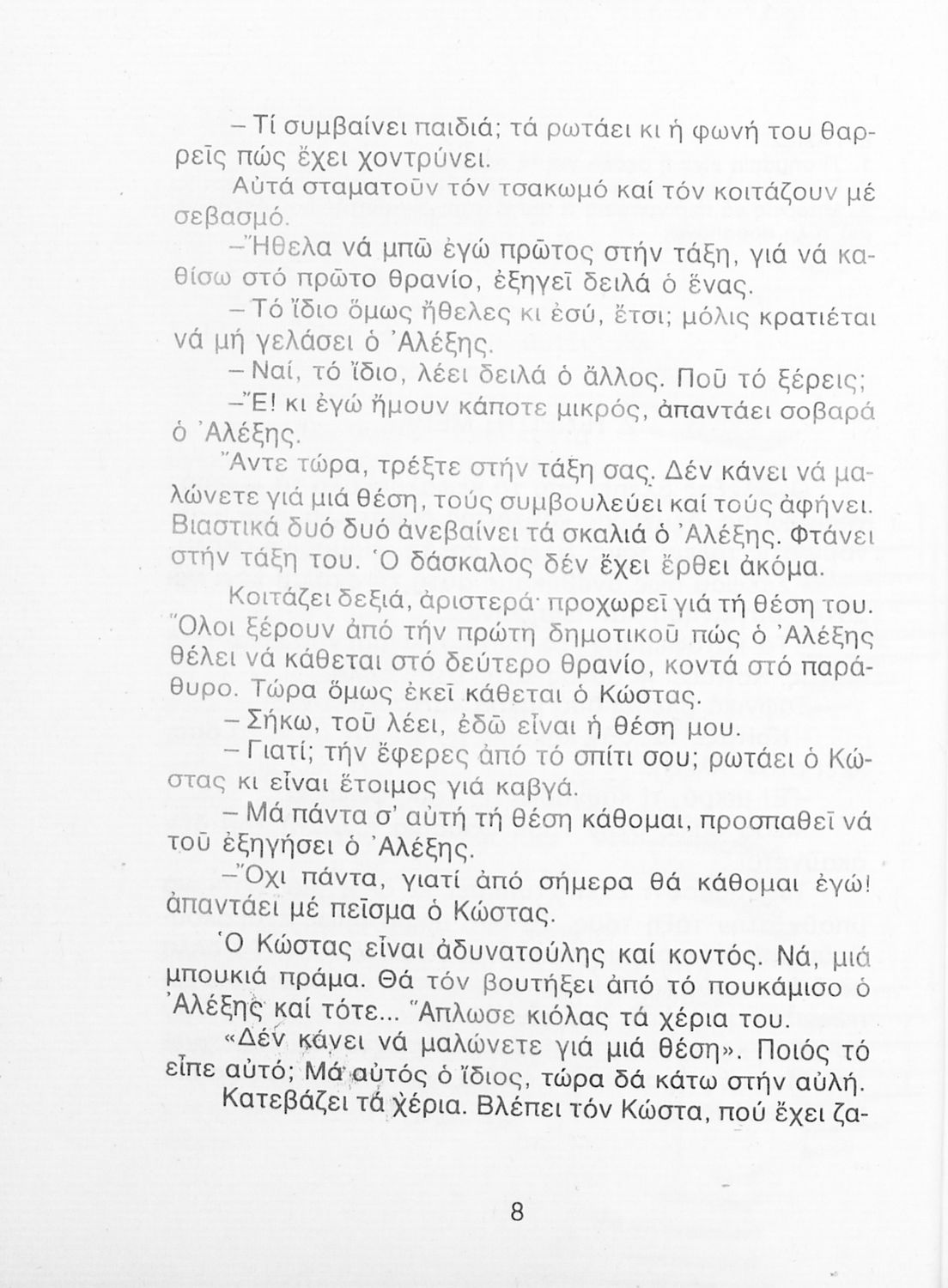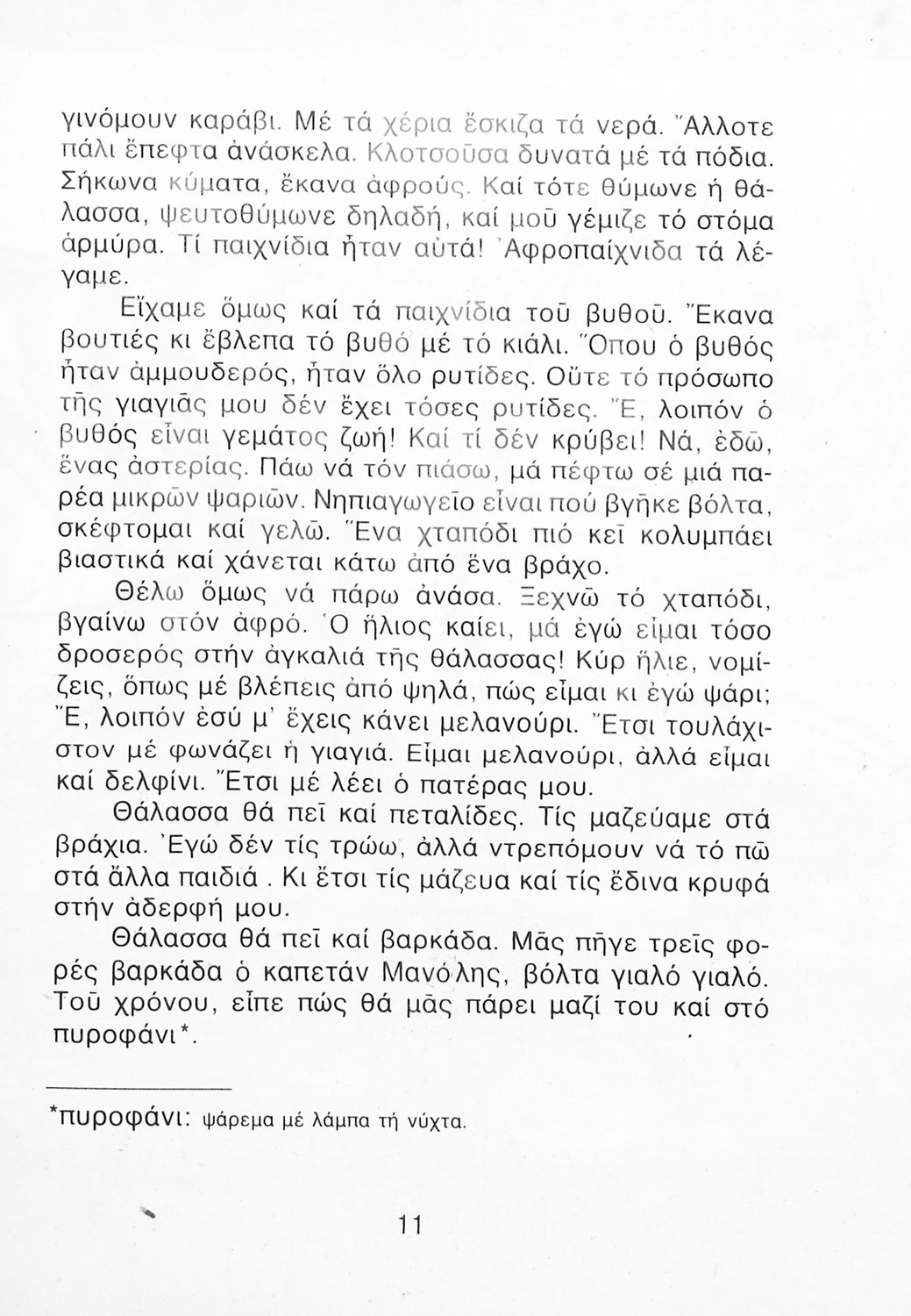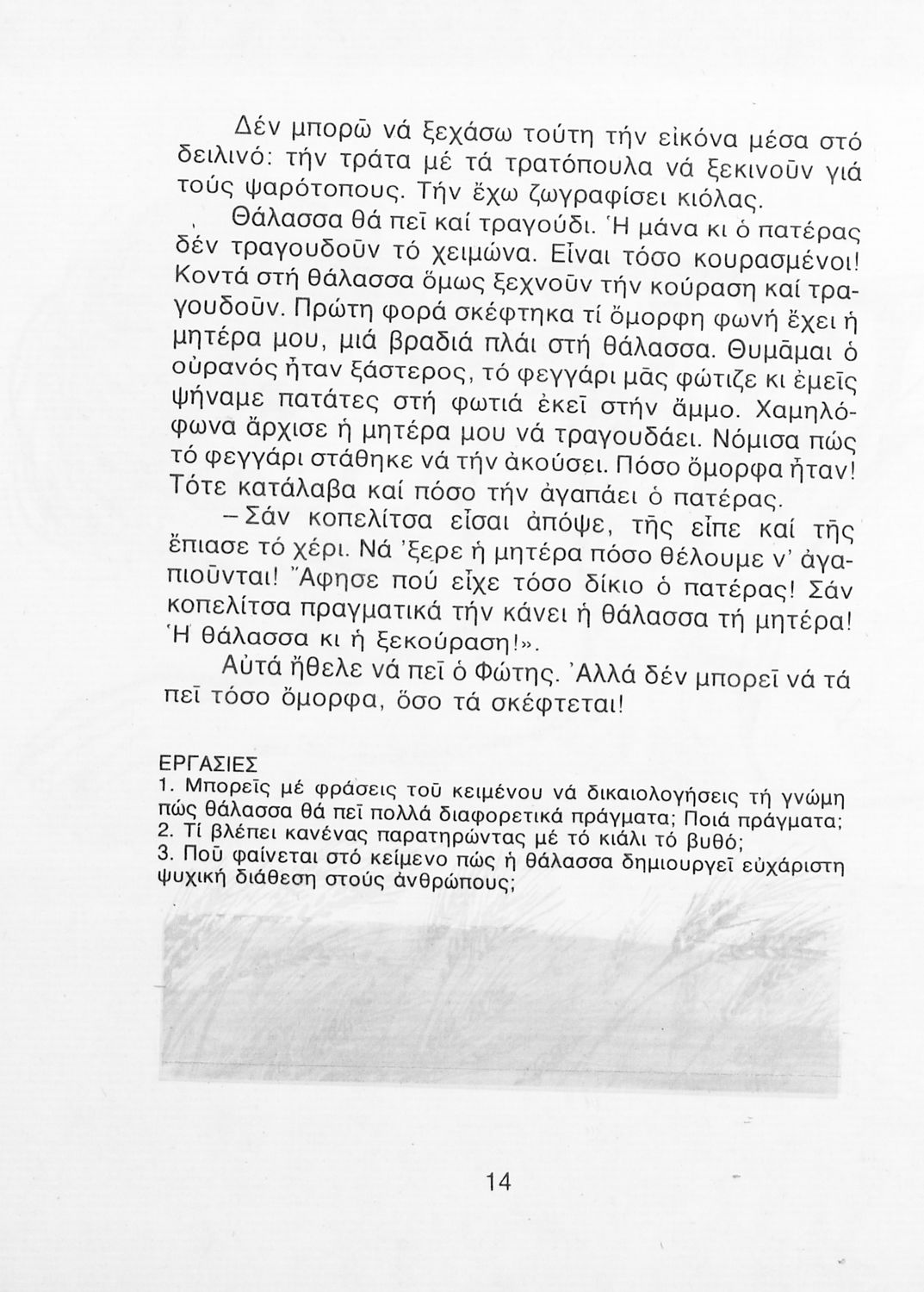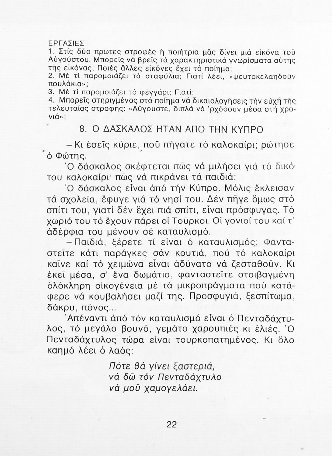 Αναγνωστικό Δ΄ Δημοτικού που περιέχει πεζά και ποιήματα με περιεχόμενο διδακτικό και ηθικοπλαστικό εμπνευσμένα από την αγροτική ζωή και κοινωνική ζωή, την ελληνική φύση και παράδοση, και τις ασχολίες των ανθρώπων. Περιλαμβάνει και σύντομα βιογραφικά σημειώματα των συγγραφέων.