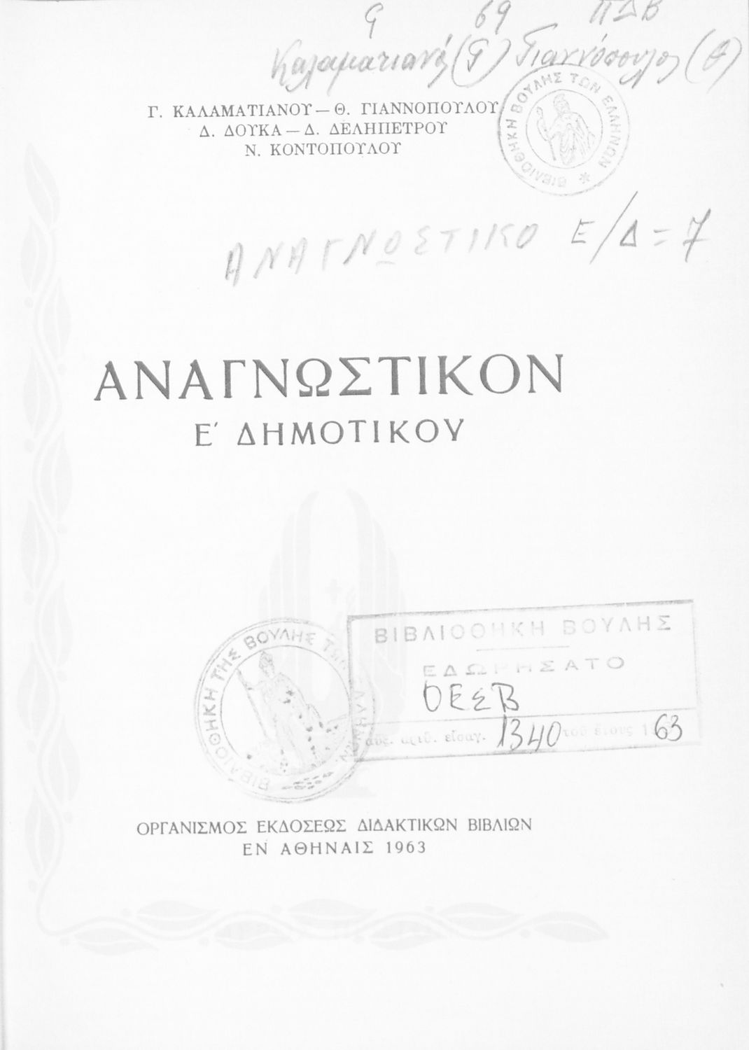Αναγνωστικό Ε΄ Δημοτικού που περιέχει πεζά και ποιήματα Ελλήνων λογοτεχνών για την εκμάθηση της ελληνικής γλώσσας.