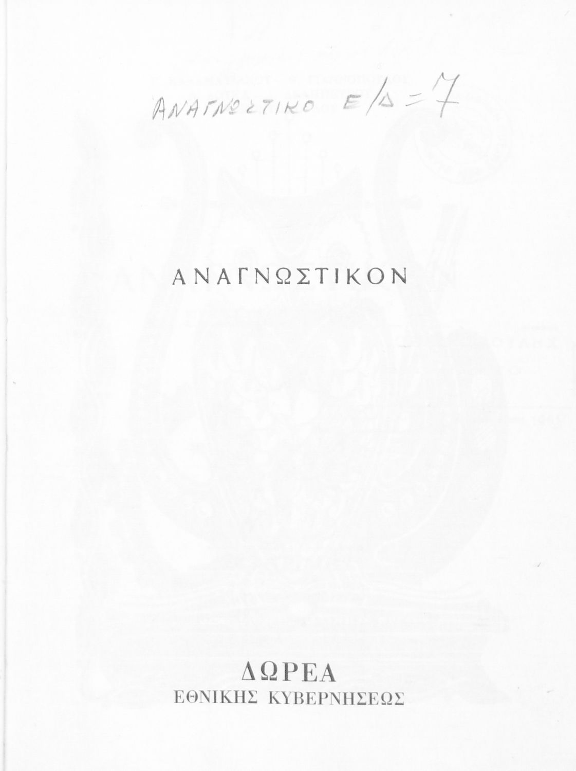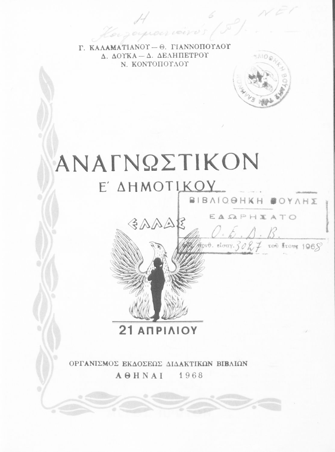 Βαθμίδα εκπαίδευσης: Πρωτοβάθμια Τάξη: Ε' Δημοτικού Μάθημα: Νέα Ελληνικά Γλώσσα: Απλή καθαρεύουσα Παρουσίαση περιεχομένου: Αναγνωστικό Ε΄ Δημοτικού που περιέχει κείμενα εμπνευσμένα από την εθνική, κοινωνική και οικογενειακή ζωή και την ελληνική φύση, μυθολογία και ιστορία. |