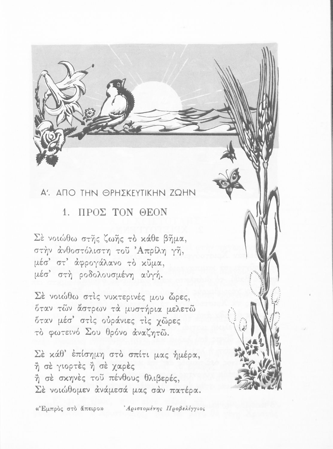 Αναγνωστικό Ε΄ Δημοτικού που περιέχει κείμενα εμπνευσμένα από την εθνική, κοινωνική και οικογενειακή ζωή και την ελληνική φύση, μυθολογία και ιστορία.