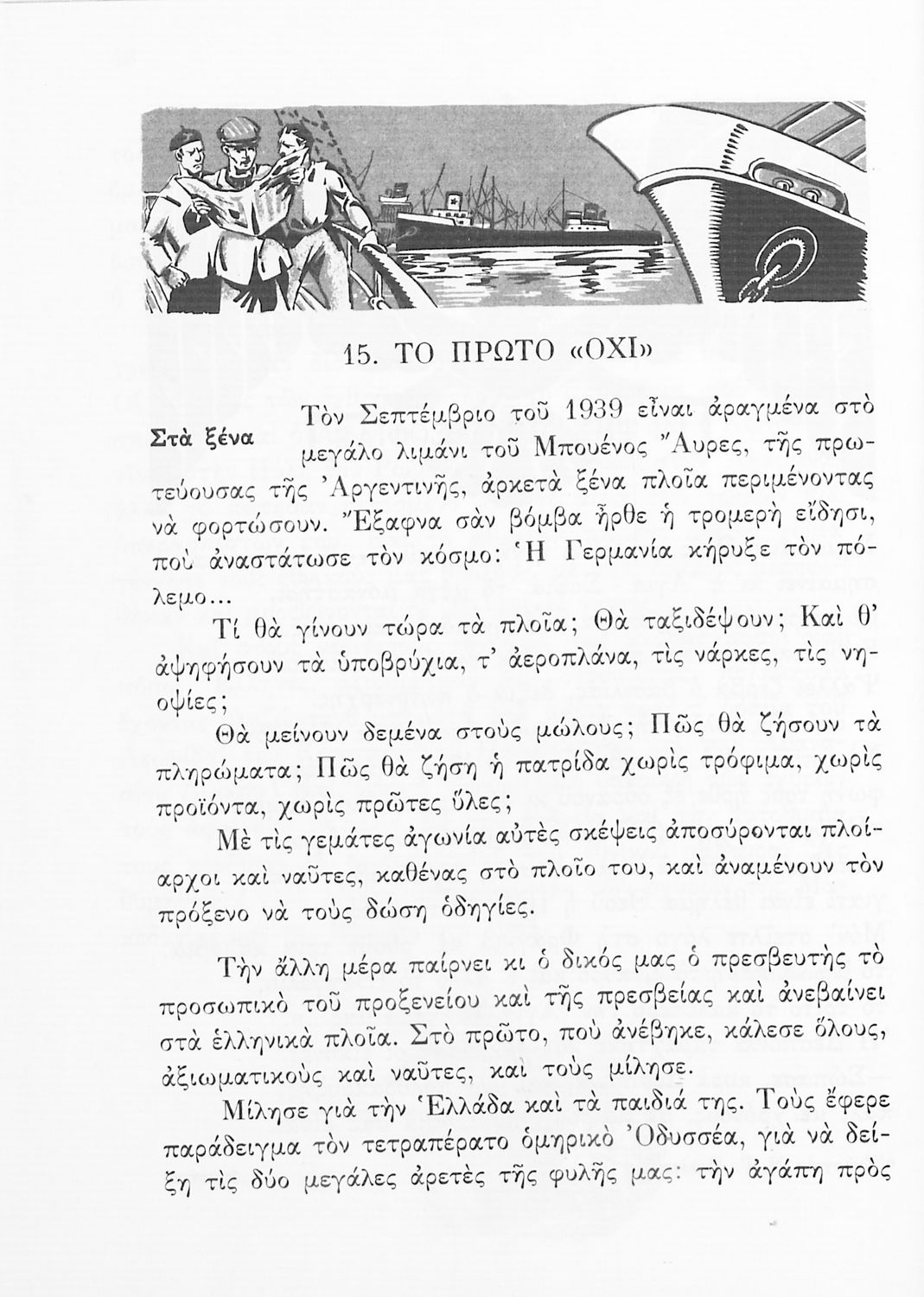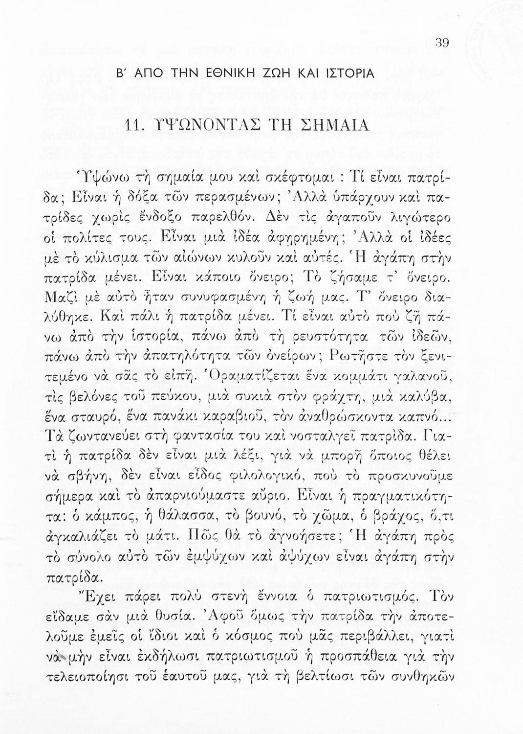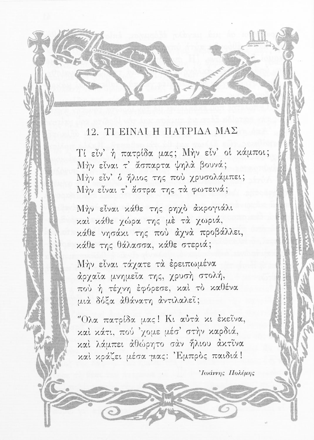 Αναγνωστικό Ε΄ Δημοτικού που περιέχει κείμενα εμπνευσμένα από την εθνική, κοινωνική και οικογενειακή ζωή και την ελληνική φύση, μυθολογία και ιστορία. Φέρει το σύμβολο της δικτατορίας.