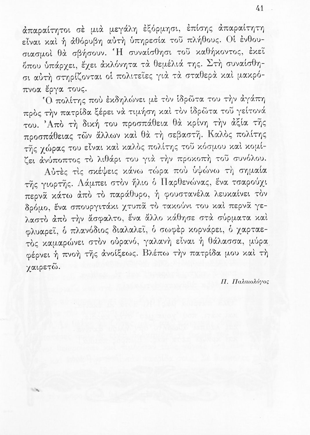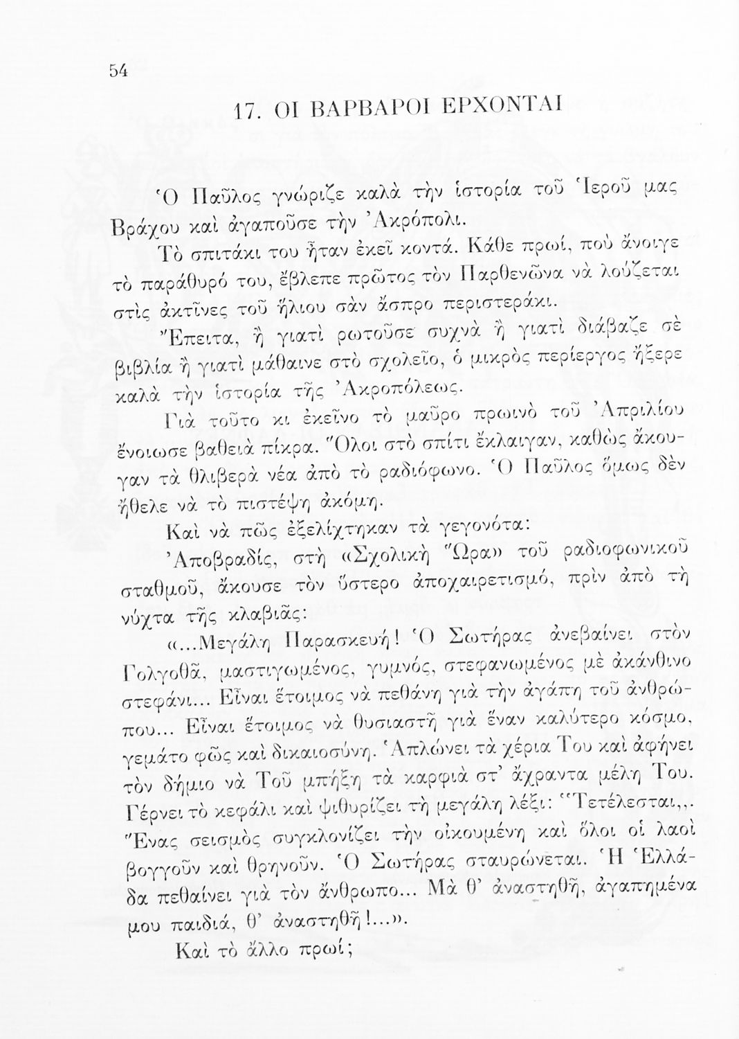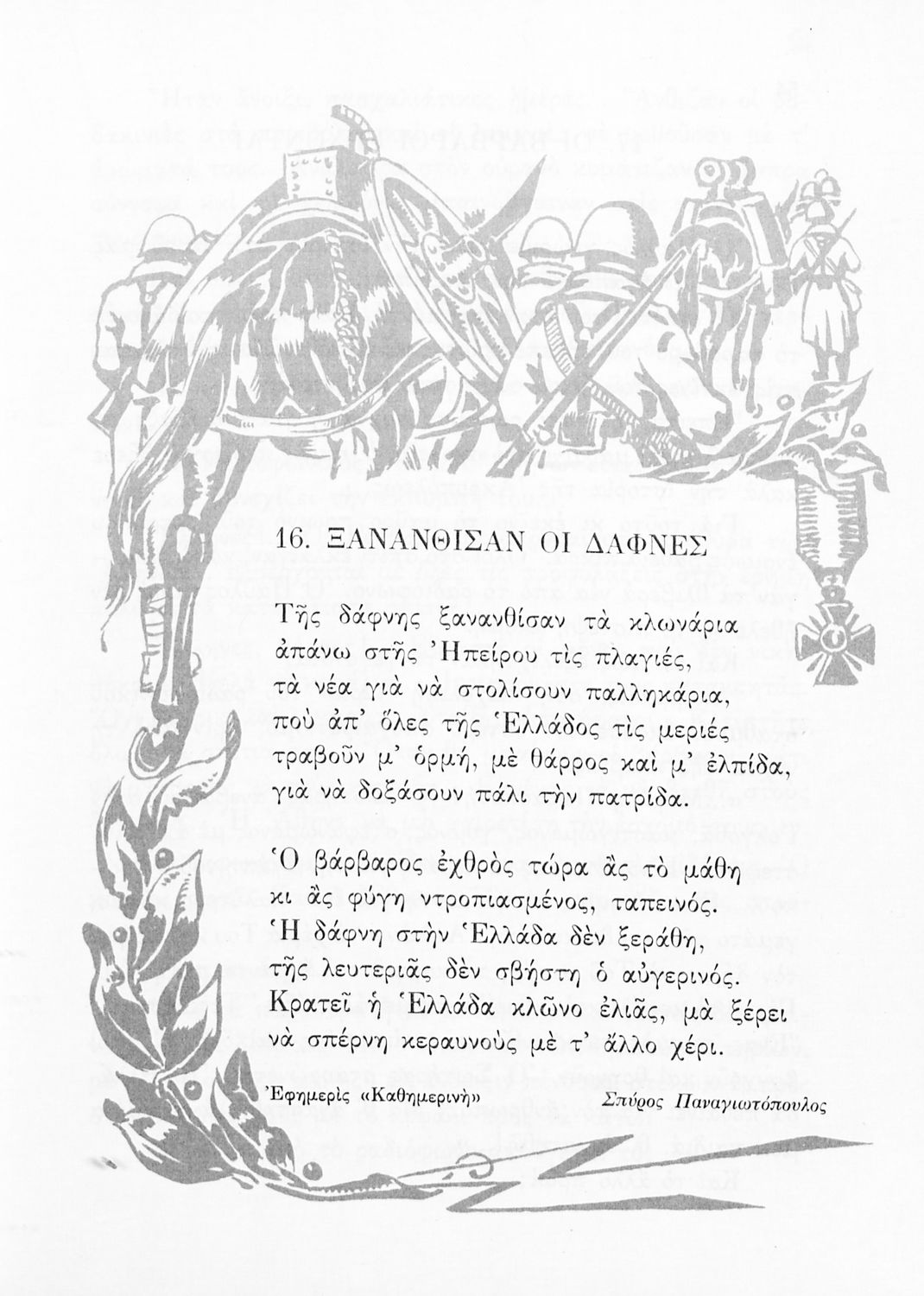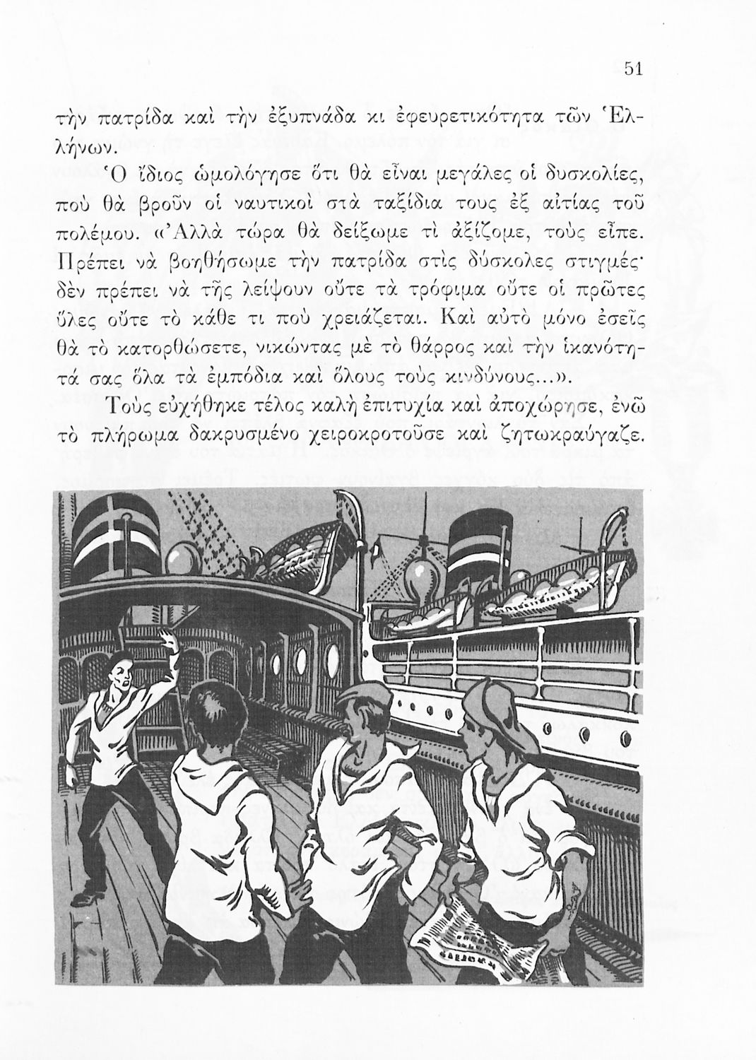 Αναγνωστικό Ε΄ Δημοτικού που περιέχει κείμενα εμπνευσμένα από την εθνική, κοινωνική και οικογενειακή ζωή και την ελληνική φύση, μυθολογία και ιστορία. Φέρει το σύμβολο της δικτατορίας.