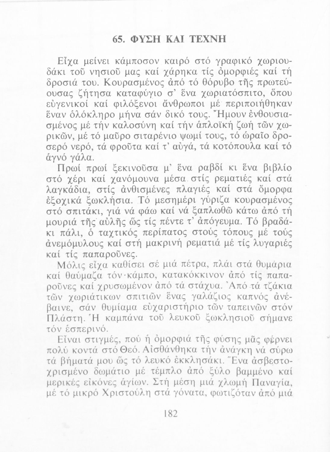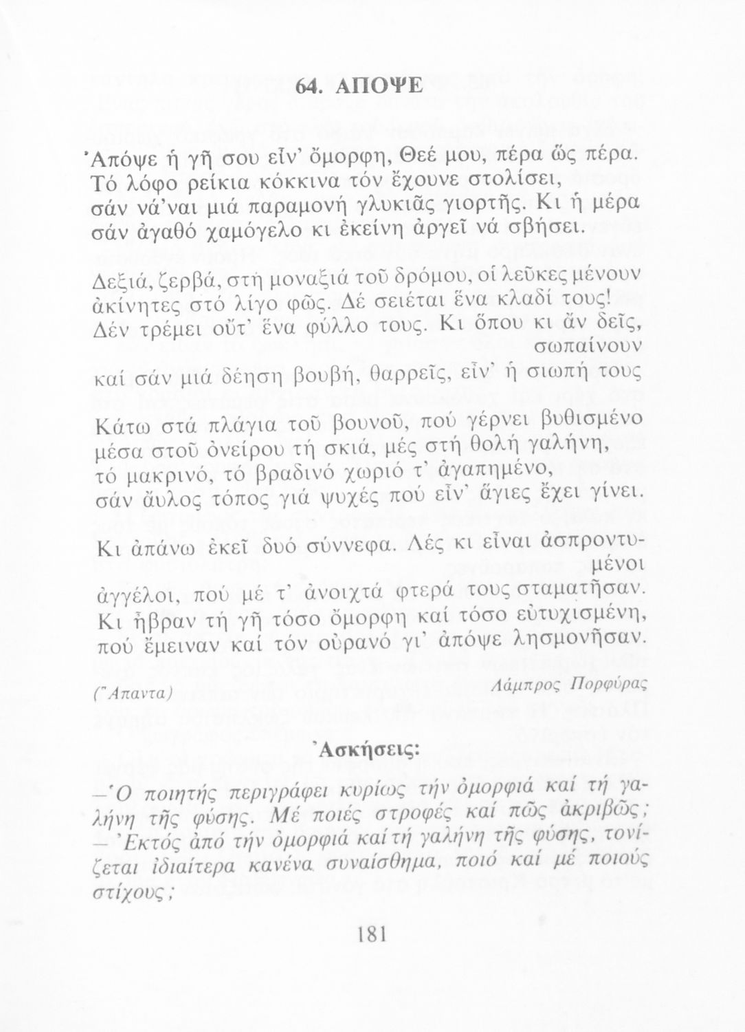 Αναγνωστικό Ε' Δημοτικού που περιλαμβάνει ποιήματα και πεζά εμπνευσμένα από τη ζωή στην ύπαιθρο, την εθνική, θρησκευτική και κοινωνική ζωή, η ζωή, τις ασχολίες των ανθρώπων, και την ελληνική φύση.