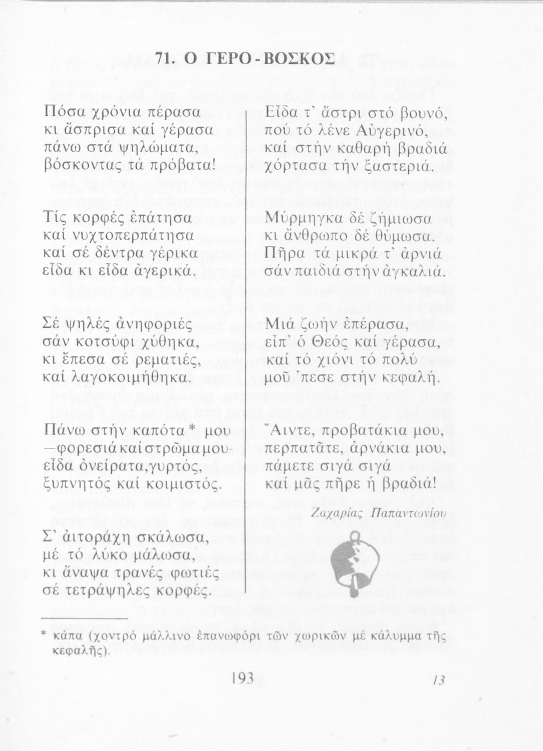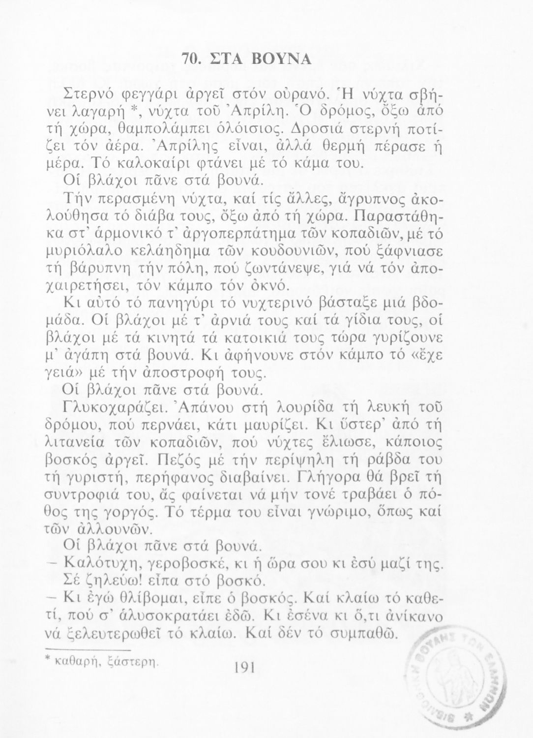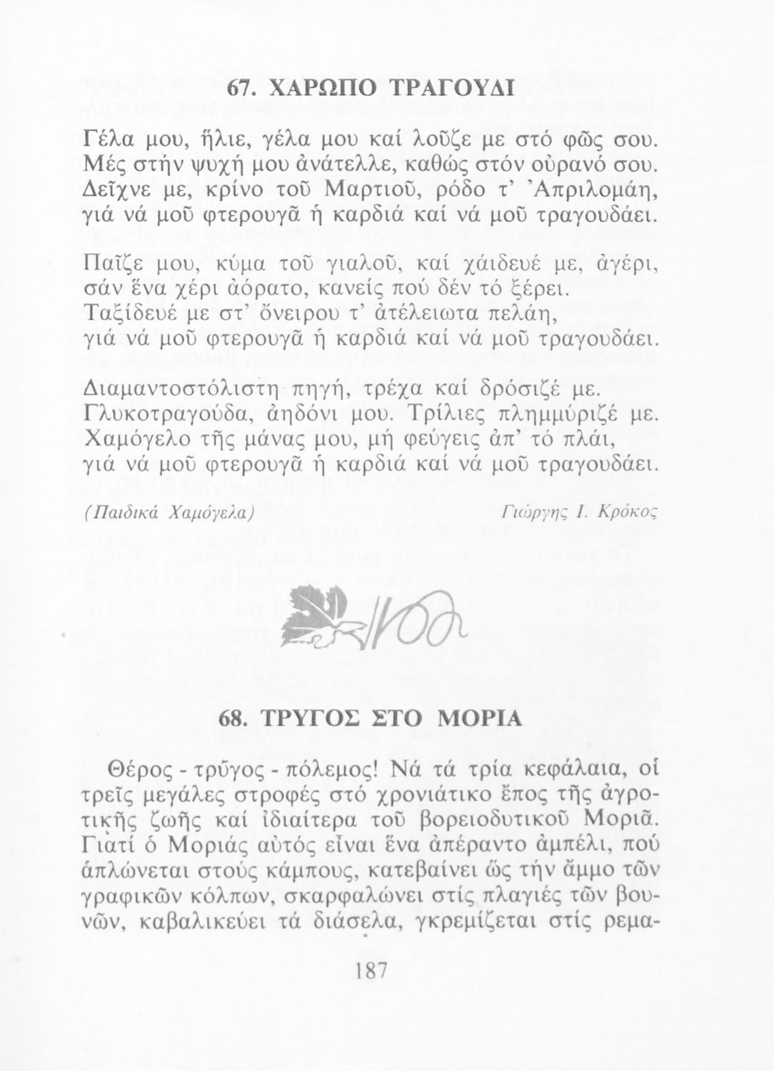Αναγνωστικό για την Δ΄ τάξη του Δημοτικού. Περιλαμβάνει ένα κείμενο στο οποίο παρεμβάλλονται ποιήματα δημοτικά και Ελλήνων ποιητών.