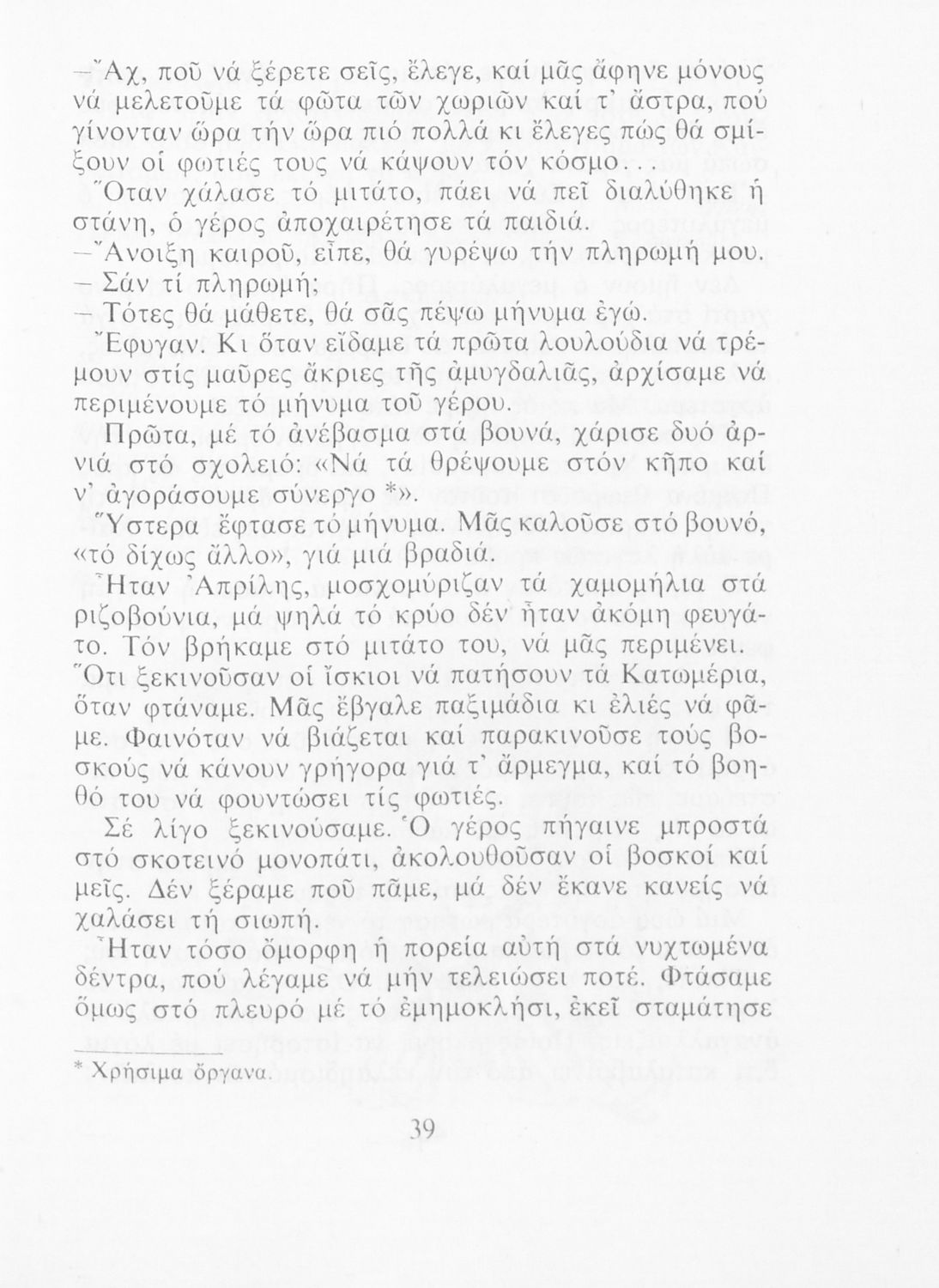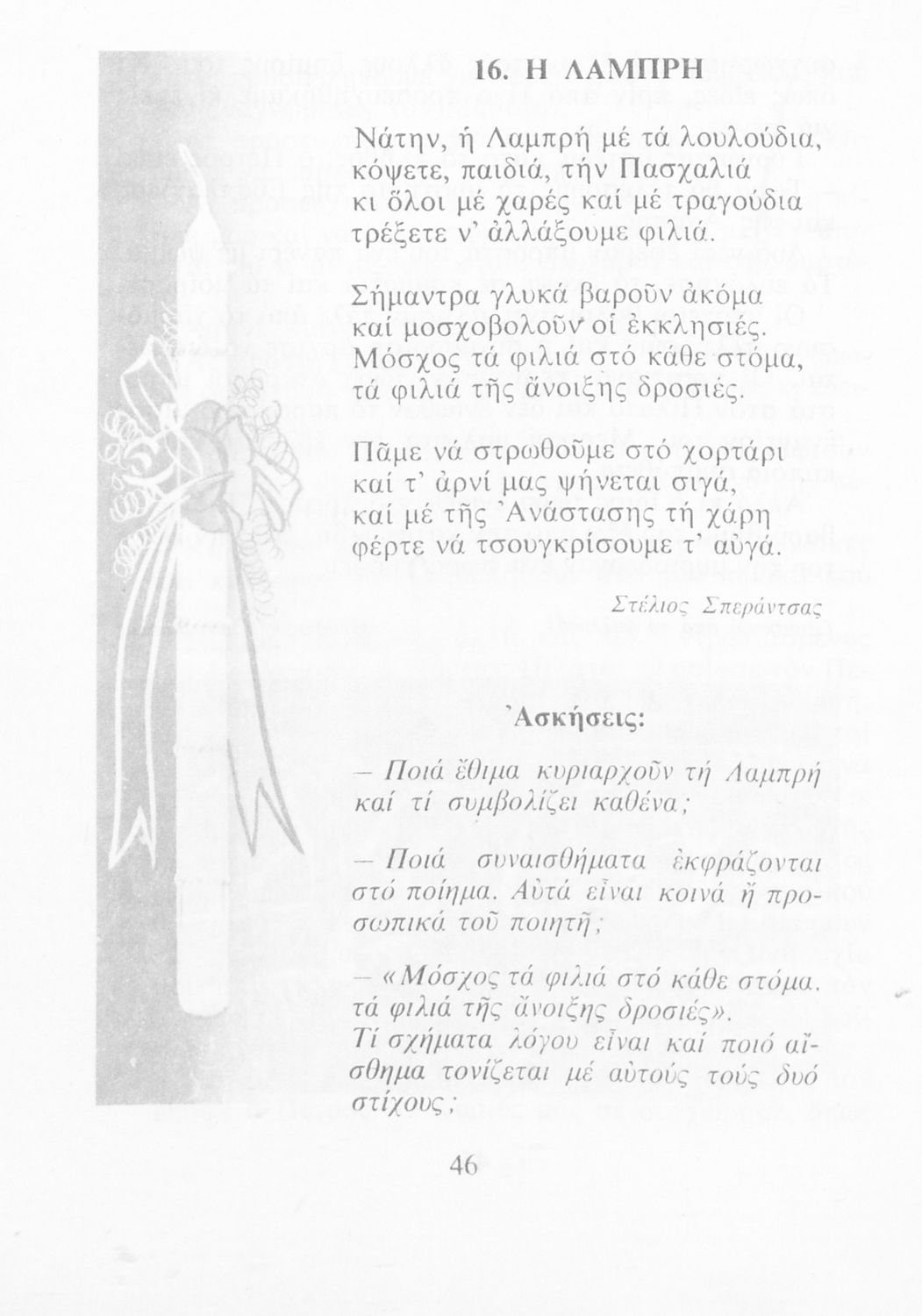 Αναγνωστικό για την Δ΄ τάξη του Δημοτικού. Περιλαμβάνει ένα κείμενο στο οποίο παρεμβάλλονται ποιήματα δημοτικά και Ελλήνων ποιητών.