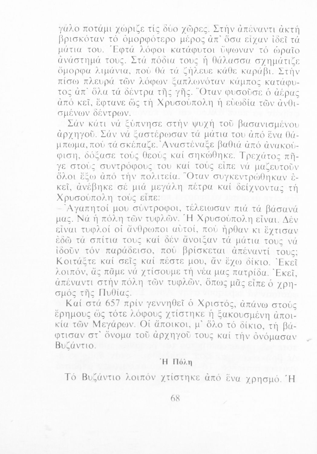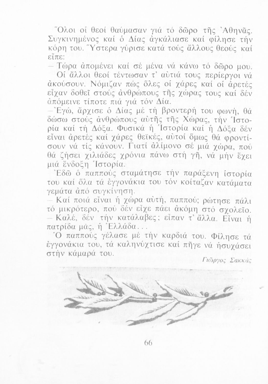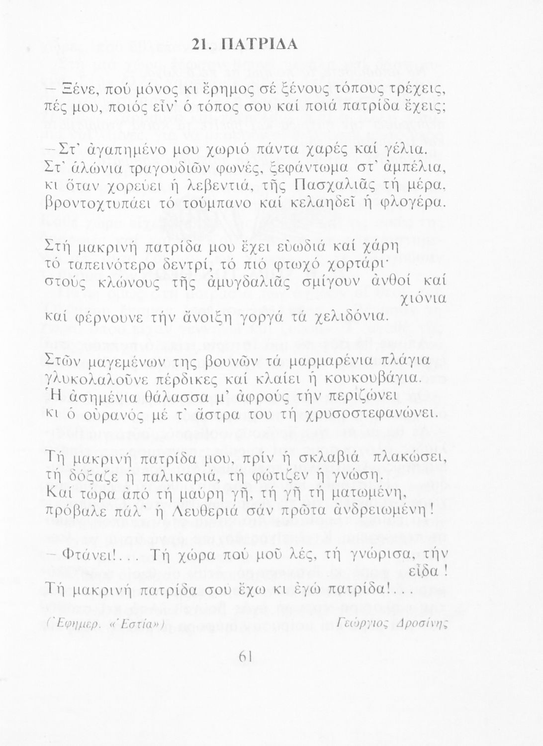 Αναγνωστικό για την Δ΄ τάξη του Δημοτικού. Περιλαμβάνει ένα κείμενο στο οποίο παρεμβάλλονται ποιήματα δημοτικά και Ελλήνων ποιητών.