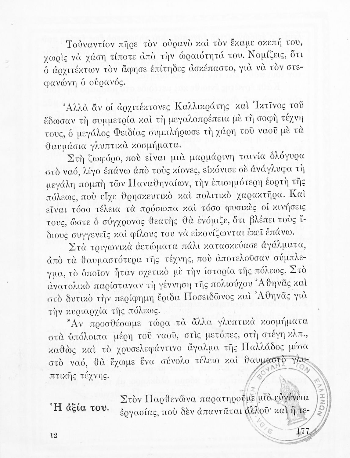 Αναγνωστικό ΣΤ΄ Δημοτικού που περιέχει πεζά και ποιήματα εμπνευσμένα από τη θρησκευτική, εθνική, κοινωνική και ατομική ζωή, την ελληνική φύση, ιστορία και μυθολογία και την υγιεινή.