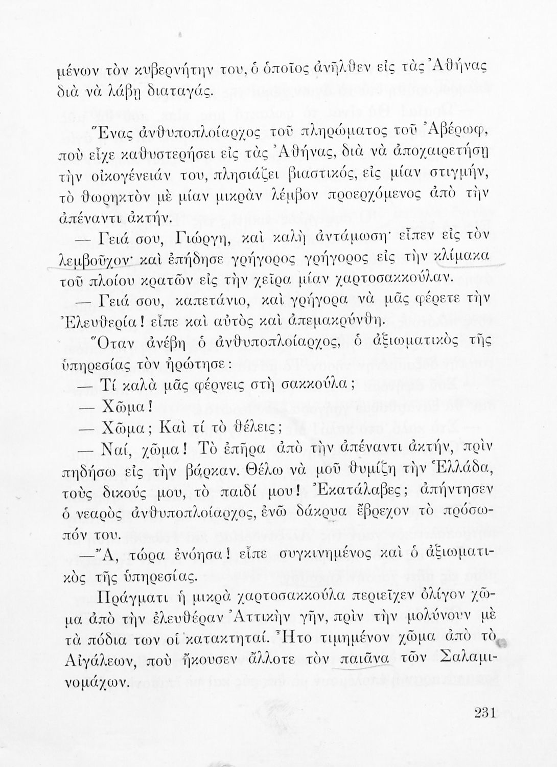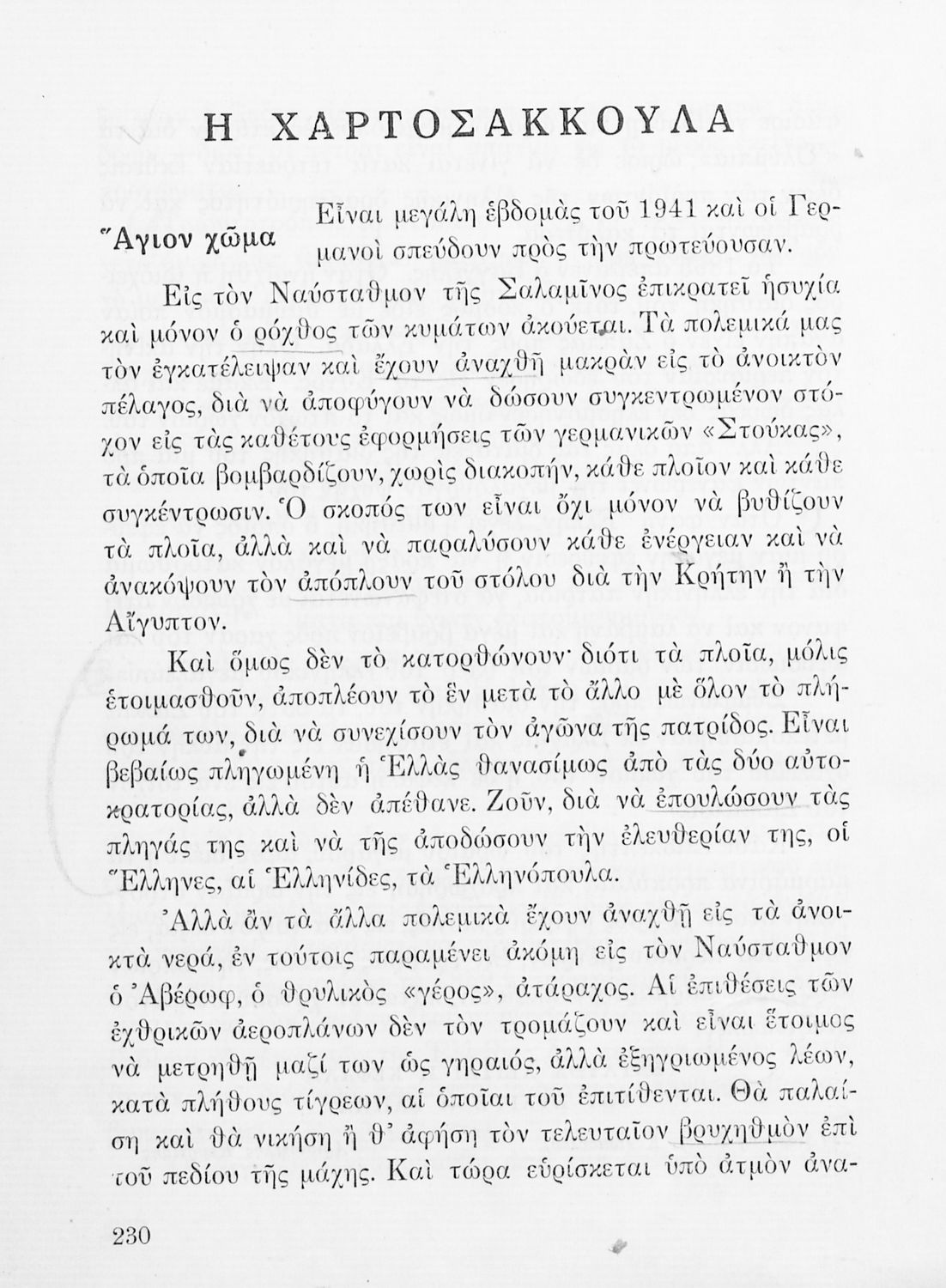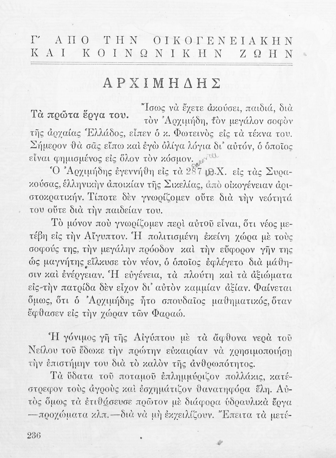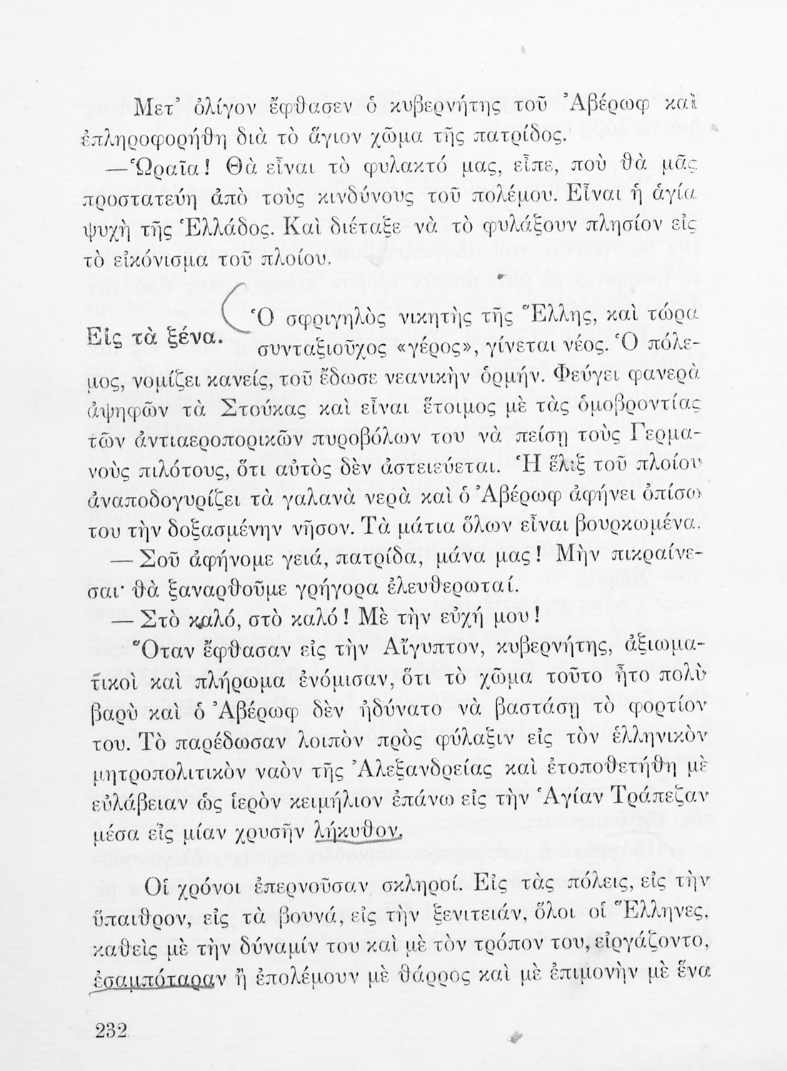 Αναγνωστικό ΣΤ΄ Δημοτικού που περιλαμβάνει θέματα από τις ελληνικές παραδόσεις και μύθους, την ελληνική φύση και θάλασσα και το τρίπτυχο "Πατρίς-θρησκεία-οικογένειαα".