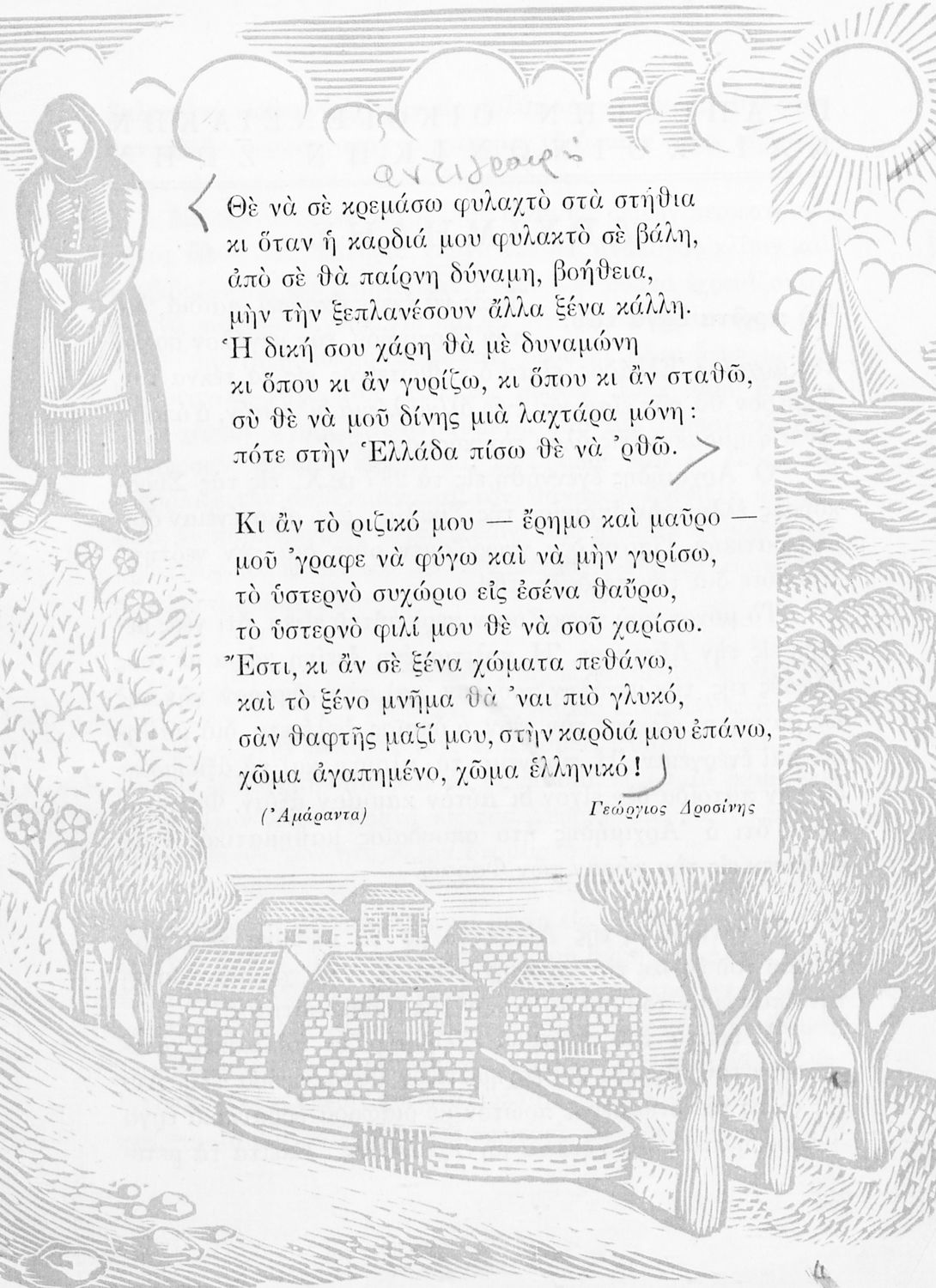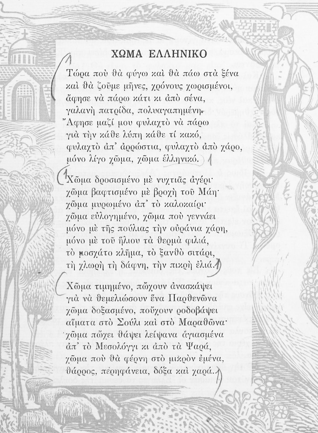 Αναγνωστικό ΣΤ΄ Δημοτικού που περιλαμβάνει ποιήματα και πεζά με θέματα από την οικογενειακή, κοινωνική και θρησκευτική ζωή των Ελλήνων και την ελληνική φύση και ιστορία.