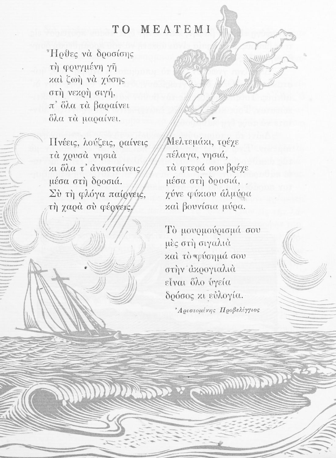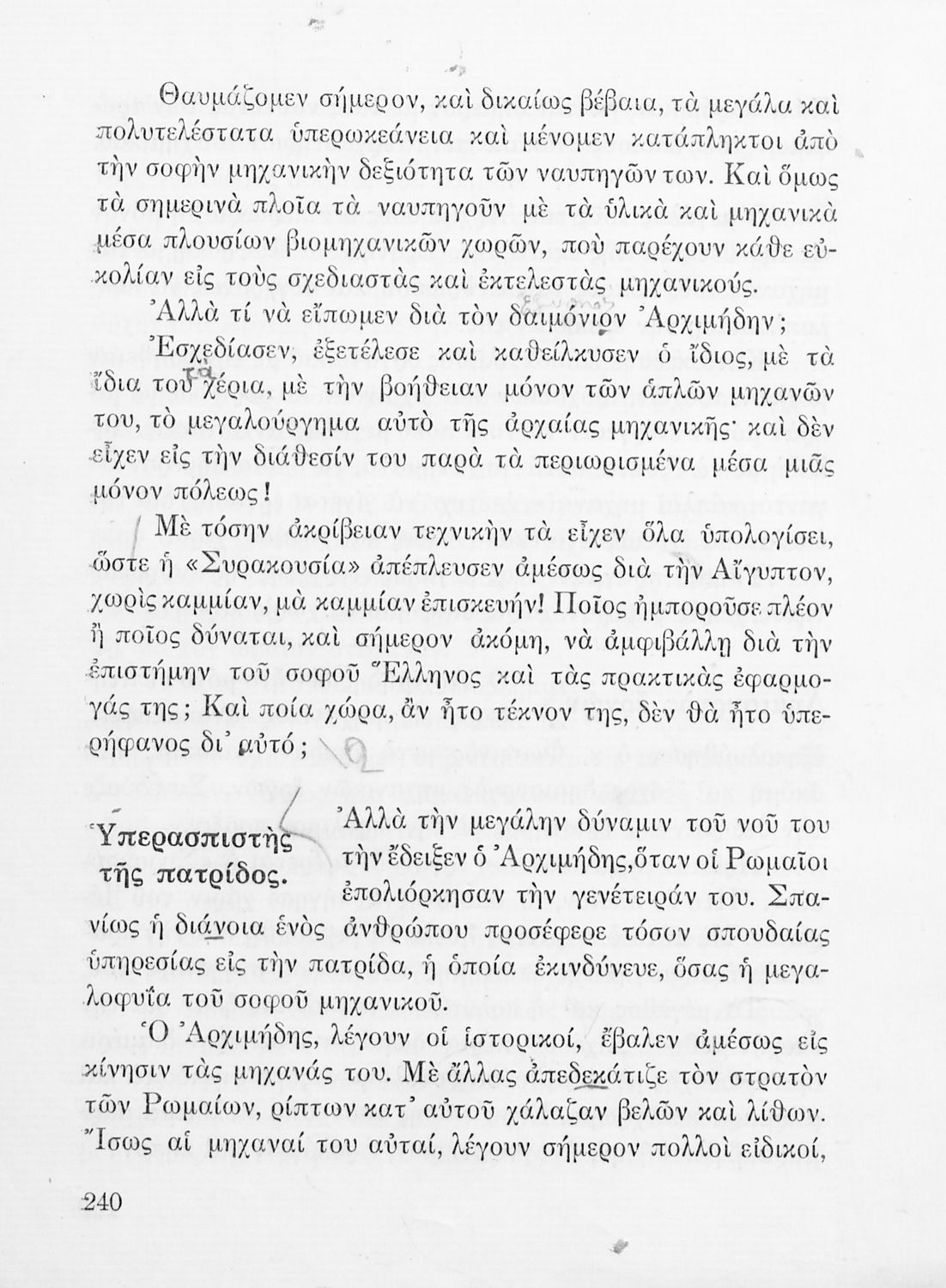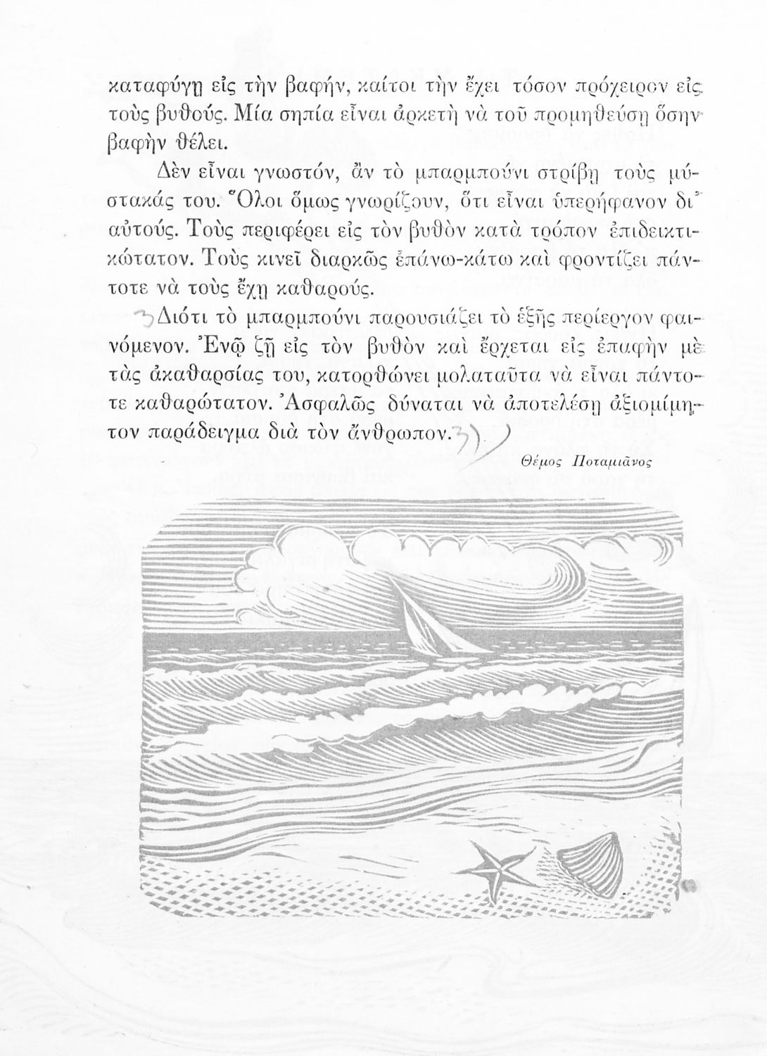 Αναγνωστικό ΣΤ΄ Δημοτικού που περιλαμβάνει θέματα από τις ελληνικές παραδόσεις και μύθους, την ελληνική φύση και θάλασσα και το τρίπτυχο "Πατρίς-θρησκεία-οικογένειαα".