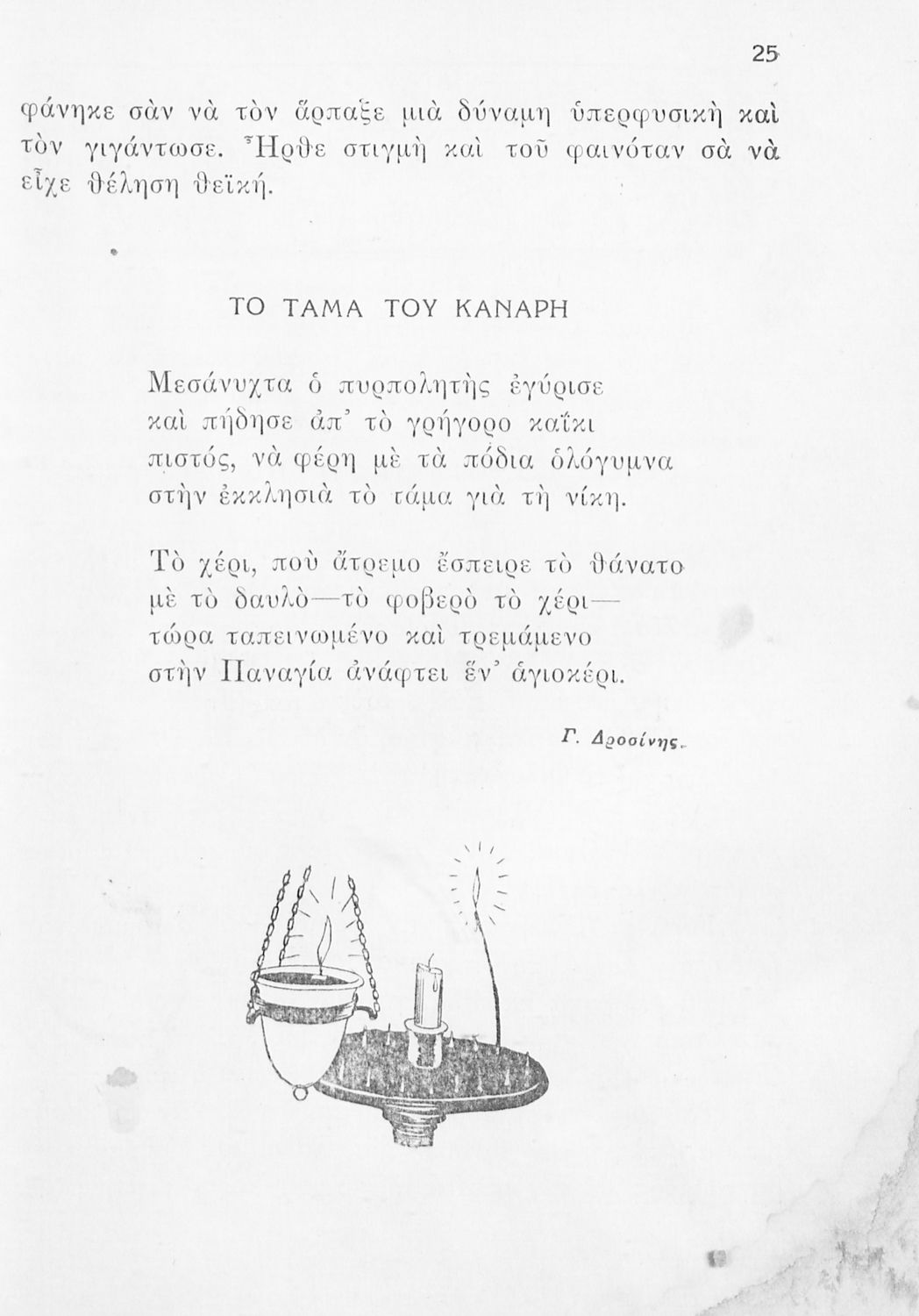Αναγνωστικό Γ' Δημοτικού που περιέχει πεζά και ποιήματα εμπνευσμένα από τη θρησκευτική, εθνική, κοινωνική και ατομική ζωή, και την ελληνική φύση, ιστορία και μυθολογία.