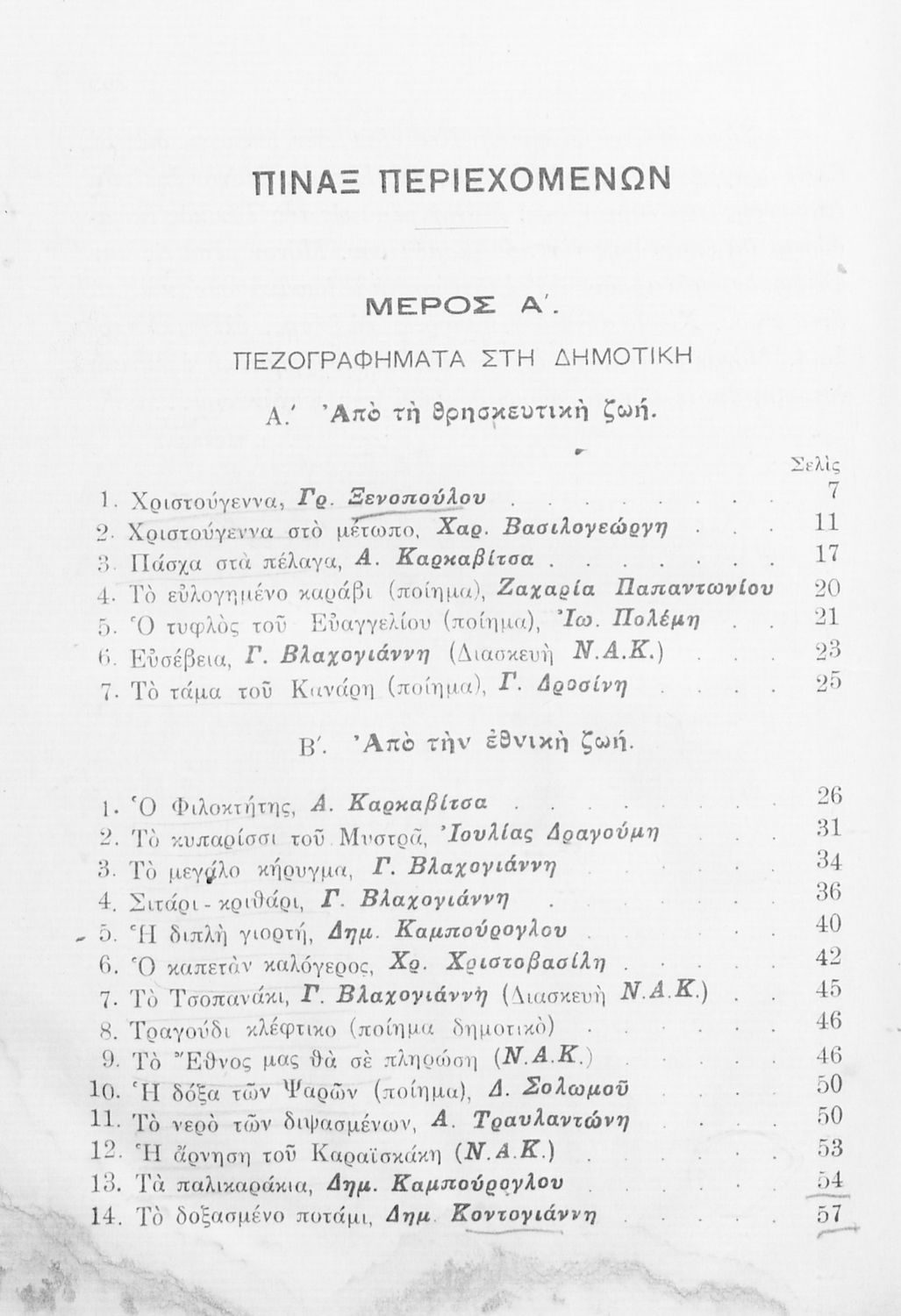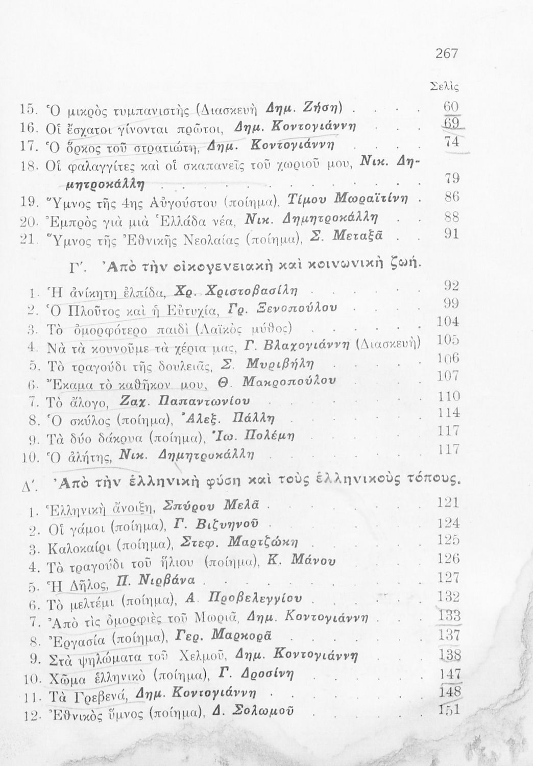 Αναγνωστικό Γ' Δημοτικού που περιέχει πεζά και ποιήματα εμπνευσμένα από τη θρησκευτική, εθνική, κοινωνική και ατομική ζωή, και την ελληνική φύση, ιστορία και μυθολογία.