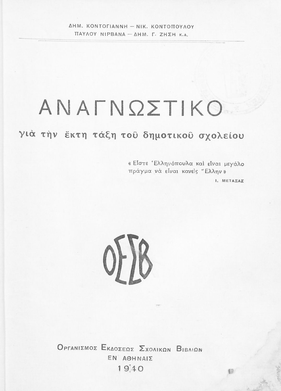 Αναγνωστικό ΣΤ΄ Δημοτικού που περιλαμβάνει πεζά κείμενα και ποιήματα με περιεχόμενο εθνικό, θρησκευτικό και ηθικό.