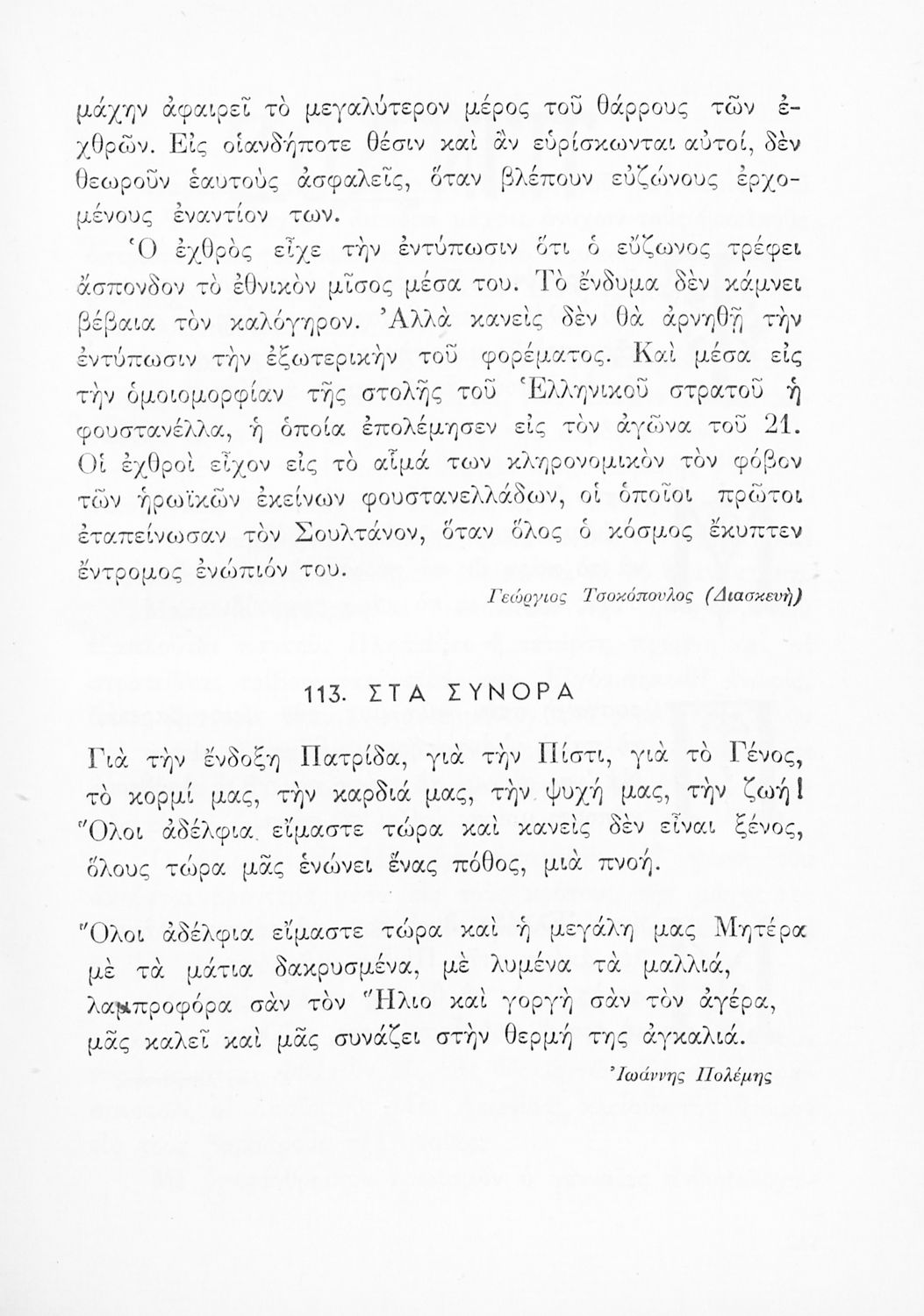 Αναγνωστικό ΣΤ΄ Δημοτικού που αντλεί τα θέματά του από τη θρησκευτική, εθνική, οικογενειακή, κοινωνική και επαγγελματική ζωή και την σύγχρονη ελληνική ιστορία. Φέρει το σύμβολο της δικτατορίας.