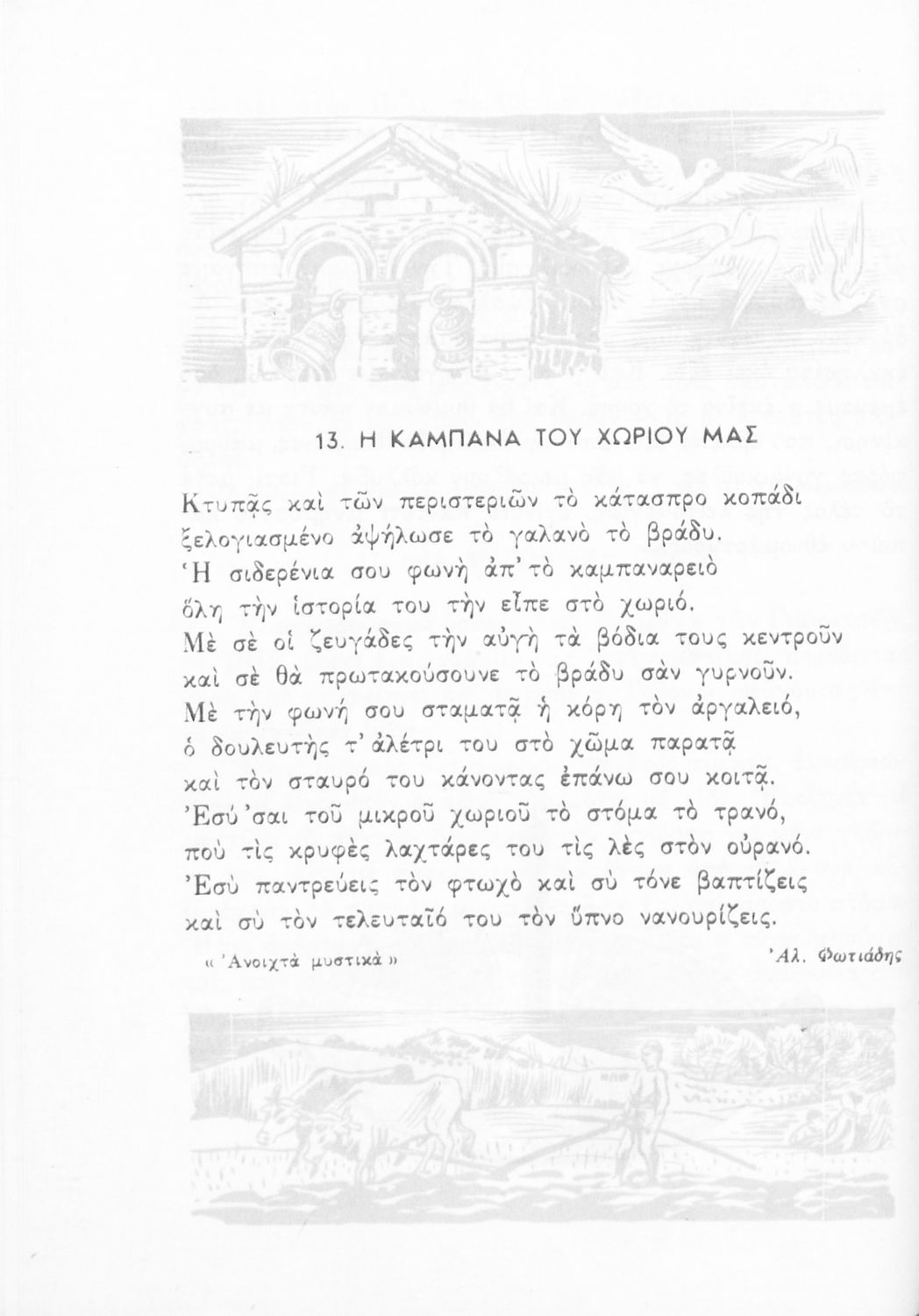 Αναγνωστικό ΣΤ΄ Δημοτικού που αντλεί τα θέματά του από τη θρησκευτική, εθνική, οικογενειακή, κοινωνική και επαγγελματική ζωή και την σύγχρονη ελληνική ιστορία.