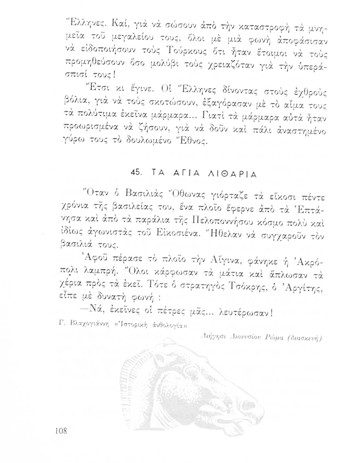Αναγνωστικό ΣΤ΄ Δημοτικού που περιλαμβάνει θέματα από τις ελληνικές παραδόσεις και μύθους, την ελληνική φύση και θάλασσα και το τρίπτυχο "Πατρίς-θρησκεία-οικογένειαα".