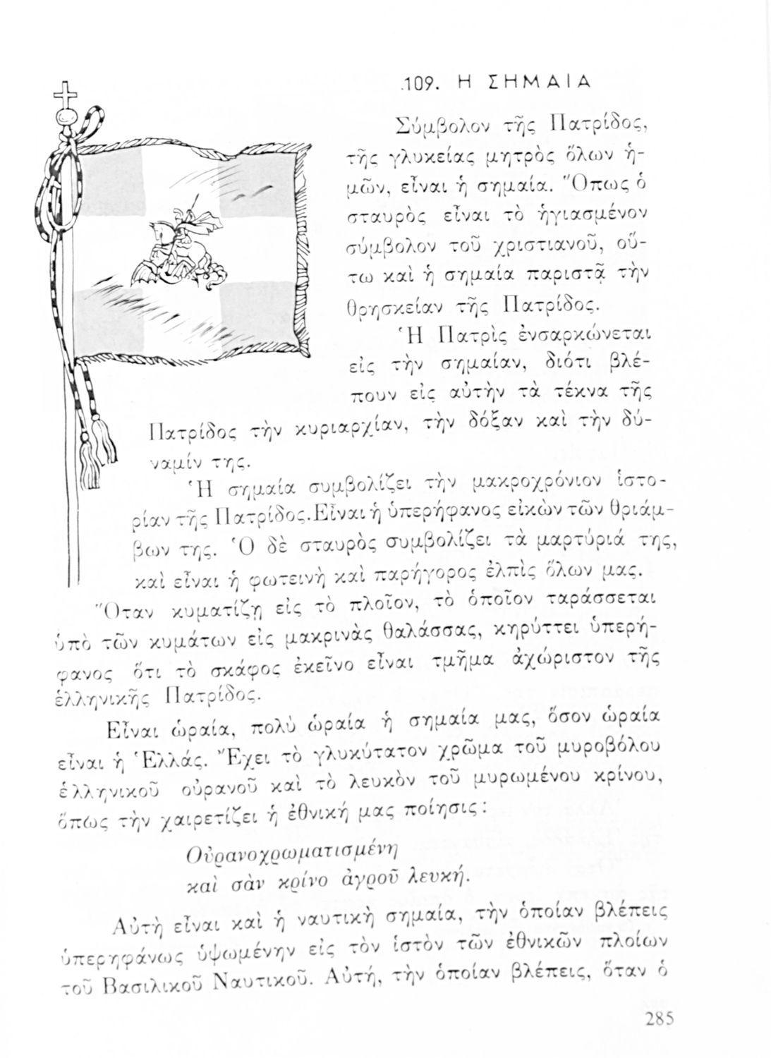 Αναγνωστικό ΣΤ΄ Δημοτικού που περιλαμβάνει θέματα από τις ελληνικές παραδόσεις και μύθους, την ελληνική φύση και θάλασσα και το τρίπτυχο "Πατρίς-θρησκεία-οικογένειαα".