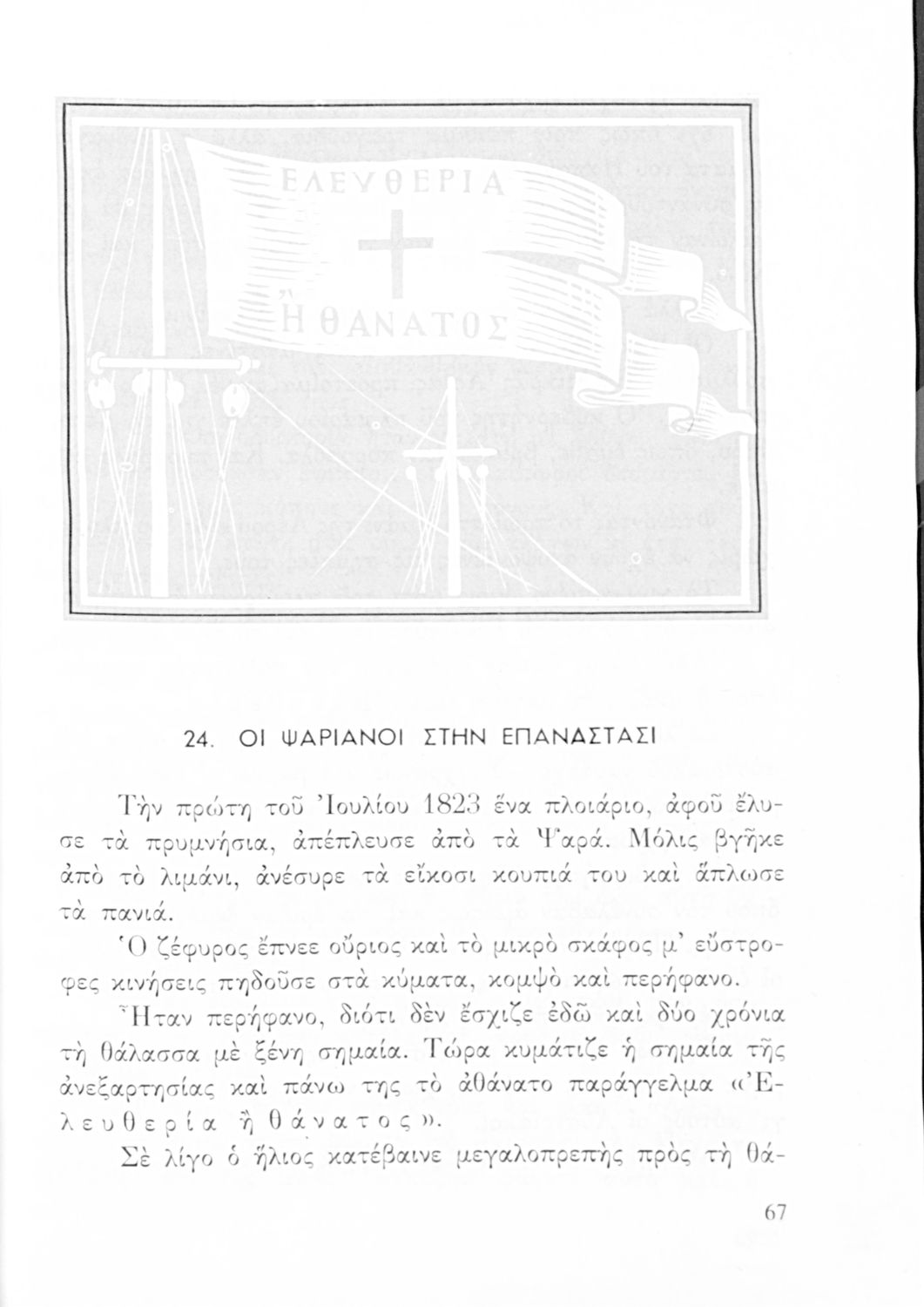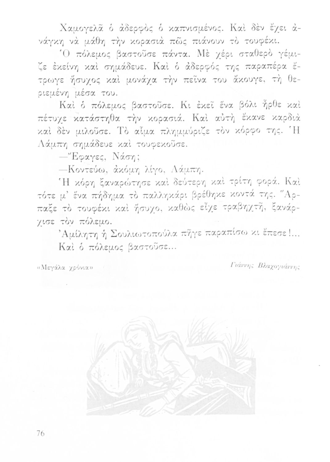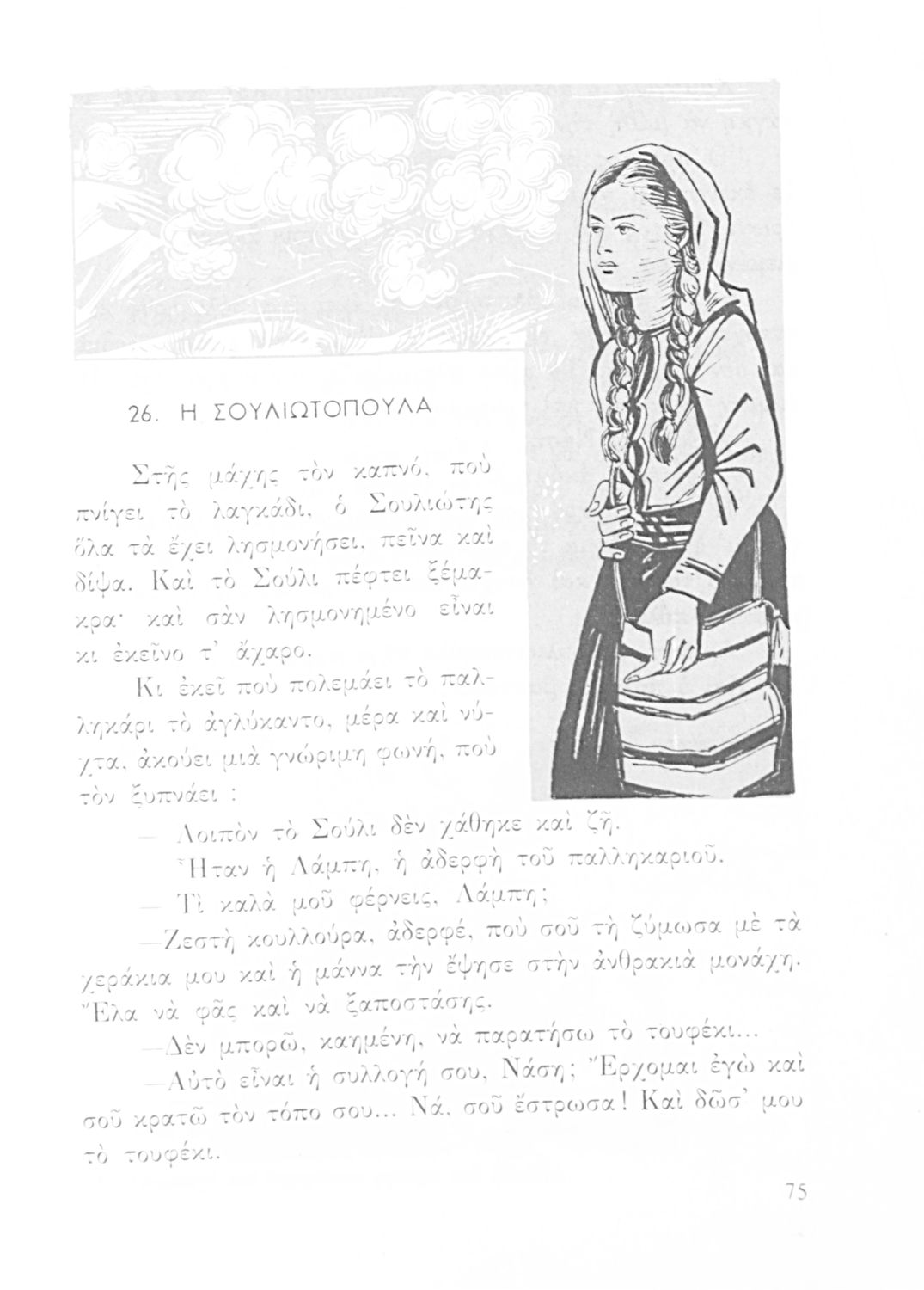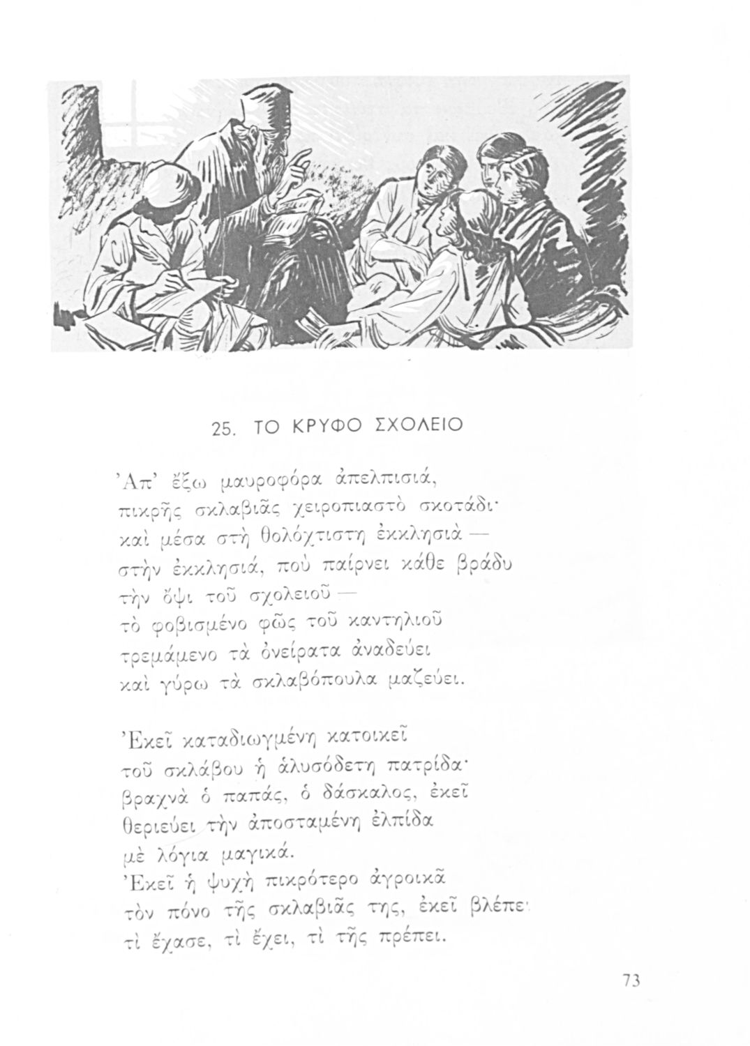 Αναγνωστικό ΣΤ΄ Δημοτικού που περιλαμβάνει θέματα από τις ελληνικές παραδόσεις και μύθους, την ελληνική φύση και θάλασσα και το τρίπτυχο "Πατρίς-θρησκεία-οικογένειαα".