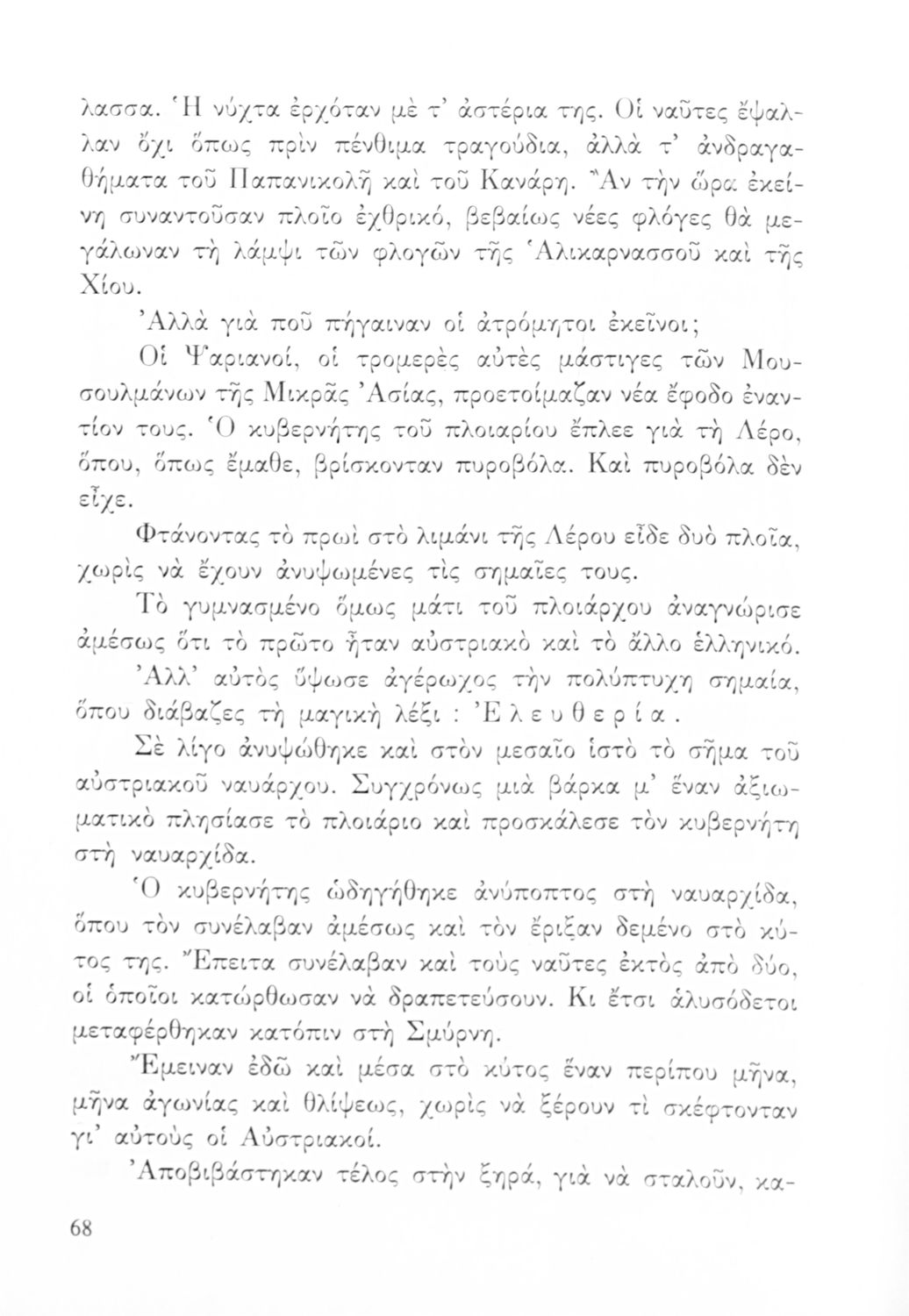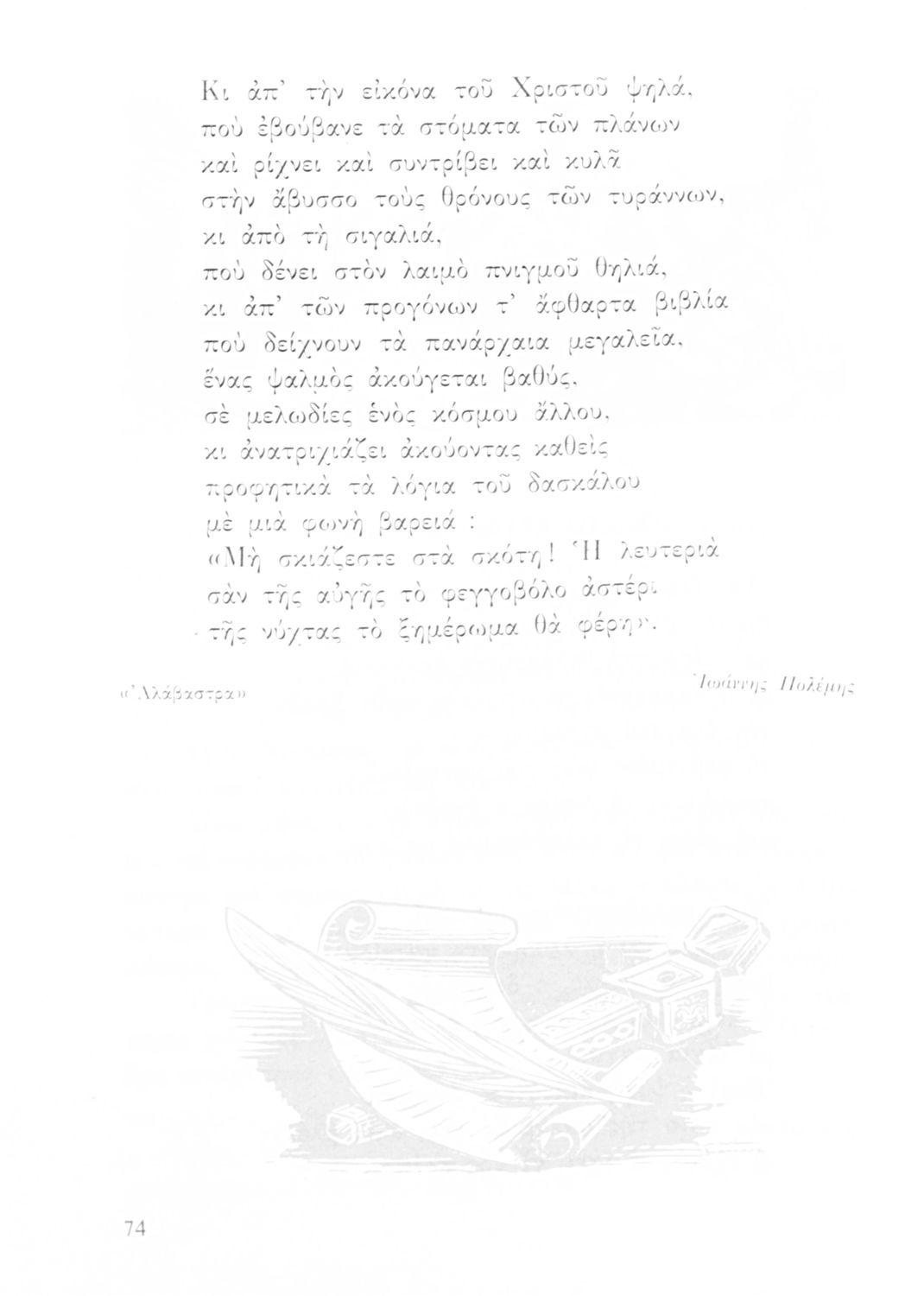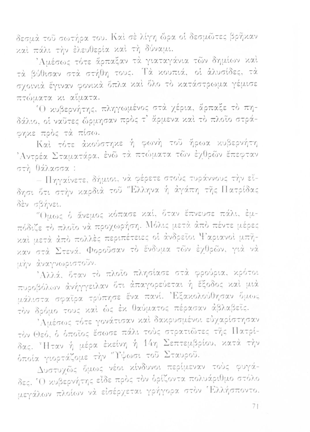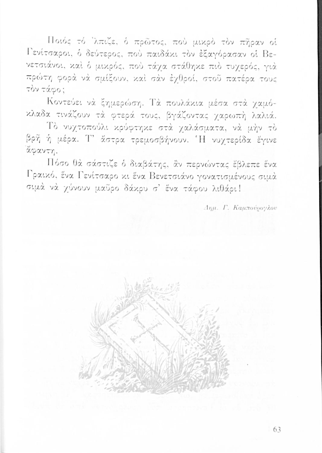 Αναγνωστικό ΣΤ΄ Δημοτικού που περιλαμβάνει θέματα από τις ελληνικές παραδόσεις και μύθους, την ελληνική φύση και θάλασσα και το τρίπτυχο "Πατρίς-θρησκεία-οικογένειαα".