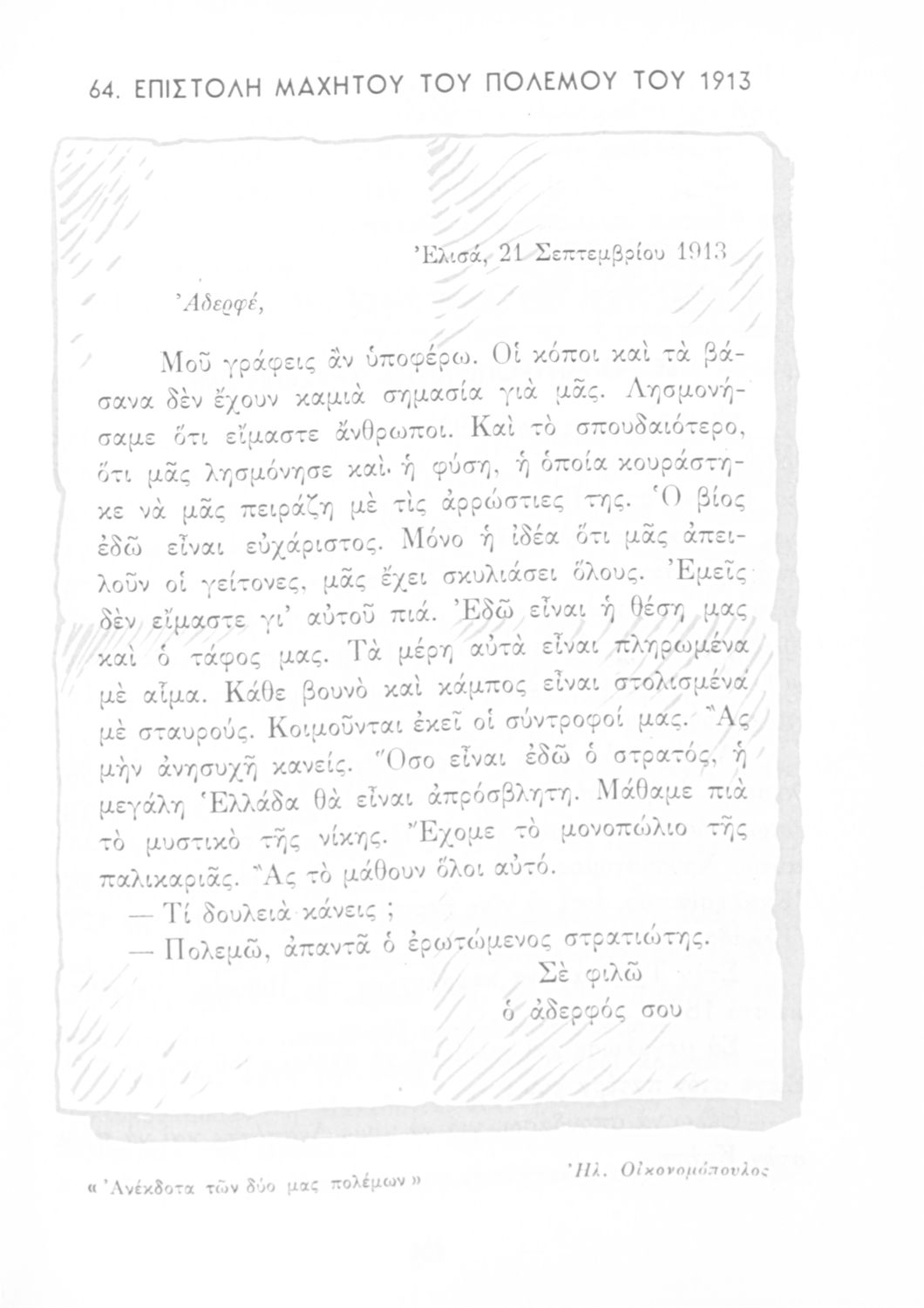 Αναγνωστικό ΣΤ΄ Δημοτικού που περιλαμβάνει πεζά και ποιήματα εμπνευσμένα από τη θρησκευτική, εθνική και κοινωνική ζωή καθώς και από τις ασχολίες των Ελλήνων.